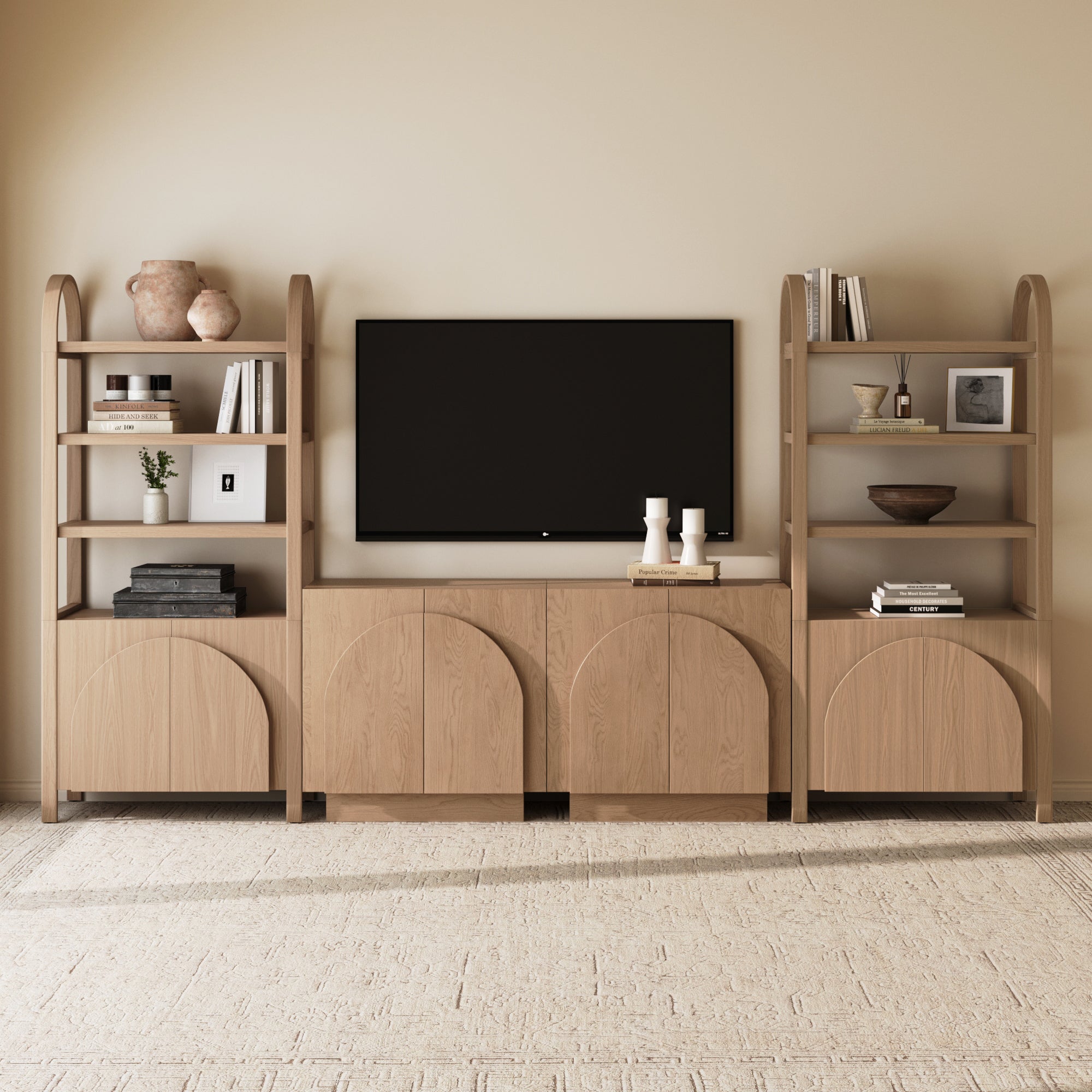 A modern living room features a large TV on the Nathan James Mid-Century Modern Arched Wood Entertainment Center (3 Cabinets), flanked by matching shelves. A glass coffee table with books and flowers sits on a patterned rug between two sofas.A modern living room showcases a wall-mounted TV above the Nathan James Mid-Century Modern Arched Wood Entertainment Center (3 Cabinets), with light wood cabinets, open shelves, books, vases, plants, a patterned rug, and a light gray armchair on wood floors.
