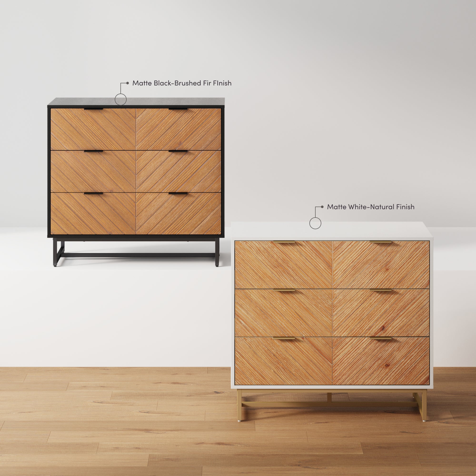 Introducing the Enloe Dresser‚Äö a perfect blend of modern style and practical design. Featuring a sleek powder-coated metal base and drawer pulls, along with beautifully crafted wood veneer drawer faces, the Enloe brings sophistication to any space. With three spacious drawers on strong metal slides, it offers smooth, reliable storage. You can even line up multiple units side by side for a seamless look. Plus, the included leveling floor protectors ensure stability. Each Enloe dresser is one-of-a-kind, with unique variations in color and texture that highlight the beauty of natural wood.