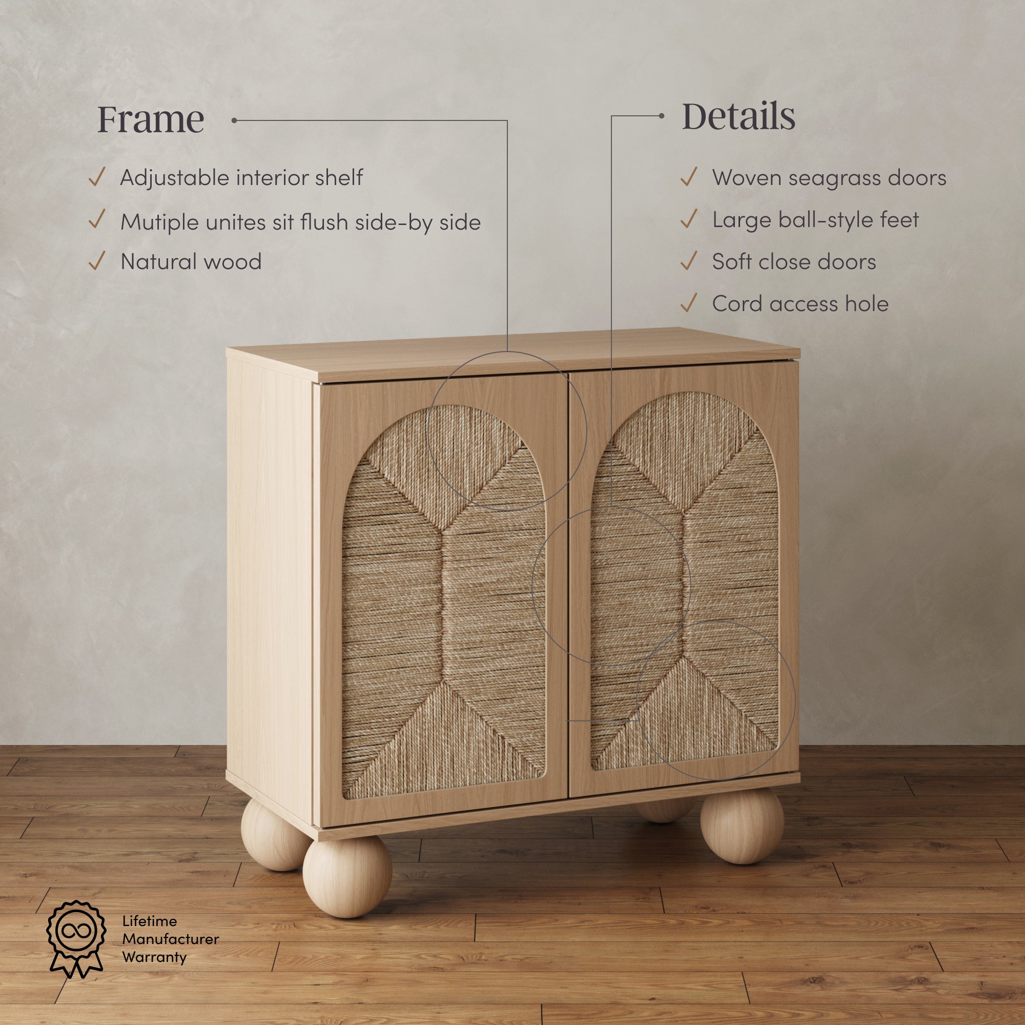 The Leah Storage Cabinet brings laid-back texture and natural warmth to your space with its raw oak finish and woven seagrass door inlays. Large ball-style feet add a playful touch, while an adjustable interior shelf offers flexible storage. You’ll find an adjustable shelf for flexible storage and a convenient cord access hole to keep things tidy. Designed to sit flush when styled in multiples, Leah works just as well on its own or as part of a larger setup. Unique wood and seagrass variations add organic character to this easygoing, bohemian-inspired piece.