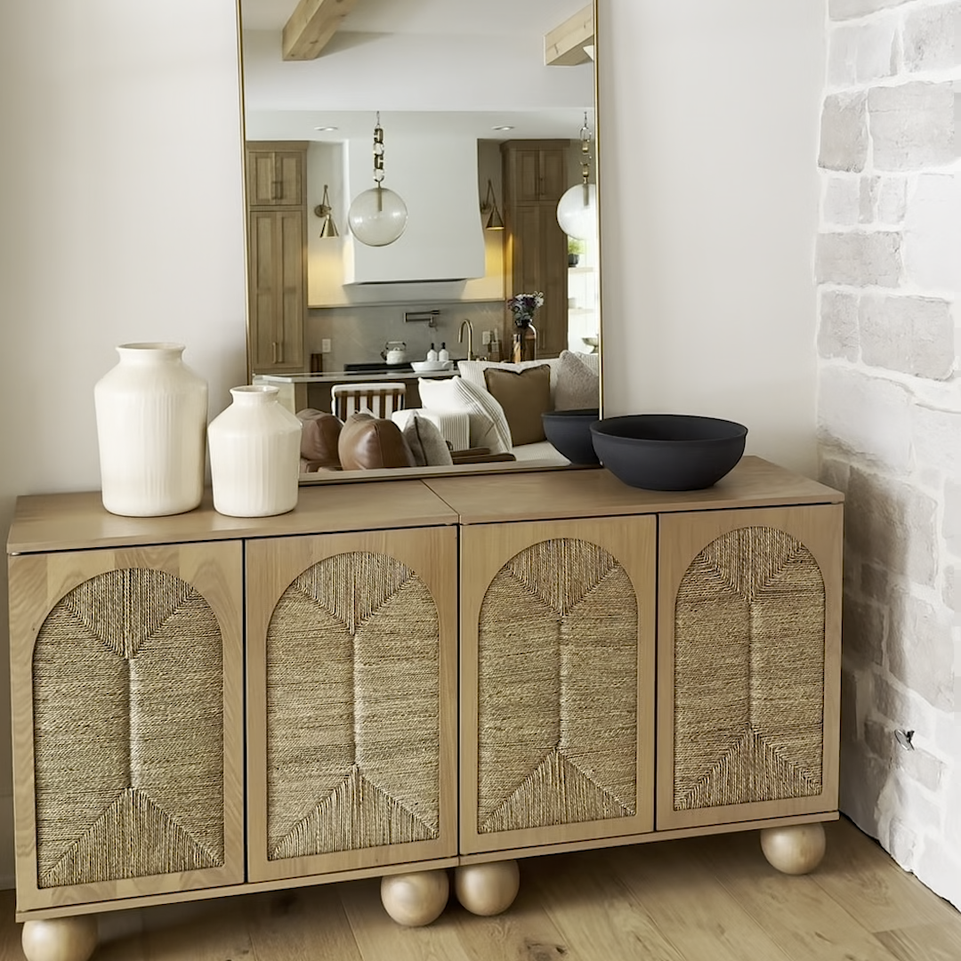 Create a relaxed, collected look with this set of Leah Storage Cabinets. Raw oak finishes and woven seagrass door inlays bring natural texture and bohemian charm to your space, while playful ball-style feet and adjustable shelves add both character and function. Designed to sit flush side by side, these cabinets work beautifully as a modular credenza, bar setup, or entryway storage solution. Variations in wood and seagrass ensure each piece feels thoughtfully crafted and uniquely yours.