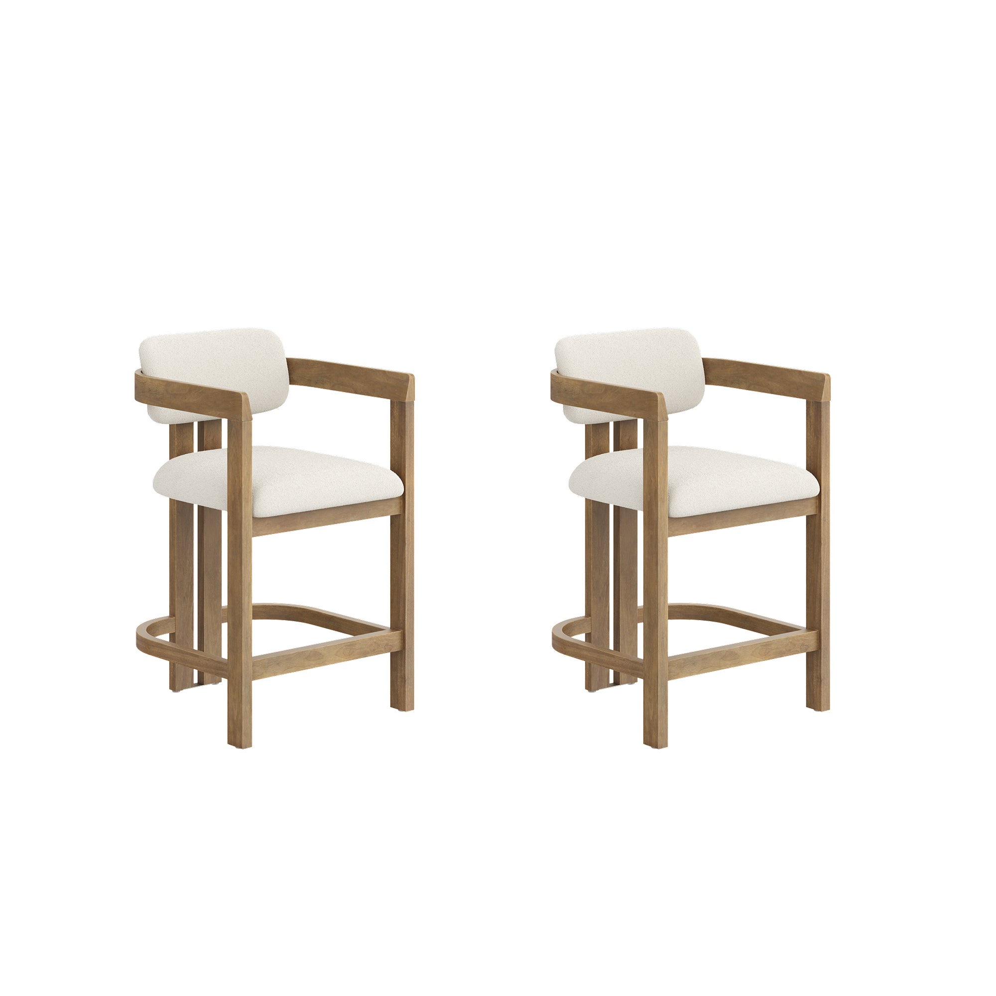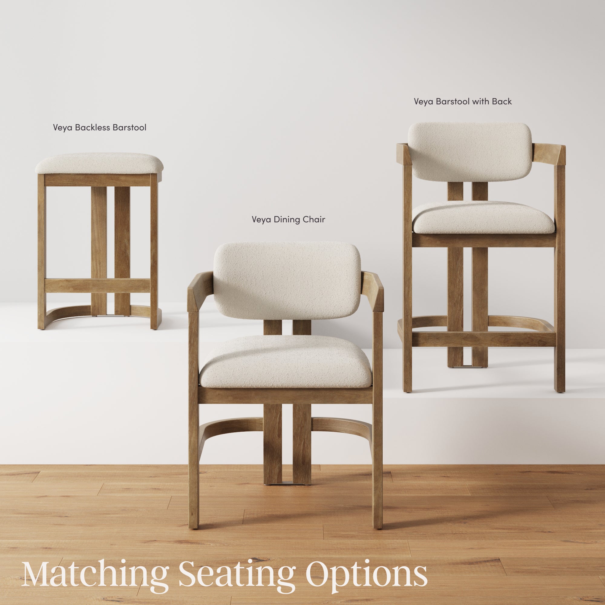 The Veya Barstool brings modern comfort and style to new heights. With a 25.2" seat height, it features a thick, upholstered seat and backrest in soft boucle fabric for relaxed support. Wraparound armrests and curved aprons add a sculptural touch, while the solid wood frame ensures lasting durability. Perfect for adding warmth and sophistication to your kitchen counter or bar area.