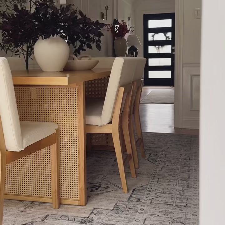 Introducing the Willow Dining Table – where style meets everyday living! This table comfortably seats six and features a sturdy solid wood base, ensuring it stands up to daily use. Each table is unique, with natural variations in color and texture that add a personal touch. The veneered tabletop and bohemian faux rattan leg inlays create a chic, stylish look. With its warm natural brown finish and easy assembly, the Willow Dining Table is the perfect addition to any dining space. Make every meal memorable with this beautiful and practical centerpiece!