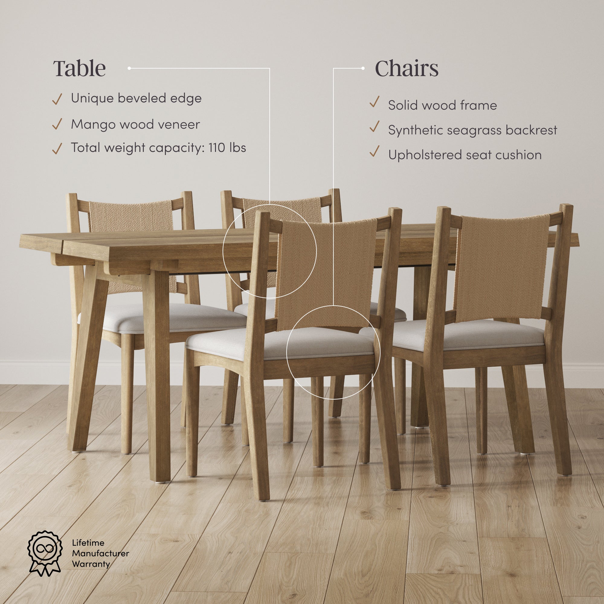 Effortless style meets everyday comfort with the Andy Dining Table and Elodia Dining Chairs set. Andy isn't just a table, it's a statement piece. With beveled edges, mango veneer finish, and sturdy wood legs, it comfortably seats six and showcases unique natural grain patterns, making every gathering one of a kind. Elodia adds relaxed elegance with its woven synthetic seagrass backrest and solid wood frame. Designed for comfort and durability, these chairs bring natural warmth and texture to any dining space. Together, Andy and Elodia create a timeless dining set that's stylish, durable, and perfect for any occasion, from casual meals to dinner parties.
