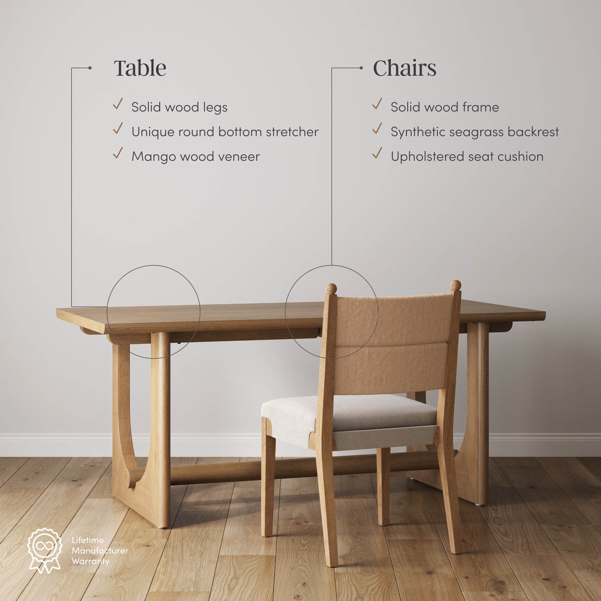 Gather in style around the Solace Dining Table, crafted to seat up to six with ease. Its solid wood U-shaped legs and unique round stretcher create a sturdy yet standout base, while the thick tabletop features smooth rounded edges for a softer, inviting feel. The dining table set includes 6 dining chairs, styled with synthetic seagrass backrest, natural flax upholstery, and solid wood frame. Whether it's a lively gathering or a quiet dinner, the Solace dining set makes every meal feel special.