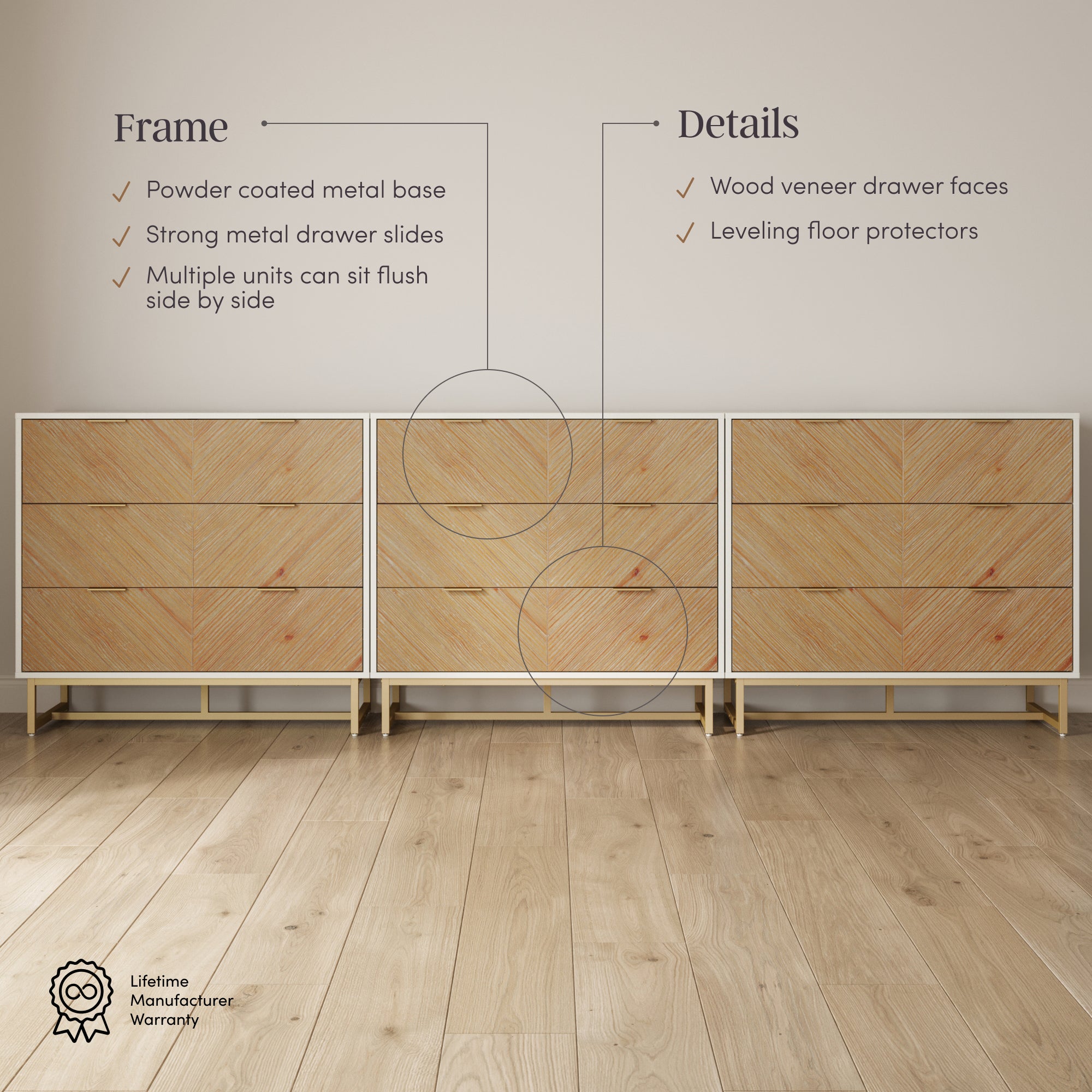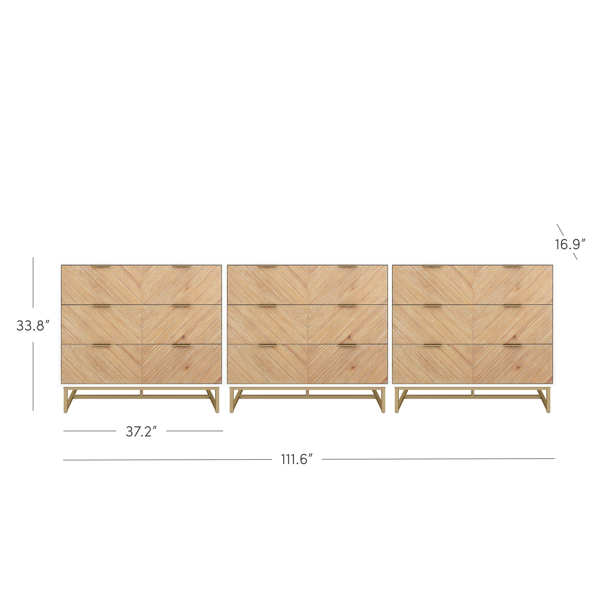 Meet the 3-pack Enloe dresser set! Featuring a sleek powder-coated metal base and drawer pulls, this dresser combines modern design with lasting durability. Its wood veneer drawer faces add a touch of natural beauty, with each piece uniquely showcasing variations in color and texture. The three spacious drawers glide smoothly on strong metal slides, while multiple units can sit flush side by side for a custom look.