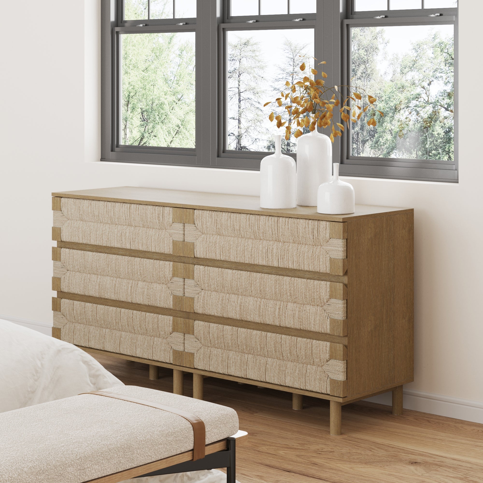 Introducing the Beacon Dresser! This sleek, modern piece features fully integrated handles for a smooth, minimalist look, while the 3 spacious drawers glide effortlessly on metal slides. With a wire-brushed wood veneer finish and woven seagrass drawer faces, it adds a touch of natural charm to any room. Solid wood legs give it sturdy support, and multiple units can be placed side-by-side for a clean, cohesive setup. Each dresser is one-of-a-kind, with unique variations in color and texture that make it all the more special.
