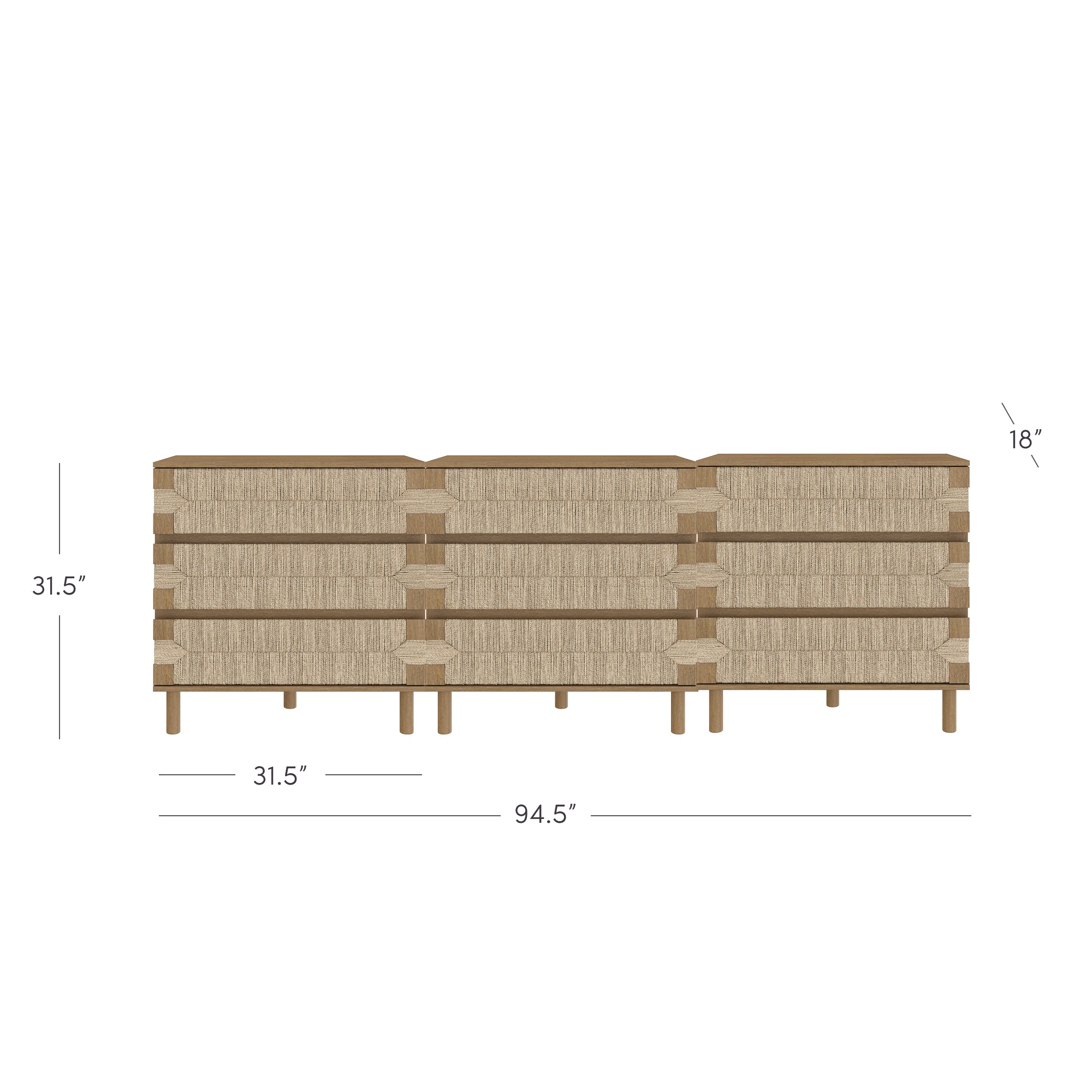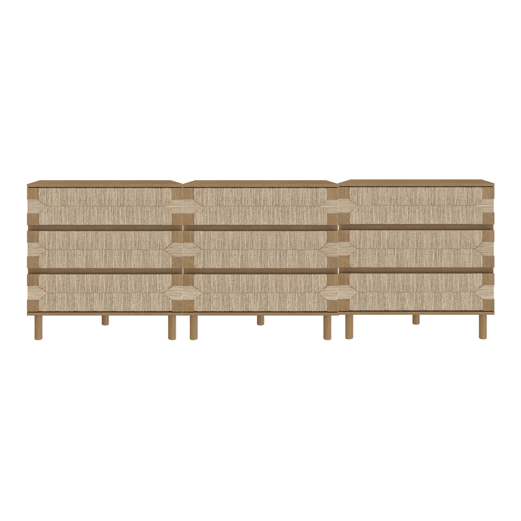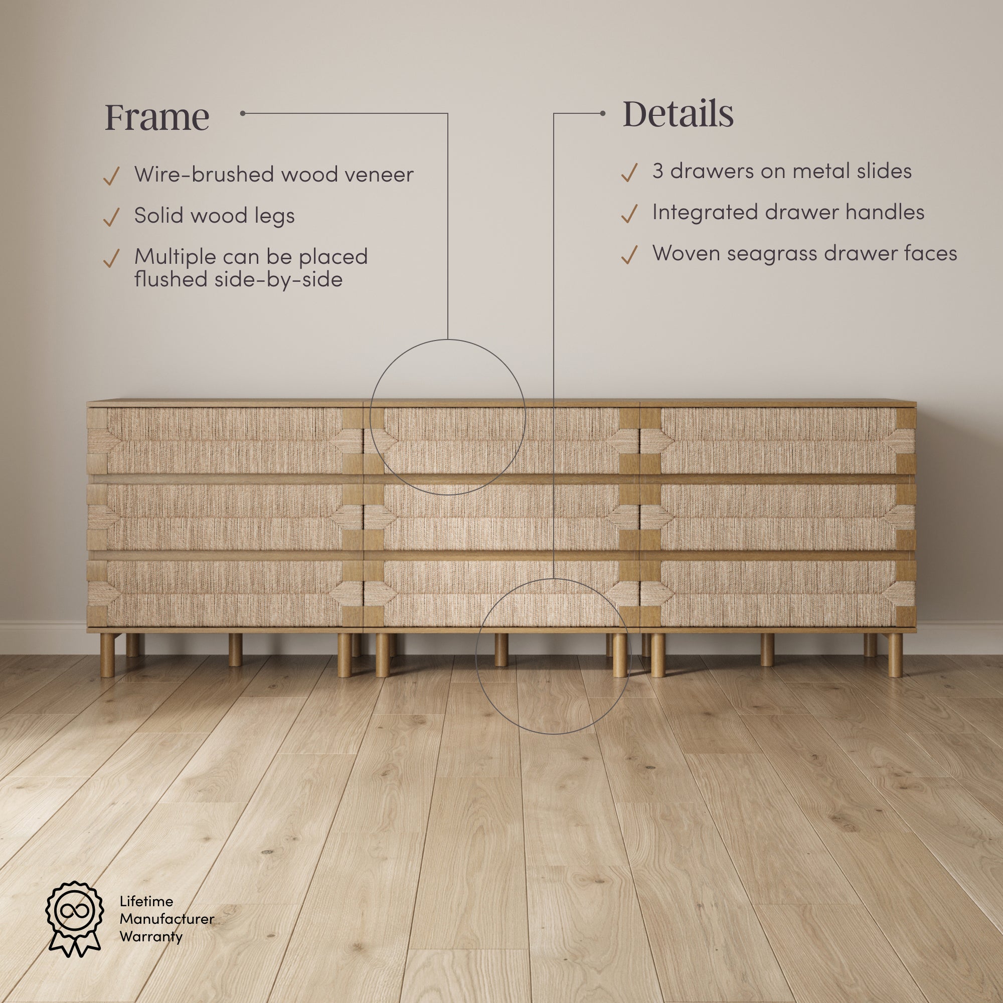 Meet the 3-Pack Beacon dresser set‚ featuring a wire-brushed wood veneer, natural seagrass panels, and beveled drawer faces for a sleek, integrated pull. With three drawers, a sturdy interlock system, and solid wood legs, multiple units sit flush side-by-side. Each piece is uniquely yours!