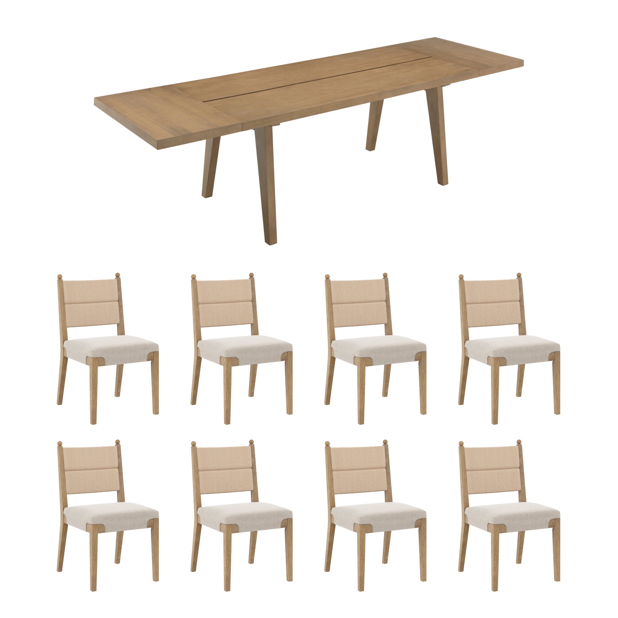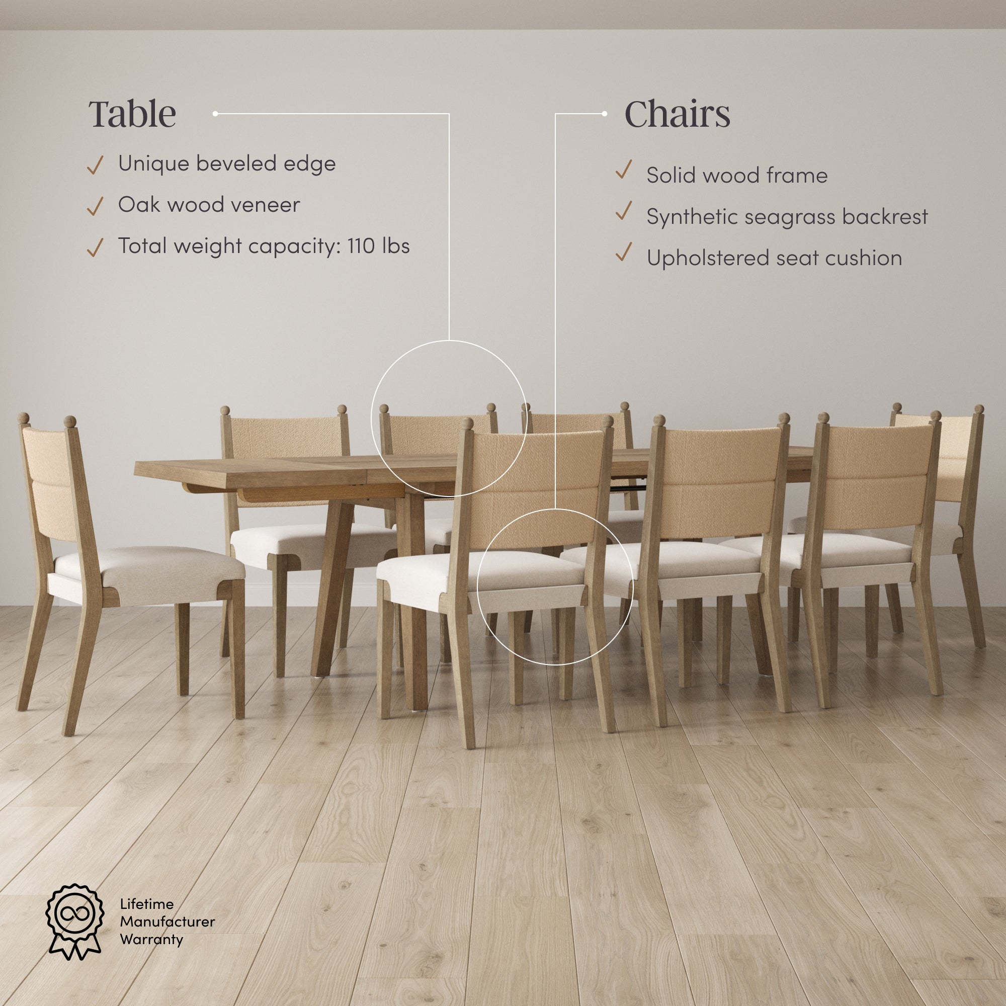 Bring effortless style and comfort to your dining space with the Andy Dining Table and Cove Dining Chairs Set of 8. This set includes the Andy Table with a matching extension leaf and eight Cove Chairs, perfect for everyday meals or special gatherings. Andy features beveled edges, mango veneer finish, and sturdy solid wood legs expanding to fit up to eight with the extension. Cove dining chairs blend breezy texture and comfort with woven synthetic seagrass backs, wraparound upholstered cushions, and solid wood tapered legs. Natural variations in the wood make every chair one of a kind. Together, Andy and Cove create a timeless dining set that's equal parts stylish, durable, and inviting.