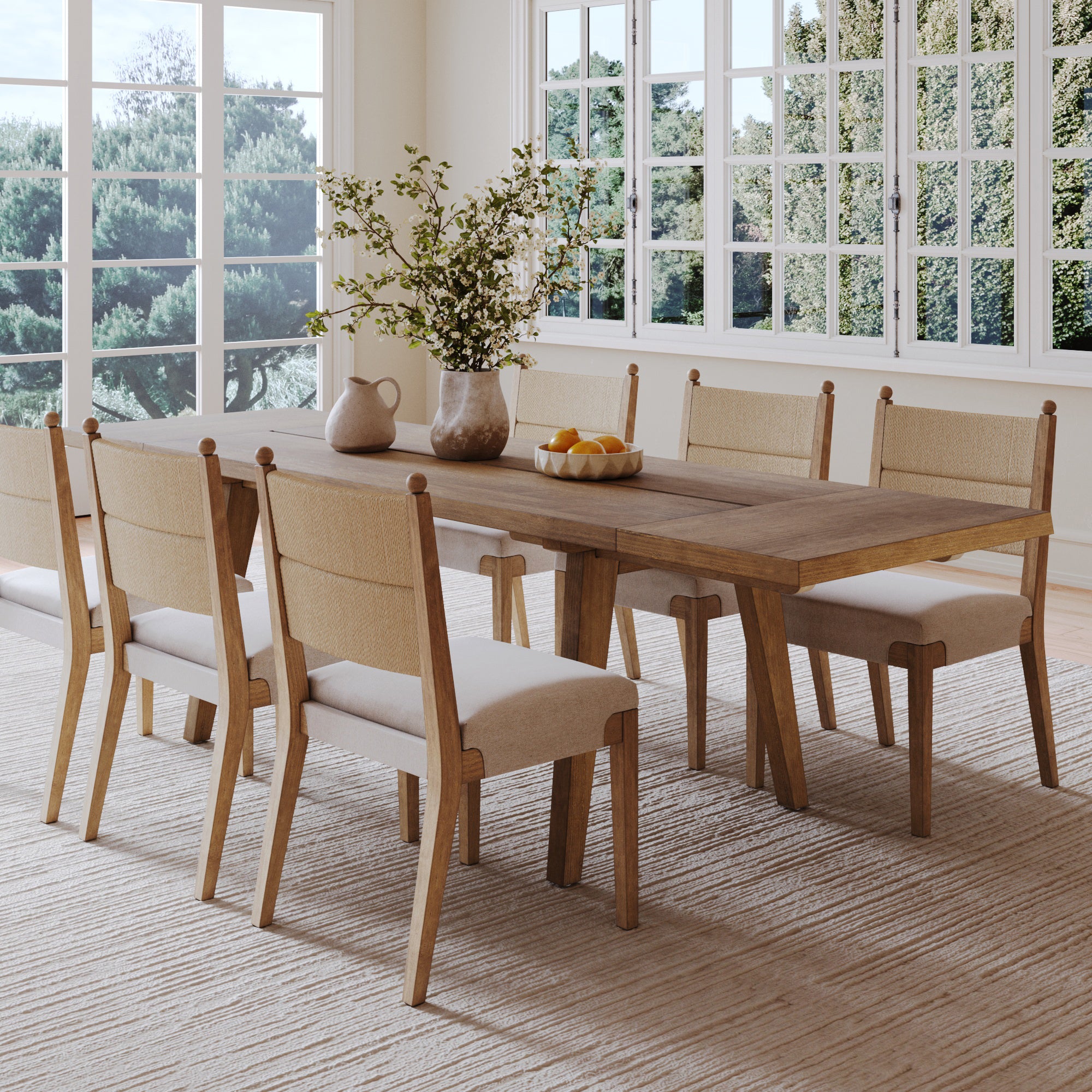 The Briggs dining set features a solid wood rectangular table and six Cove Boho Chairs. The light brown finish and tapered legs offer a sleek, contemporary look, while the veneered tabletop ensures lasting durability. Each chair boasts a solid wood frame, a woven synthetic seagrass backrest, and a flax-upholstered seat with extended wraparound details, combining comfort with textural charm. Perfect for cozy gatherings or everyday meals, this set comfortably seats six and celebrates the unique character of natural wood with subtle variations in color and grain.