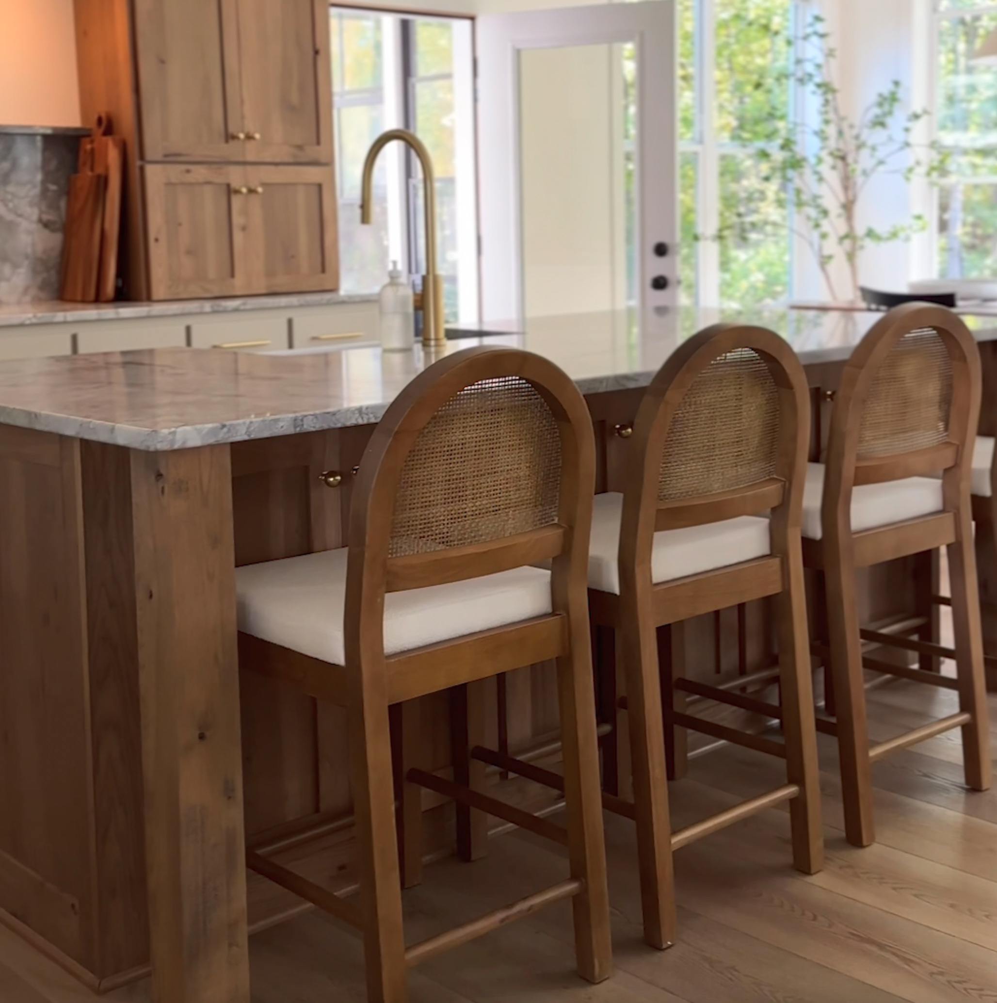 You don't need to be a Michelin star chef to have the kitchen of your dreams! This is where the Bailey bar stool comes in. It features a curved silhouette back made of woven natural rattan and is paired with a wire brushed light brown finish frame and bright boucle textured seat. Grab your favorite drink and sit for hours on the generously padded seat, while kicking your feet up on the durable foot rest. This mixed-material bar stool works in a variety of settings and is sure to bring warmth and comfort to your kitchen or dining room spaces.