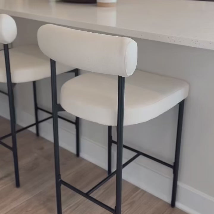 Meet Dahlia. We paired a comfortable cushioned seat with a cushioned back that's covered in a textured boucle linen weave for the ultimate bar stool experience. These wire frame stools were inspired by mid-century design and will provide an effortless touch to your kitchen or dining area. It has a slim profile to keep your space light and airy, while the matte black frame draws the eye to its durable footrest and made-to-last legs.