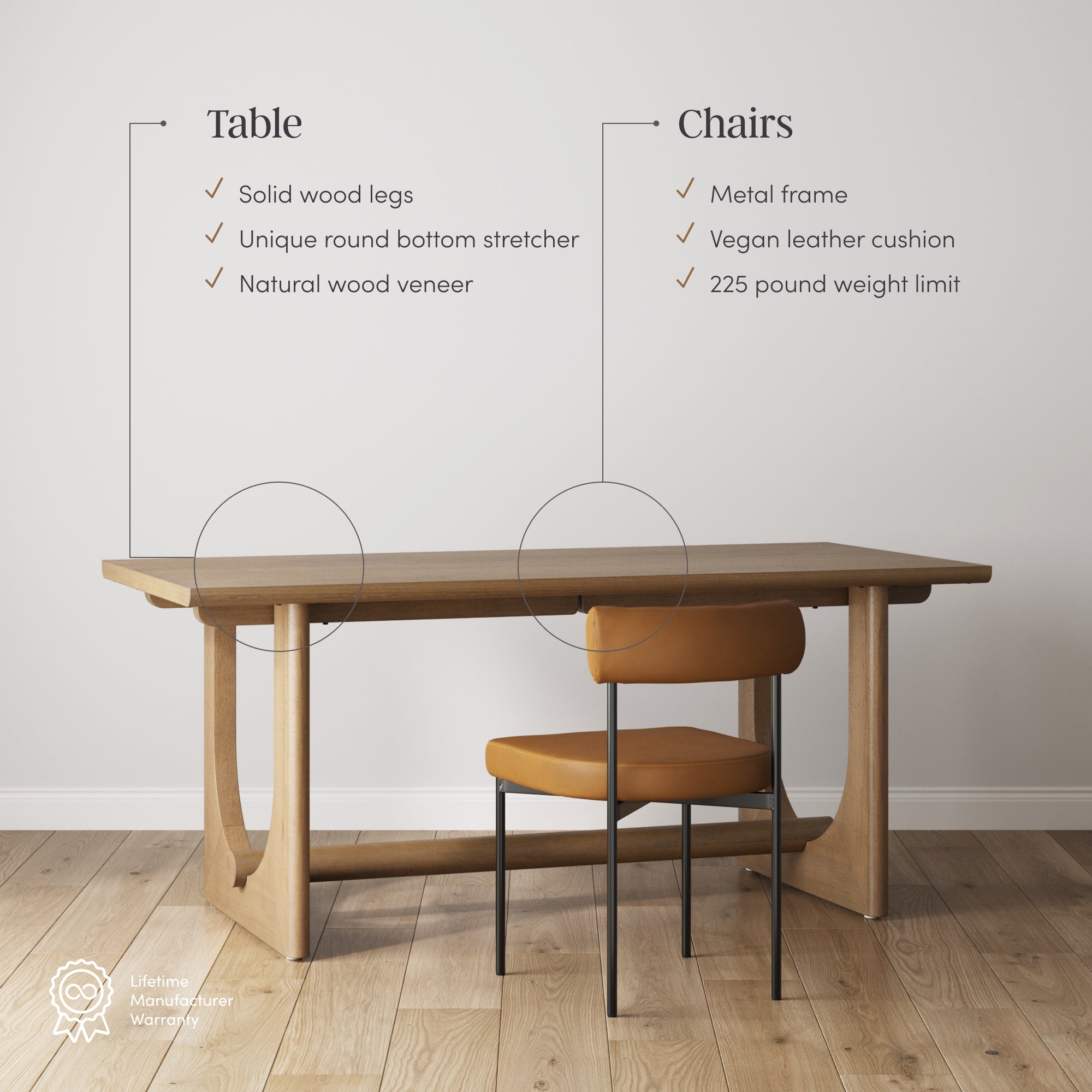 Gather in style around the Solace Dining Set—crafted to seat up to six with ease. Its solid wood U-shaped legs and unique round stretcher create a sturdy yet standout base, while the thick tabletop features smooth rounded edges for a softer, inviting feel. The dining set comes with 4 dining chairs with faux leather upholstery with sleek black metal legs - easy to clean and built for comfort for a modern touch to your dining space.