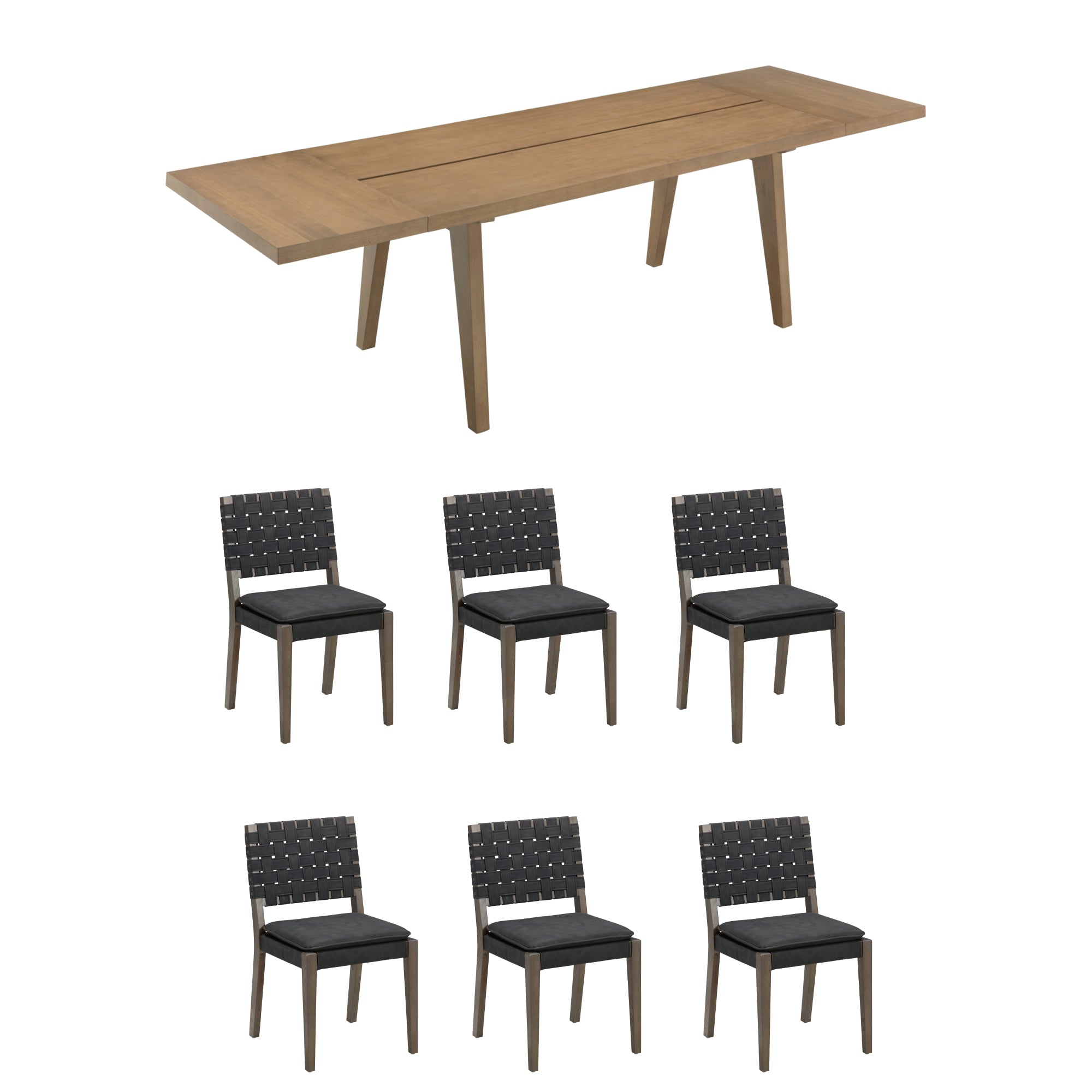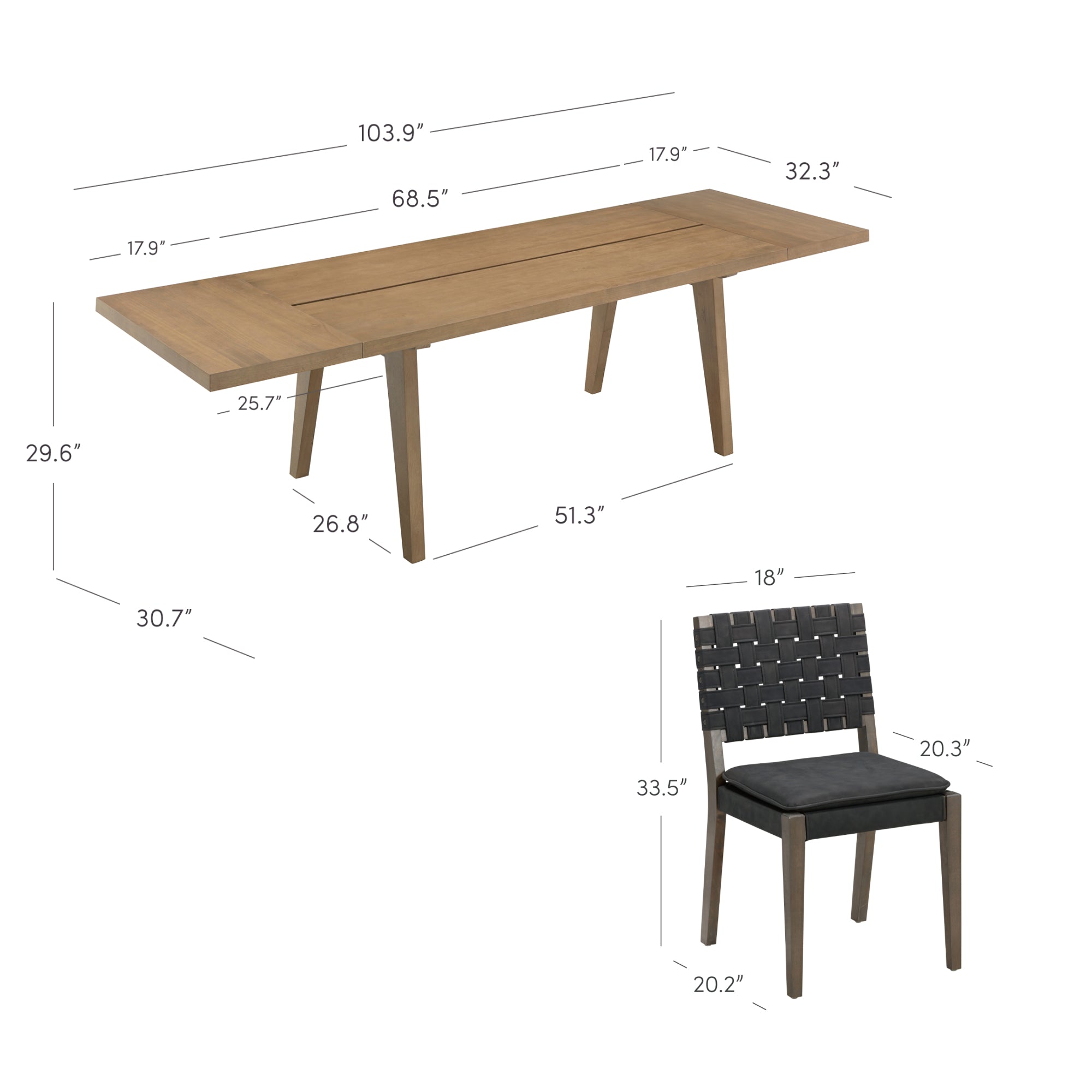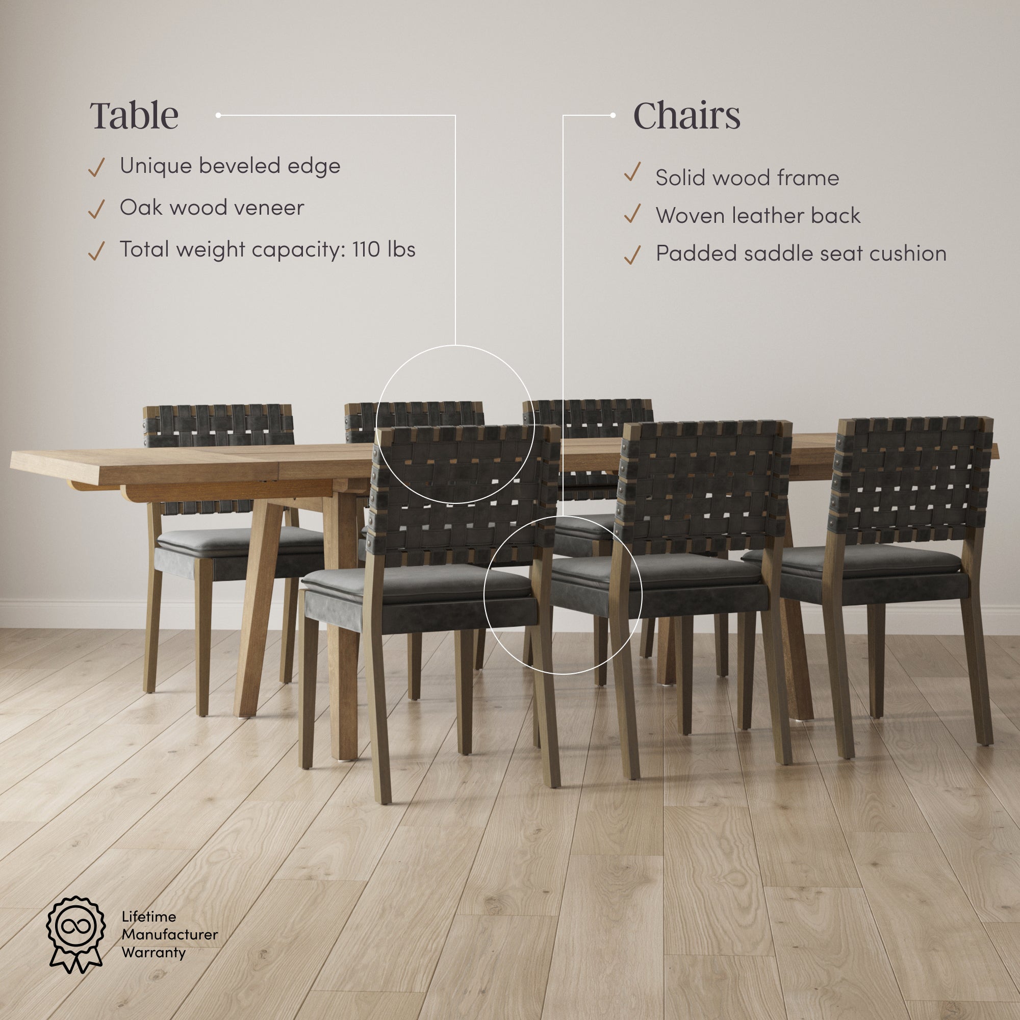 Bring effortless style and comfort to your dining space with the Andy Dining Table and Cohen Dining Chairs Set of 6. This set includes the Andy Table with a matching extension leaf and six Cohen Chairs, perfect for everyday meals or special gatherings. Andy features beveled edges, mango veneer finish, and sturdy solid wood legs comfortably seating six and expanding to fit up to eight with the extension. Cohen brings a modern, handcrafted touch with its padded saddle seat and hand-woven faux leather backrest. Designed at the perfect 19-inch seat height, it pairs beautifully with Andy for a relaxed dining experience.