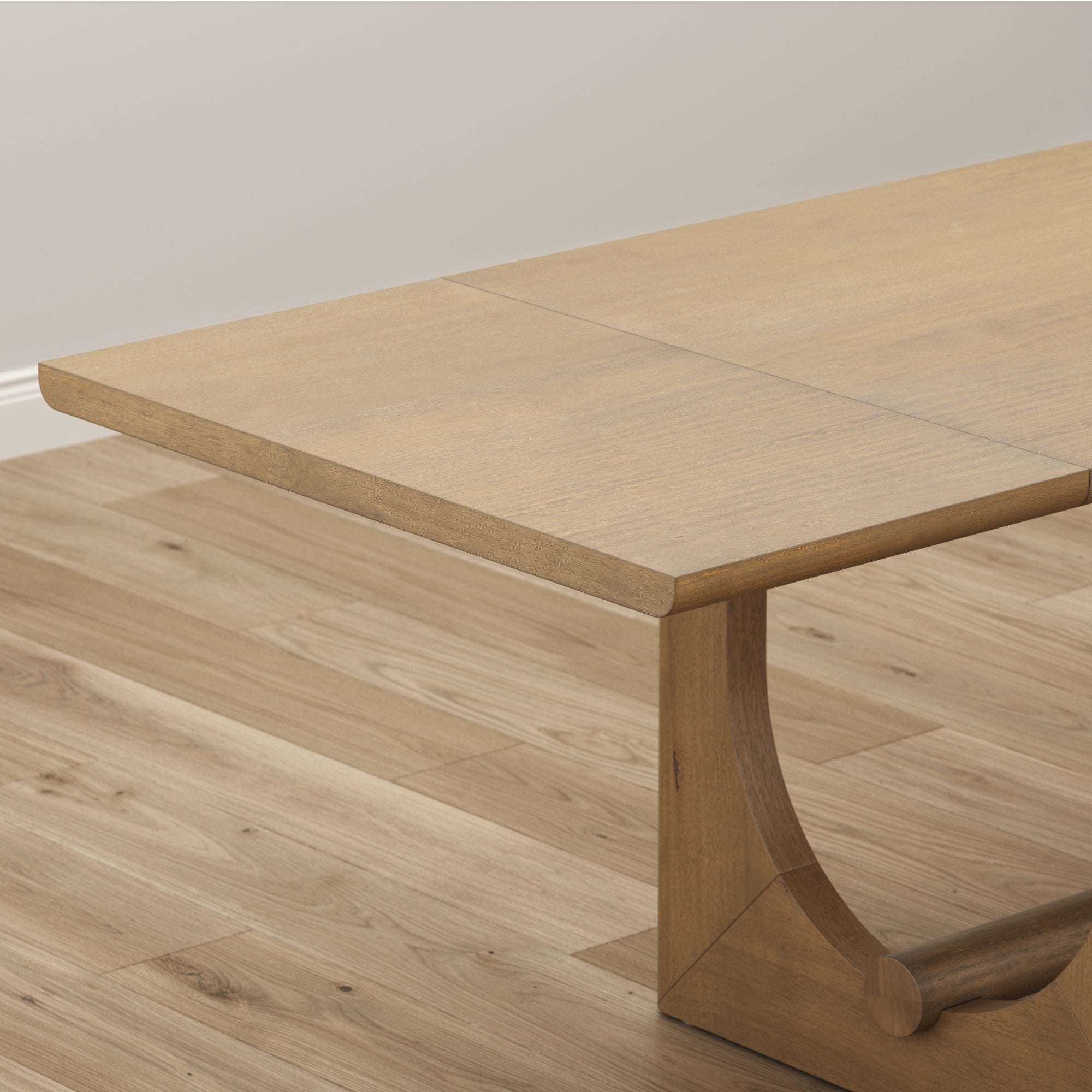 Gather in style around the Solace Dining Set‚ crafted to seat up to eight with ease. Its solid wood U-shaped legs and unique round stretcher create a sturdy yet standout base, while the thick tabletop features smooth rounded edges for a softer, inviting feel. The dining set comes with 4 dining chairs with faux leather upholstery with sleek black metal legs - easy to clean and built for comfort for a modern touch to your dining space.