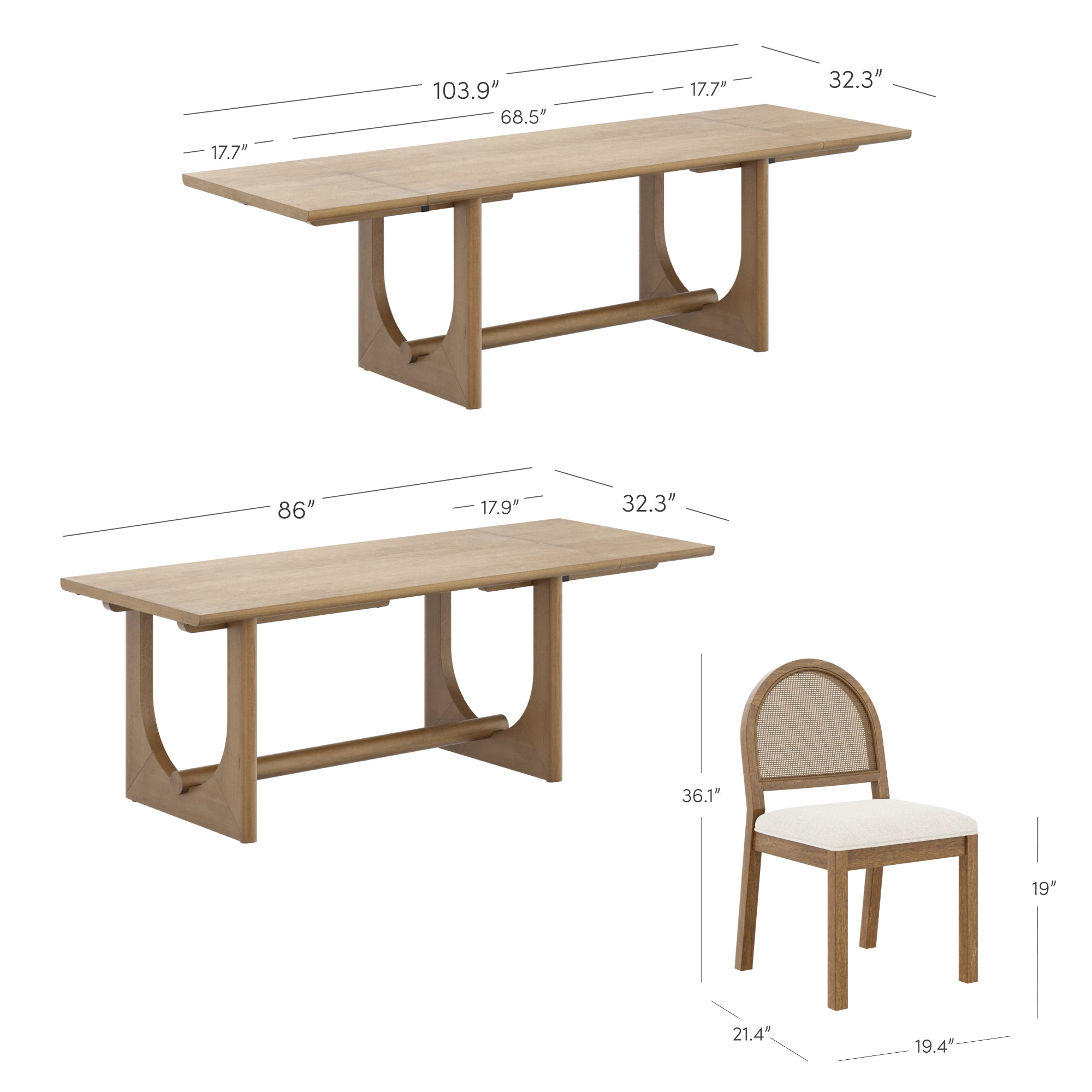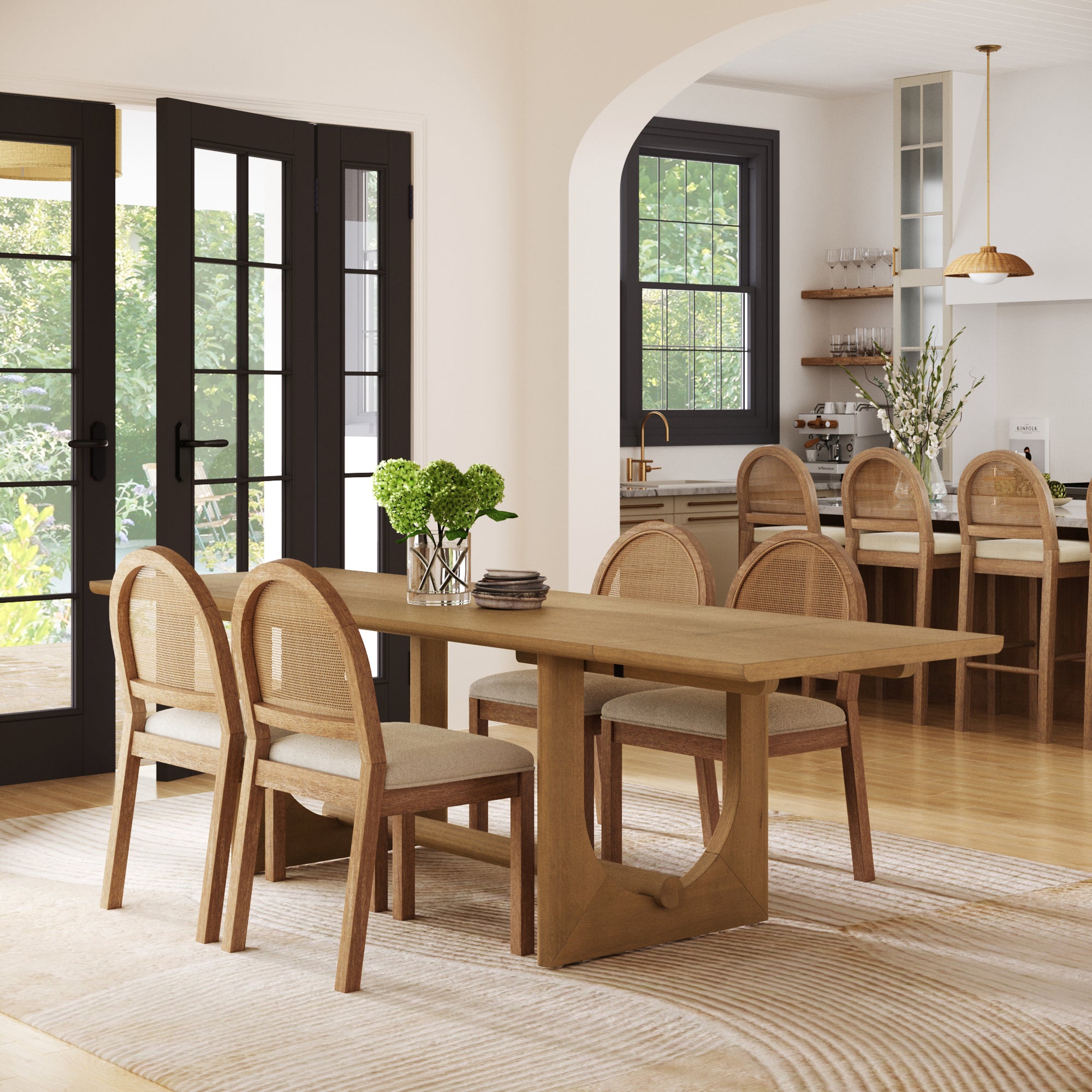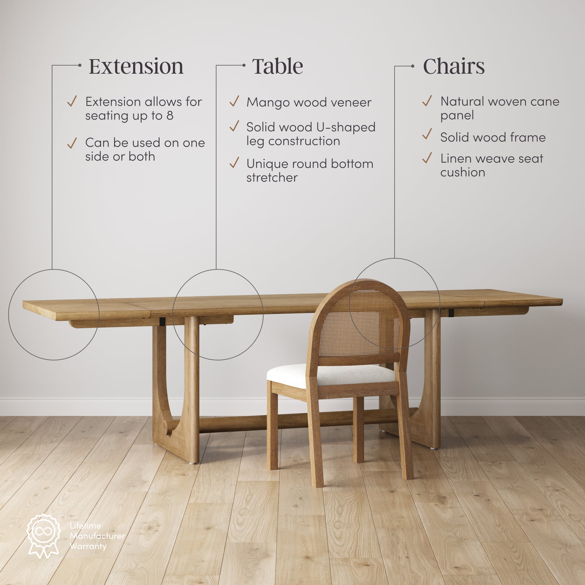 Gather in style around the Extended Solace Dining Table- crafted to seat up to 8 with ease. Its solid wood U-shaped legs and unique round stretcher create a sturdy yet standout base, while the thick tabletop features smooth rounded edges . The dining table set includes 4 dining chairs with woven natural cane, light brown finish frame paired, and a bright boucle textured seat. Whether it’s a lively gathering or a quiet dinner, the Solace dining set makes every meal feel special.