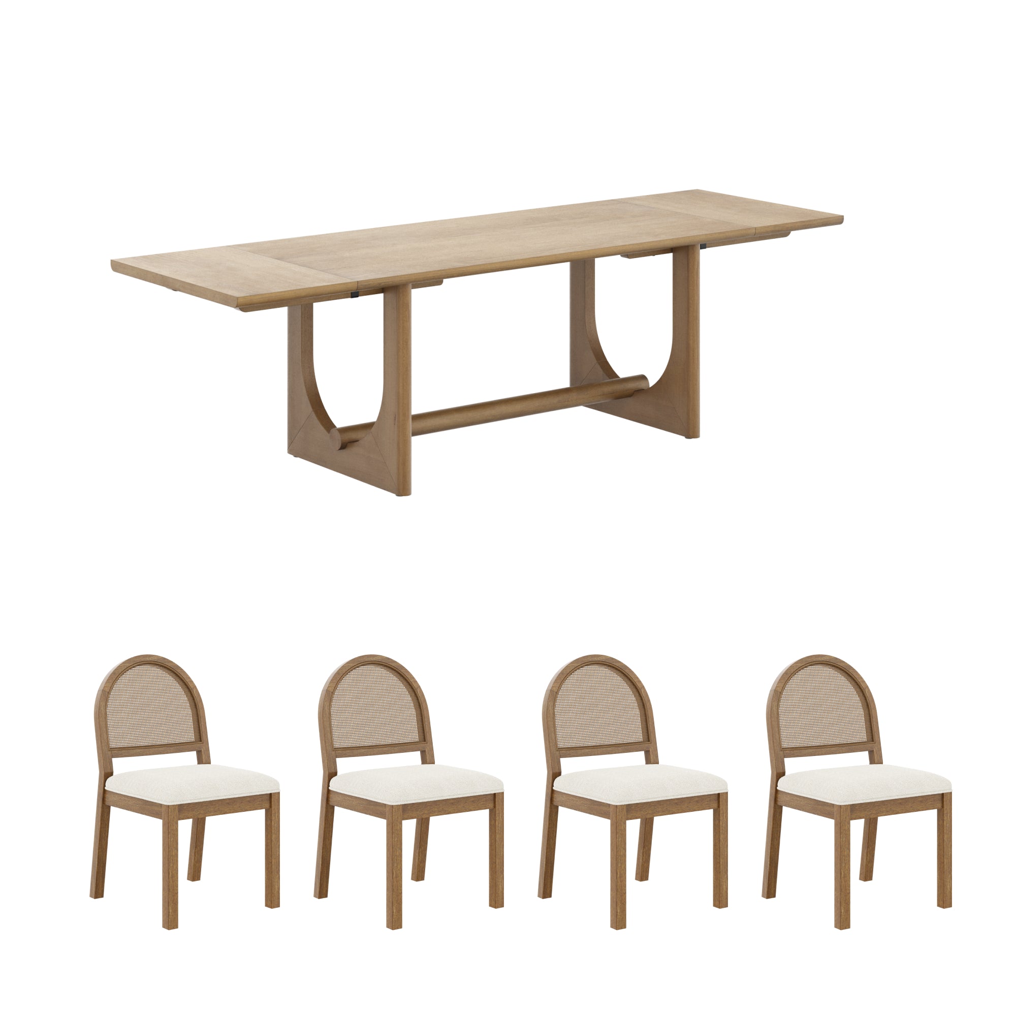 Gather in style around the Extended Solace Dining Table- crafted to seat up to 8 with ease. Its solid wood U-shaped legs and unique round stretcher create a sturdy yet standout base, while the thick tabletop features smooth rounded edges . The dining table set includes 4 dining chairs with woven natural cane, light brown finish frame paired, and a bright boucle textured seat. Whether It's a lively gathering or a quiet dinner, the Solace dining set makes every meal feel special.