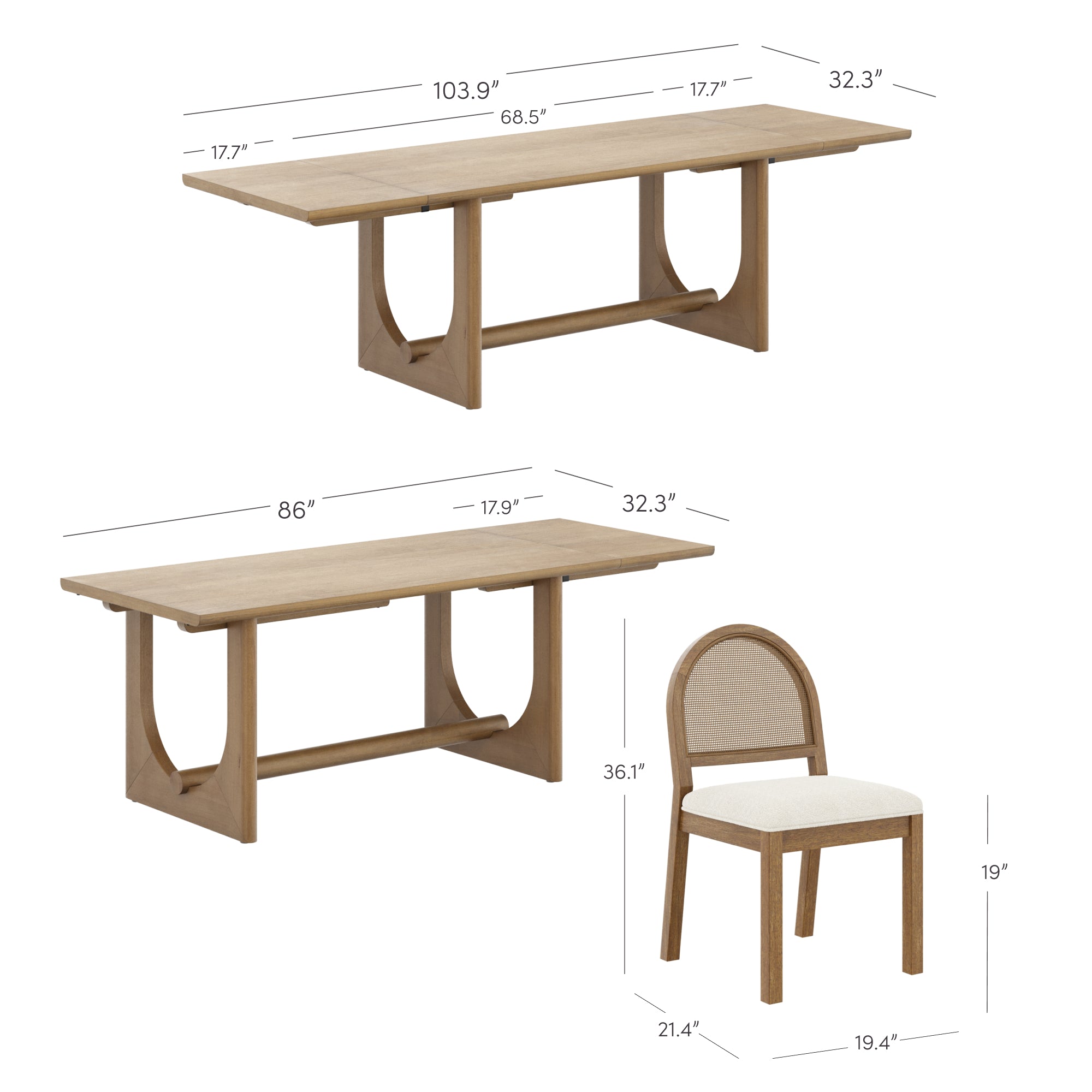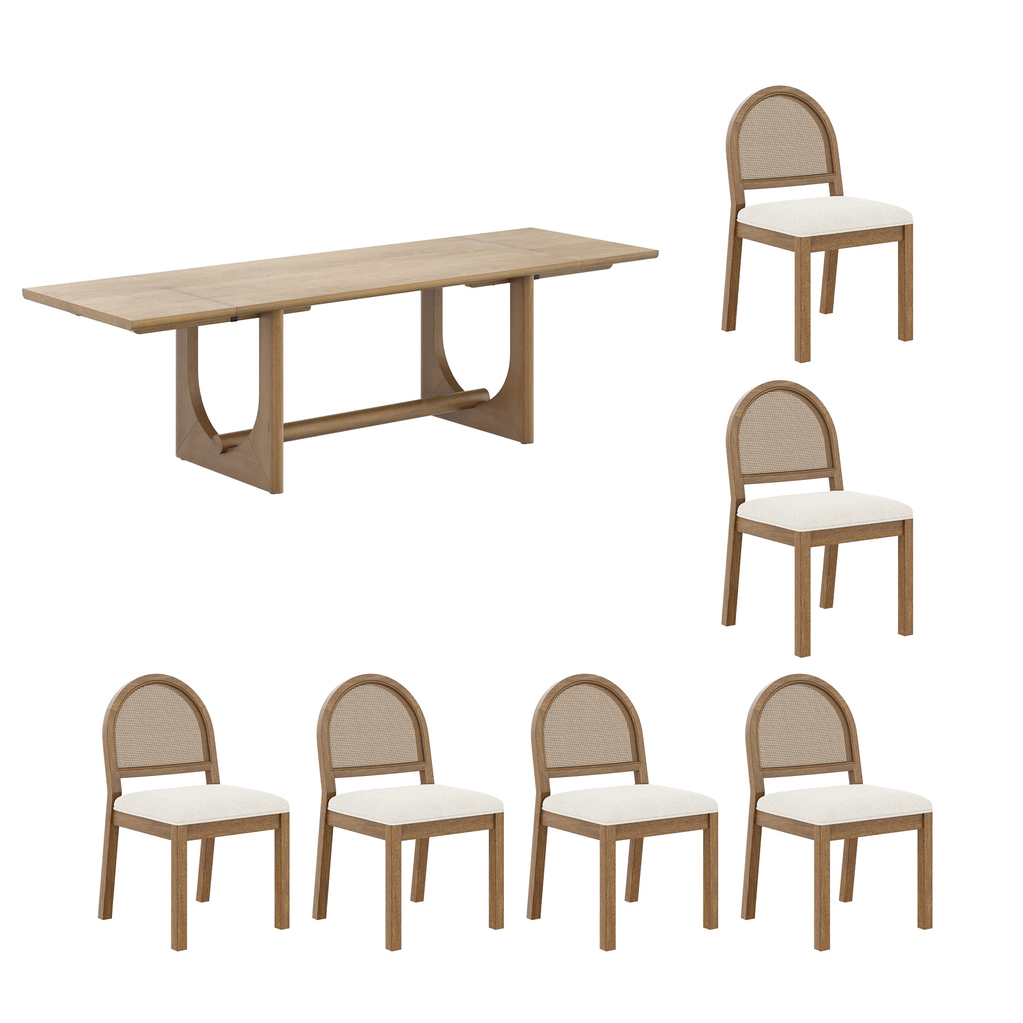 Gather in style around the Extended Solace Dining Table- crafted to seat up to 8 with ease. Its solid wood U-shaped legs and unique round stretcher create a sturdy yet standout base, while the thick tabletop features smooth rounded edges . The dining table set includes 6 dining chairs with woven natural cane, light brown finish frame paired, and a bright boucle textured seat. Whether It's a lively gathering or a quiet dinner, the Solace dining set makes every meal feel special.