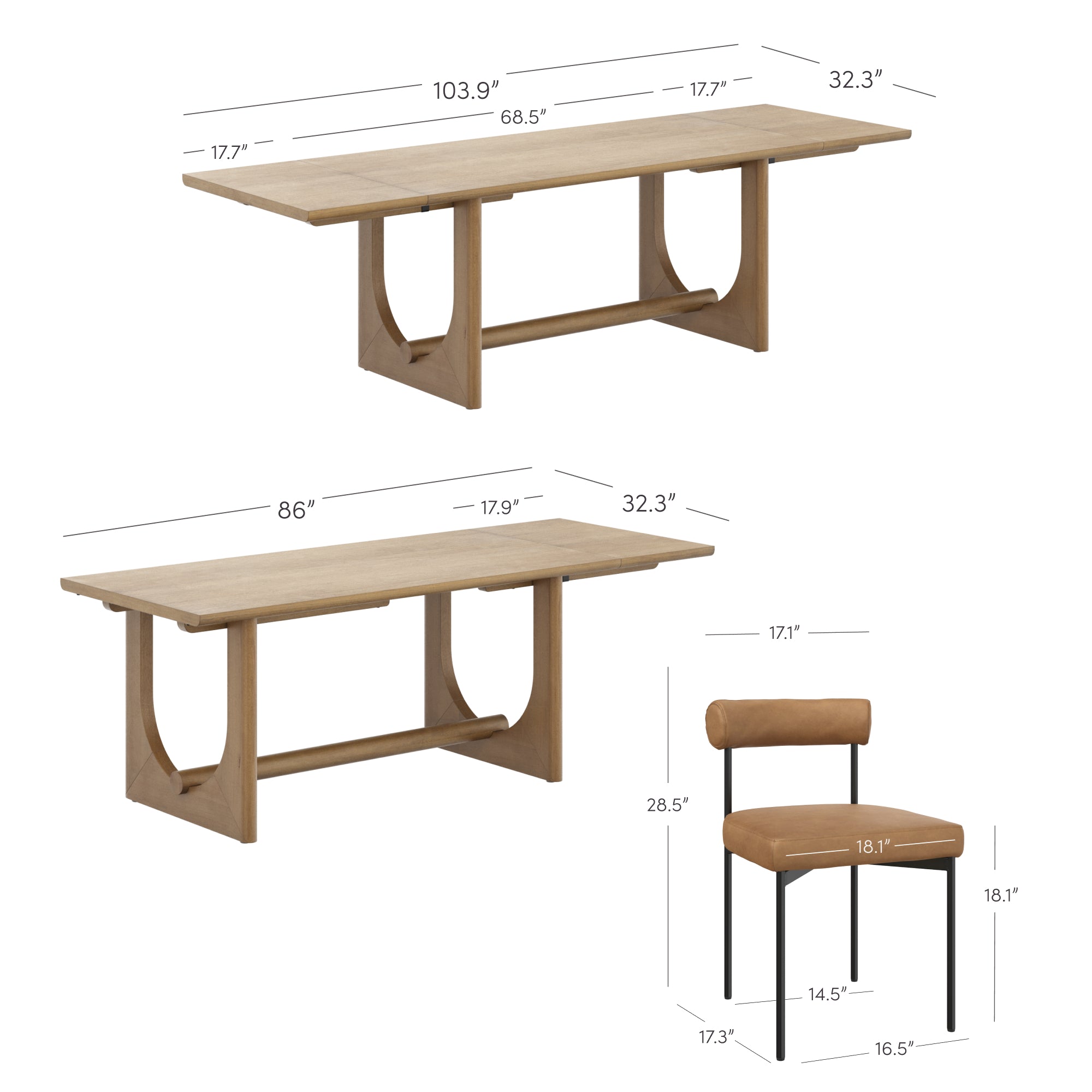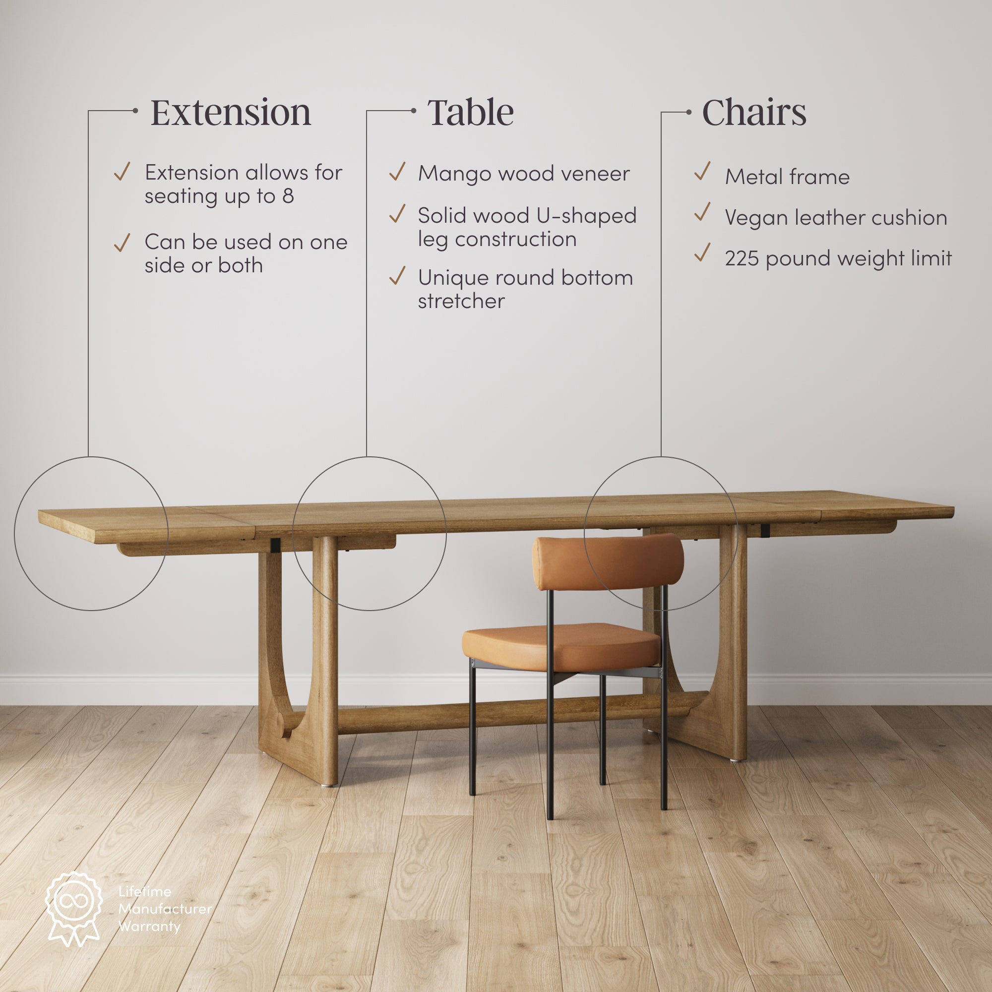 Gather in style around the Solace Dining Set‚ crafted to seat up to eight with ease. Its solid wood U-shaped legs and unique round stretcher create a sturdy yet standout base, while the thick tabletop features smooth rounded edges for a softer, inviting feel. The dining set comes with 8 dining chairs with faux leather upholstery with sleek black metal legs - easy to clean and built for comfort for a modern touch to your dining space.