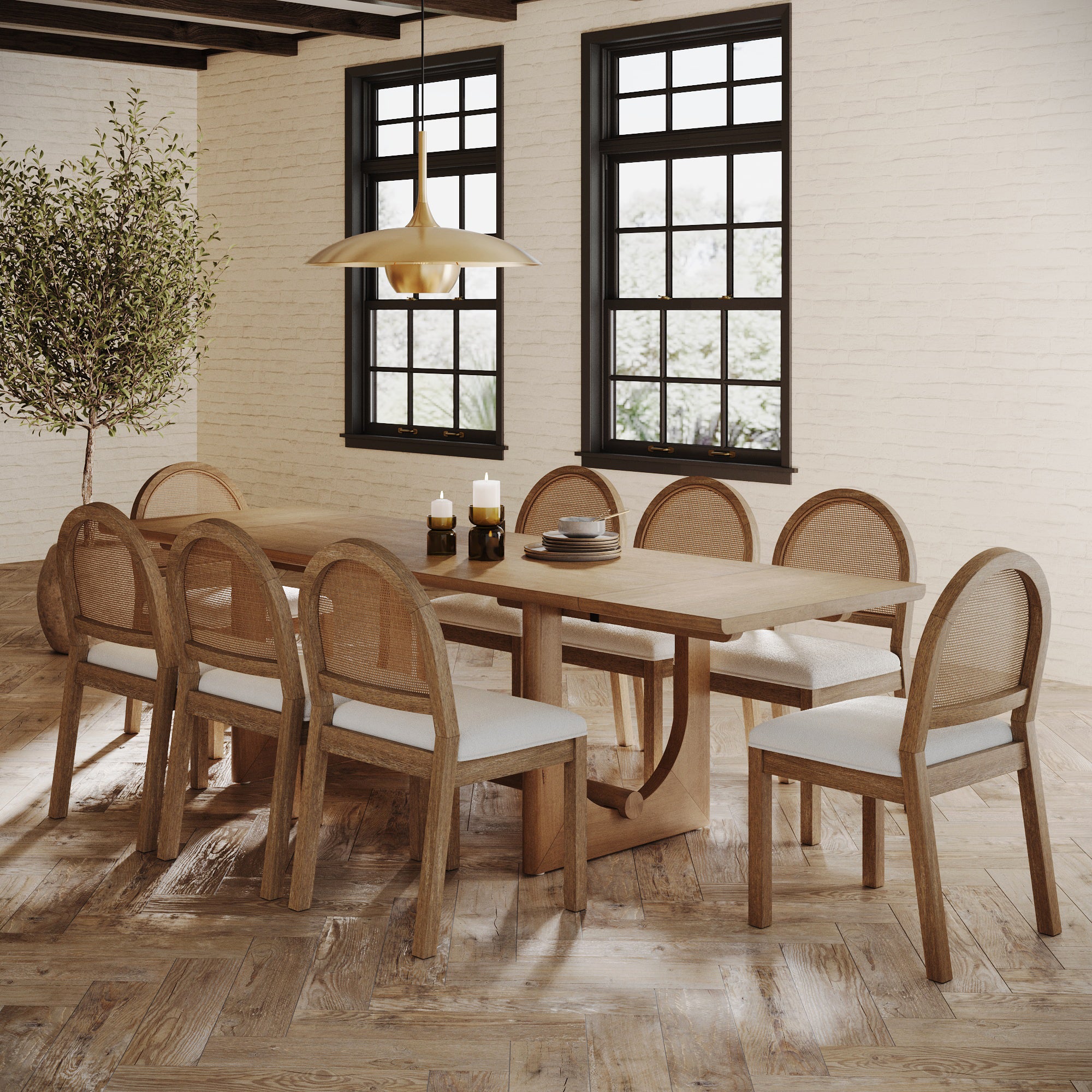 Gather in style around the Extended Solace Dining Table- crafted to seat up to 8 with ease. Its solid wood U-shaped legs and unique round stretcher create a sturdy yet standout base, while the thick tabletop features smooth rounded edges . The dining table set includes 4 dining chairs with woven natural cane, light brown finish frame paired, and a bright boucle textured seat. Whether It's a lively gathering or a quiet dinner, the Solace dining set makes every meal feel special.