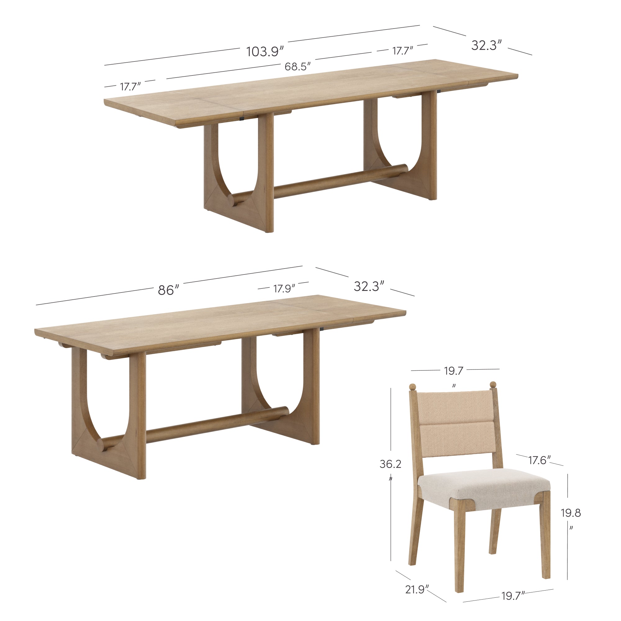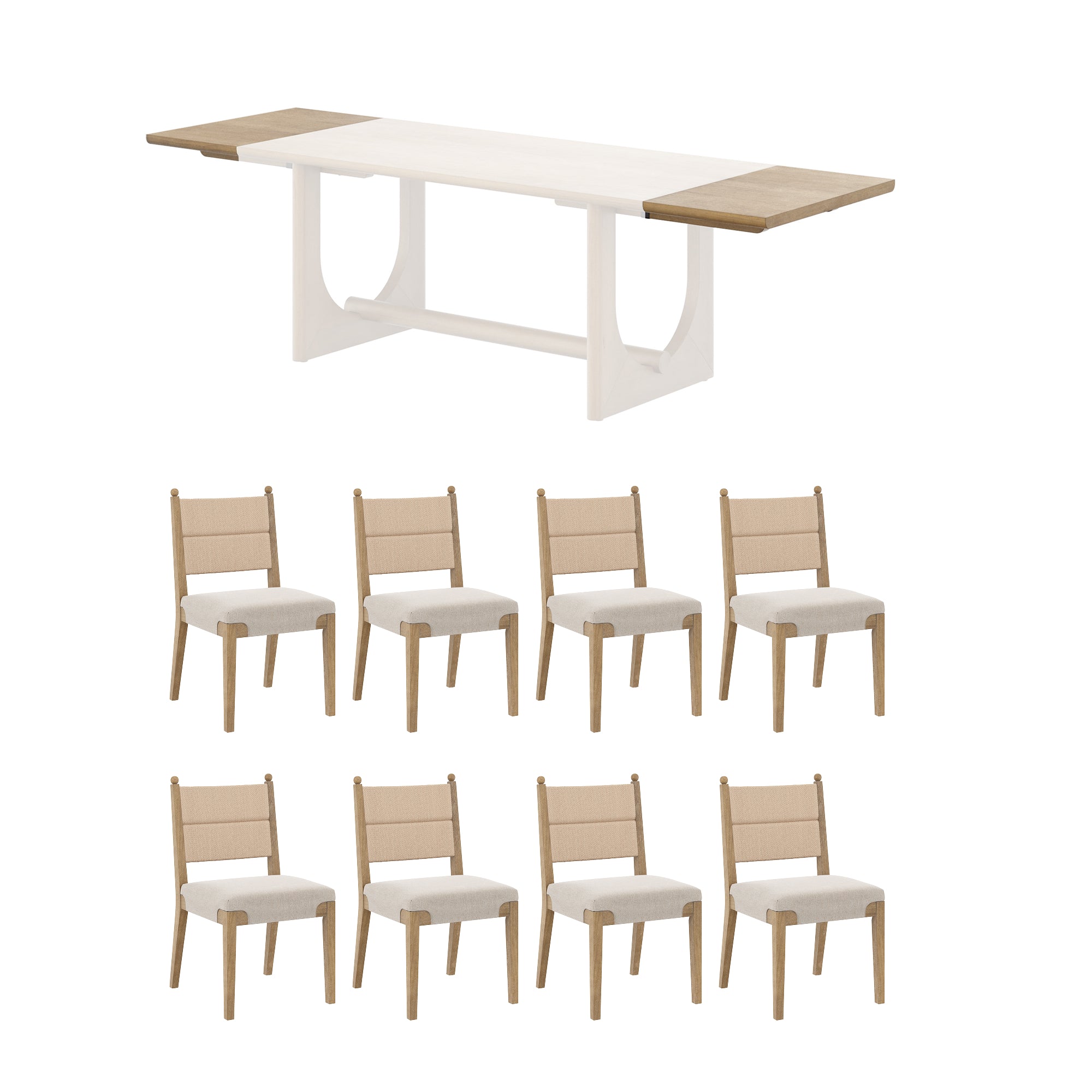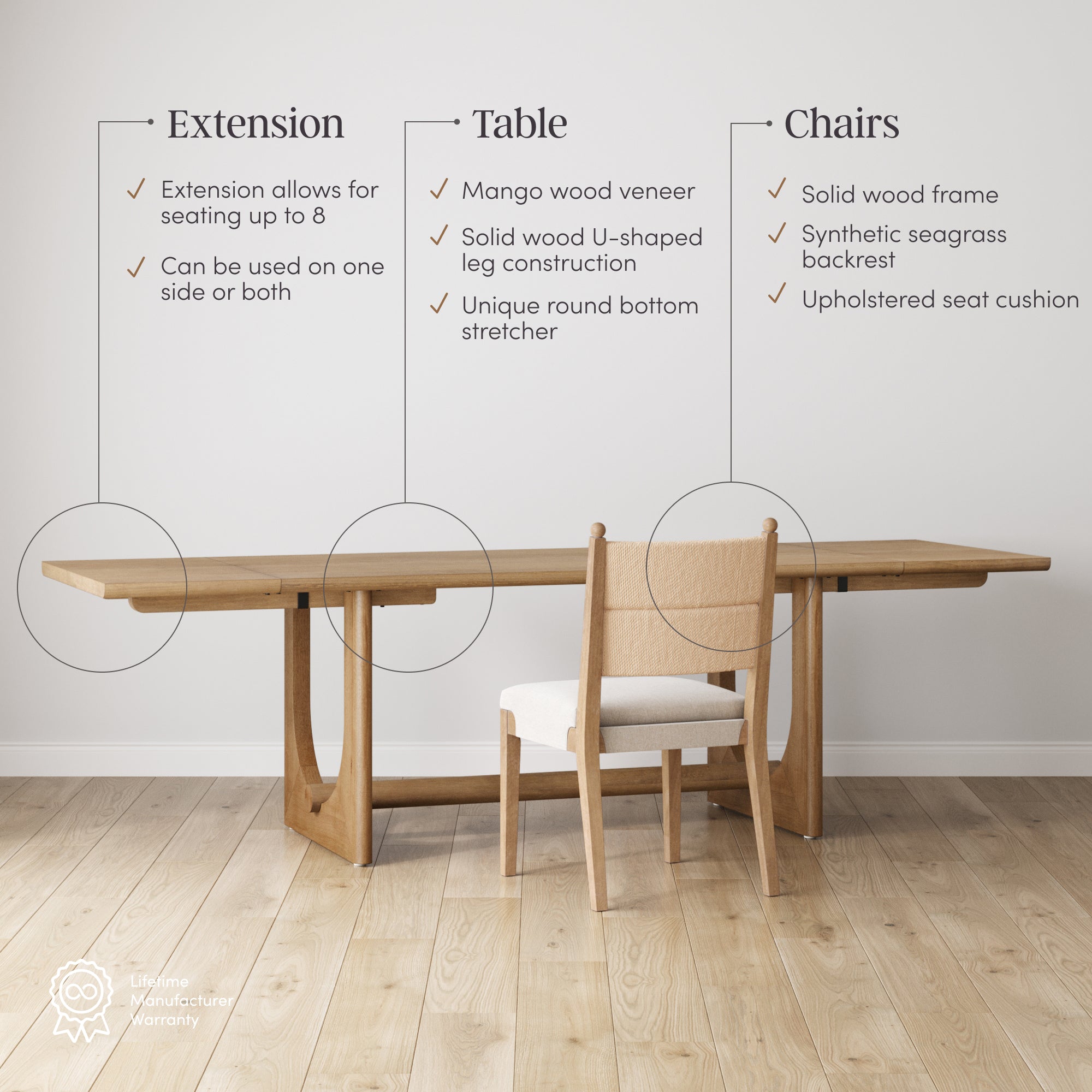 Gather in style around the Solace Dining Set—crafted to seat up to eight with ease. Its solid wood U-shaped legs and unique round stretcher create a sturdy yet standout base, while the thick tabletop features smooth rounded edges for a softer, inviting feel. The dining set comes with a set of 8 dining chairs with woven synthetic seagrass backrest and wraparound upholstered cushion offer breezy style and lasting comfort.