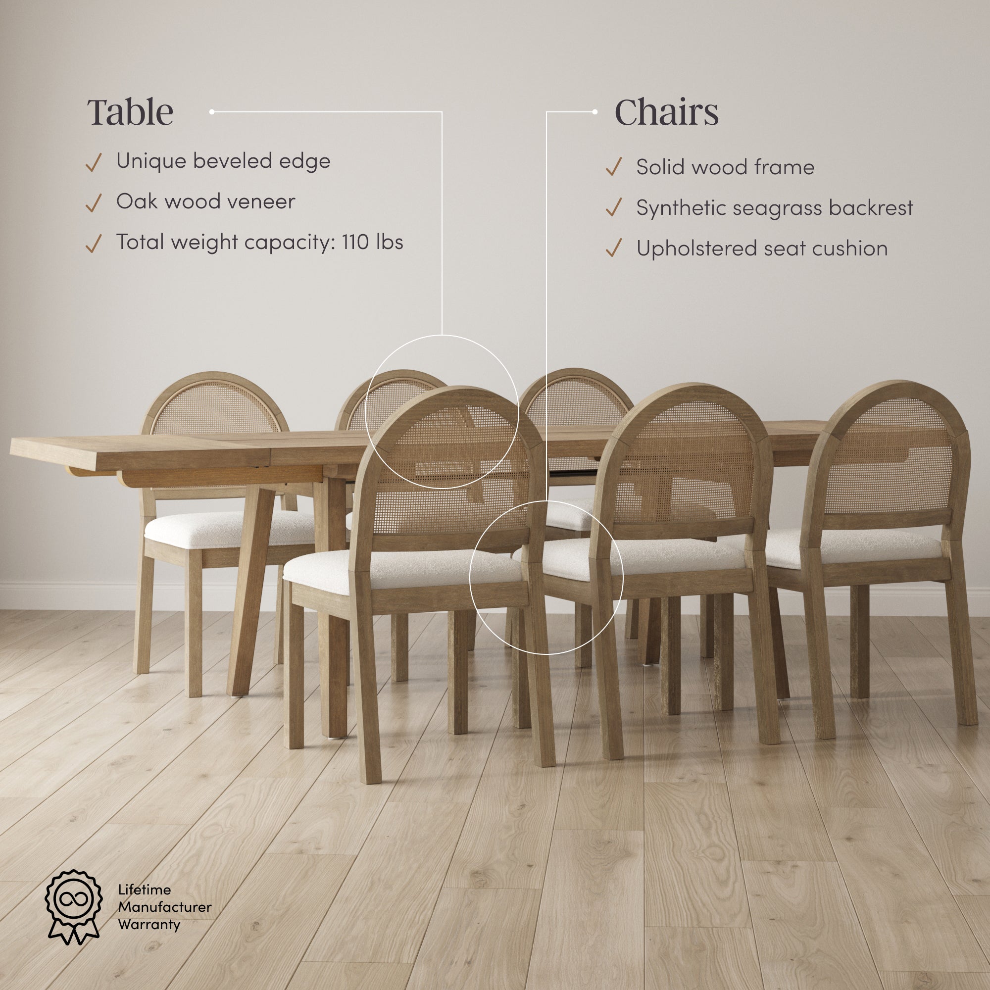 Bring effortless style and comfort to your dining space with the Andy Dining Table and Bailey Dining Chairs Set of 6. This set includes the Andy Table with a matching extension leaf and four Bailey Chairs, perfect for everyday meals or special gatherings. Andy features beveled edges, mango veneer finish, and sturdy solid wood legs—comfortably seating six and expanding to fit up to eight with the extension. Bailey adds modern warmth with its curved cane back, wire-brushed light brown frame, and plush boucle seat that invites you to linger in comfort. Together, Andy and Bailey create a dining set that’s stylish, versatile, and built for gatherings big or small.
