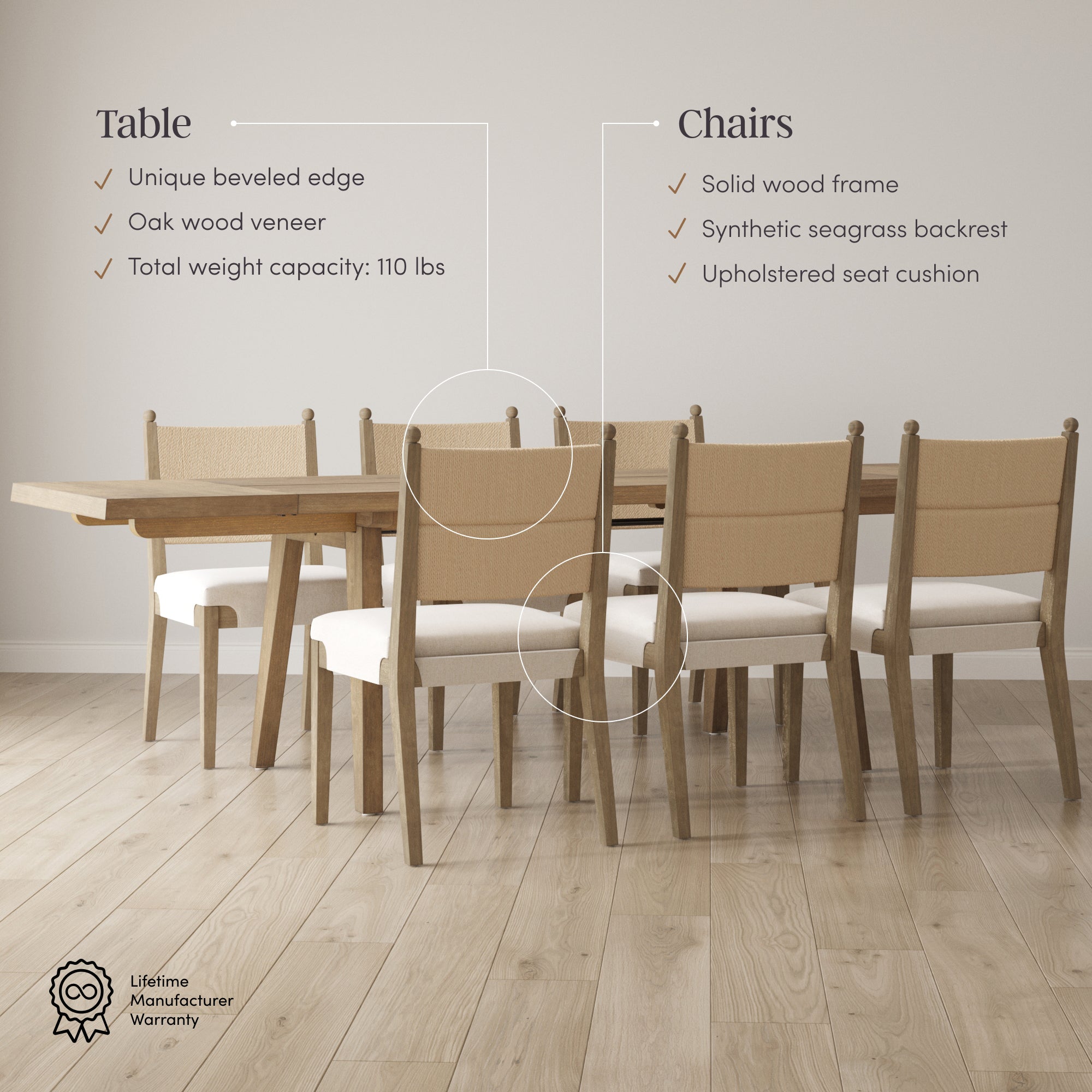 - Seats up to 8 (with additional extension leafs)