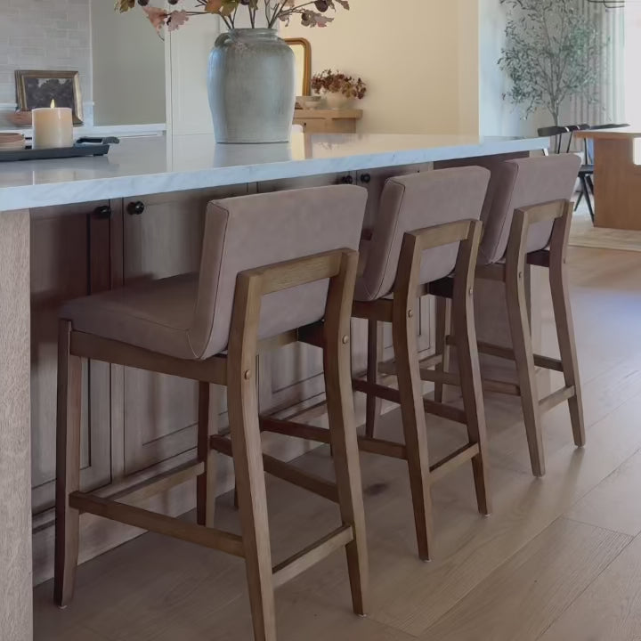 Kick your feet up in style with our set of 3 Gracie bar stools. With an exposed wood back and sleek modern design, Gracie is sure to stun. These bar stools combine a wire brushed light brown wood finish and a light brown faux leather cushion for ultimate comfort and style. They boast a modern silhouette with tapered legs and a curved seat, making these bar stools the star of any kitchen. So grab your drink of choice and sit back in full comfort on these made-to-last bar stools.