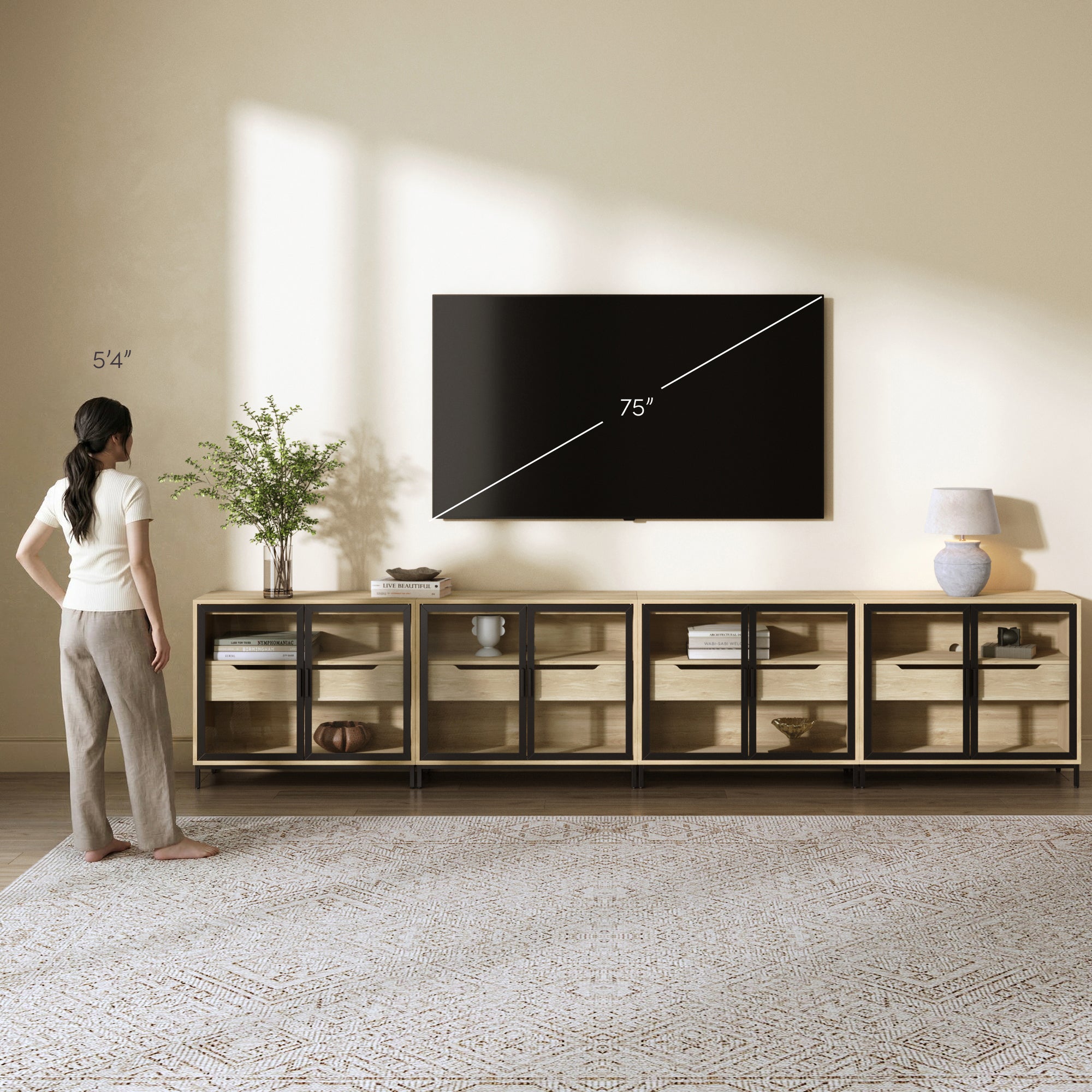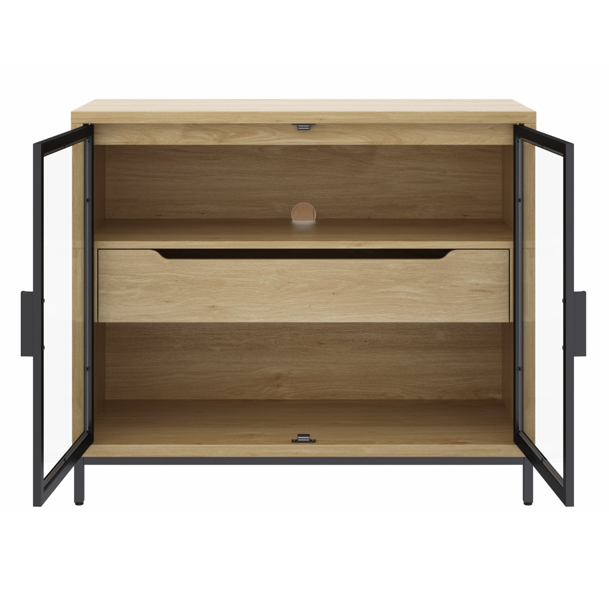 Meet the Mackenna glass TV stand console in Light Oak—modern, versatile, and made to organize beautifully. Framed with powder-coated metal and tempered glass doors, Mackenna balances sleek style with everyday function. A spacious center drawer keeps essentials tucked away, while open shelving and a back cord cutout make it easy to display or connect your devices. Place multiple cabinets flush side-by-side for a custom credenza or stylish media setup that grows with your space.