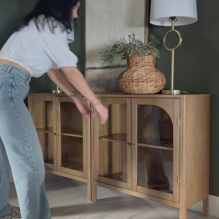 Meet Mason, the modern farmhouse storage cabinet of your dreams. Its rounded frame edge and brass finish hardware combine to create the perfect statement piece for your farmhouse-style home. And let's not forget that wire brushed light brown interior – it's like the warm hug your belongings have been waiting for. Those curved glass doors? They're practically saying, "Put your books, fancy glassware, or your collection of quirky gnome figurines on display here!" Oh, and here's a pro tip: Double the storage and style by placing two of these beauties side by side.