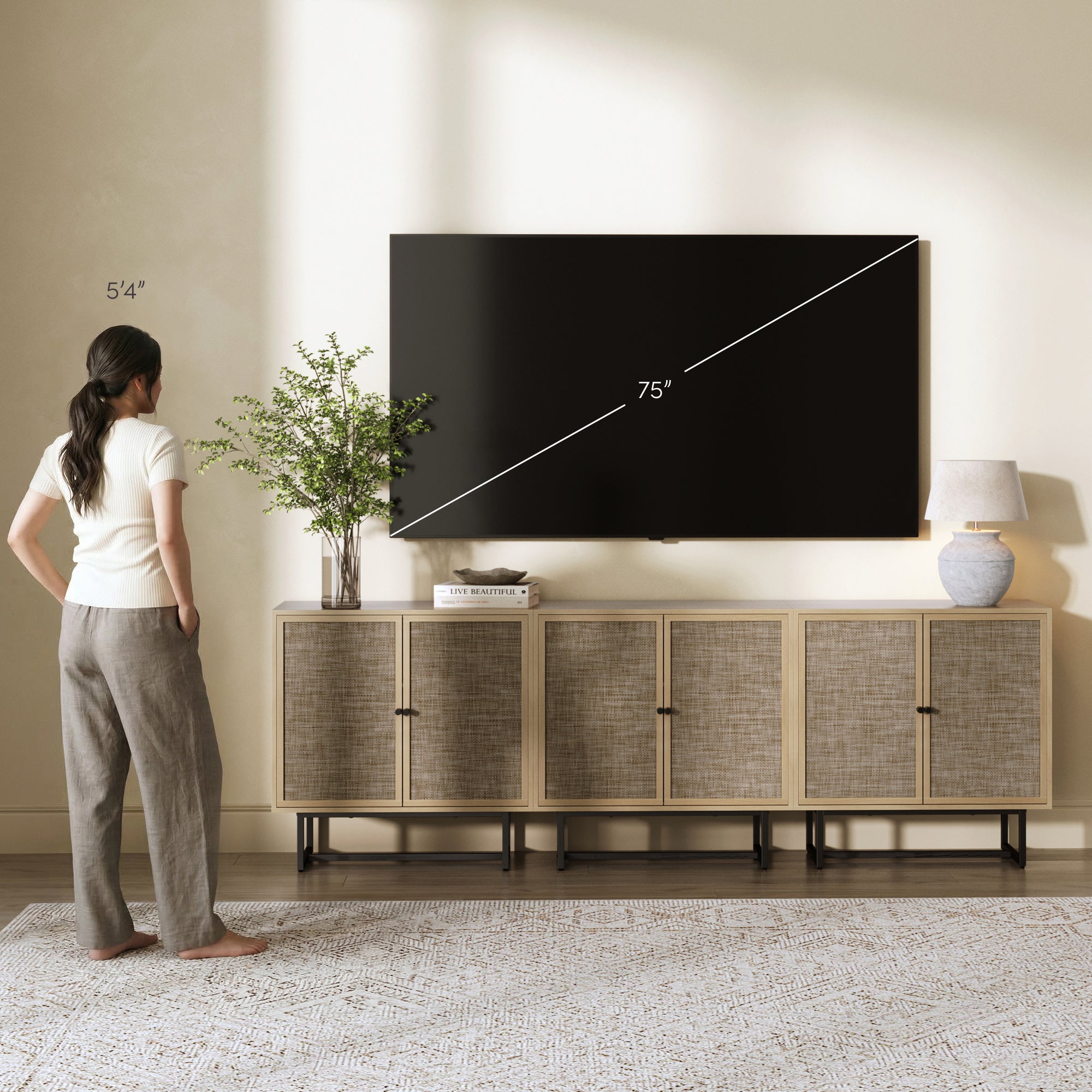 Meet Kova—a TV console cabinet with adjustable doors and shelf, a durable base with leveling glides, and woven textilene details. With a 90 lb weight limit on top and 26 lbs per shelf, Kova blends style and function for any space!