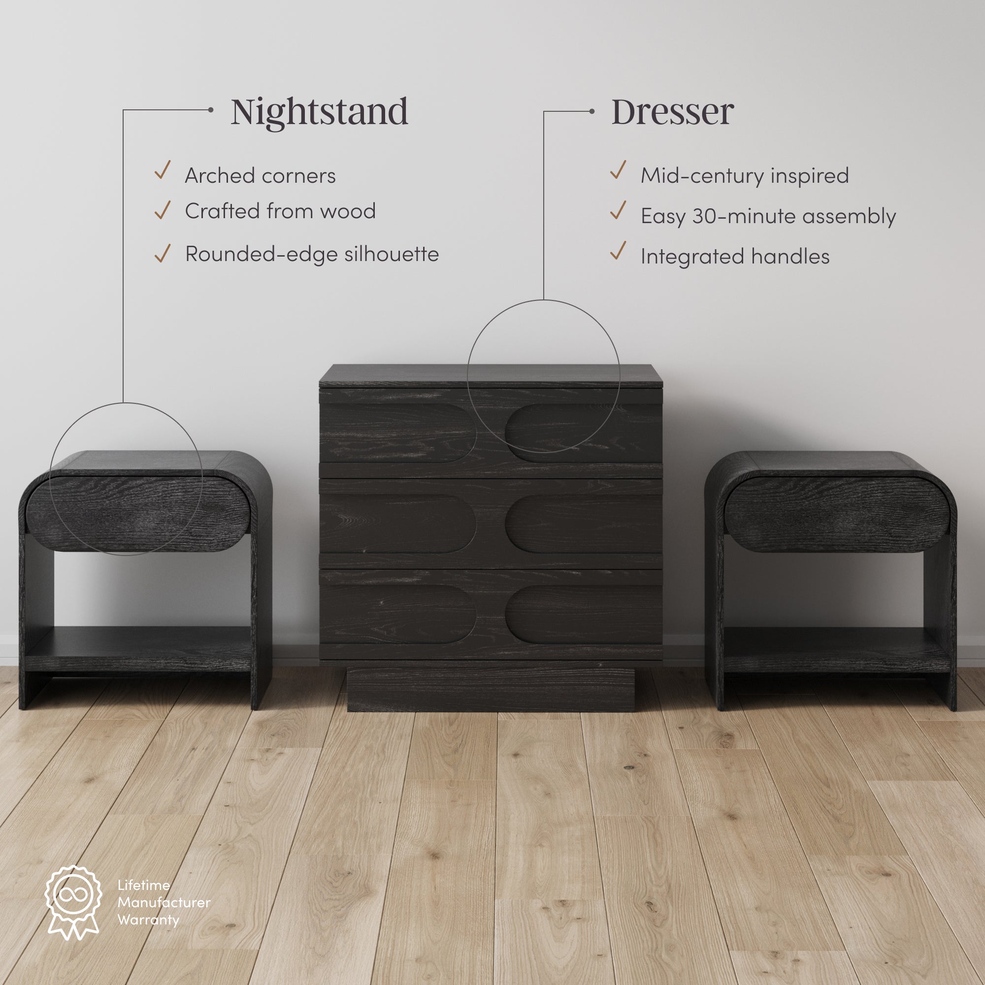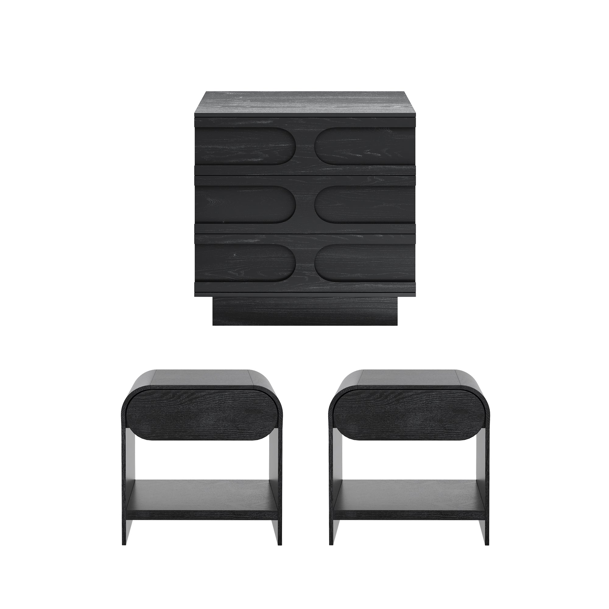Mid-Century Arched Dresser and Two Nightstands Set Black Oak