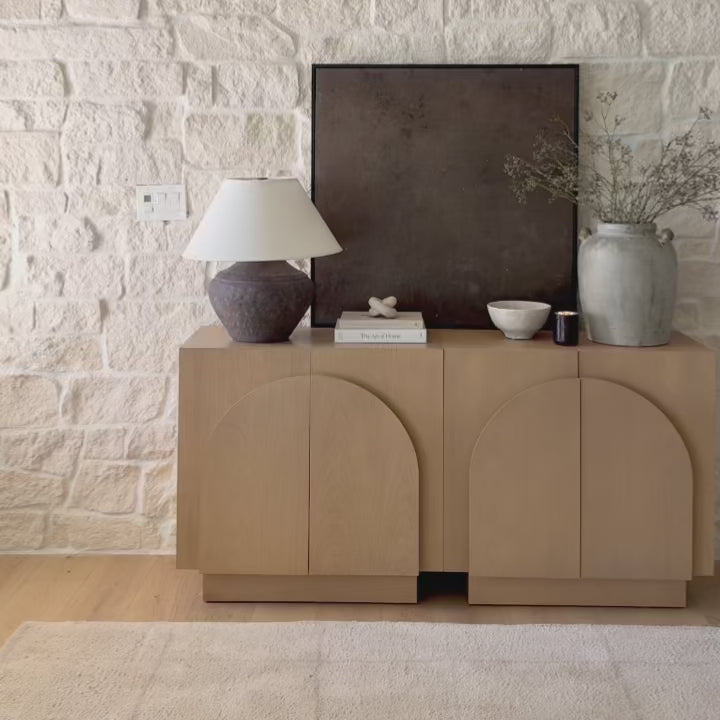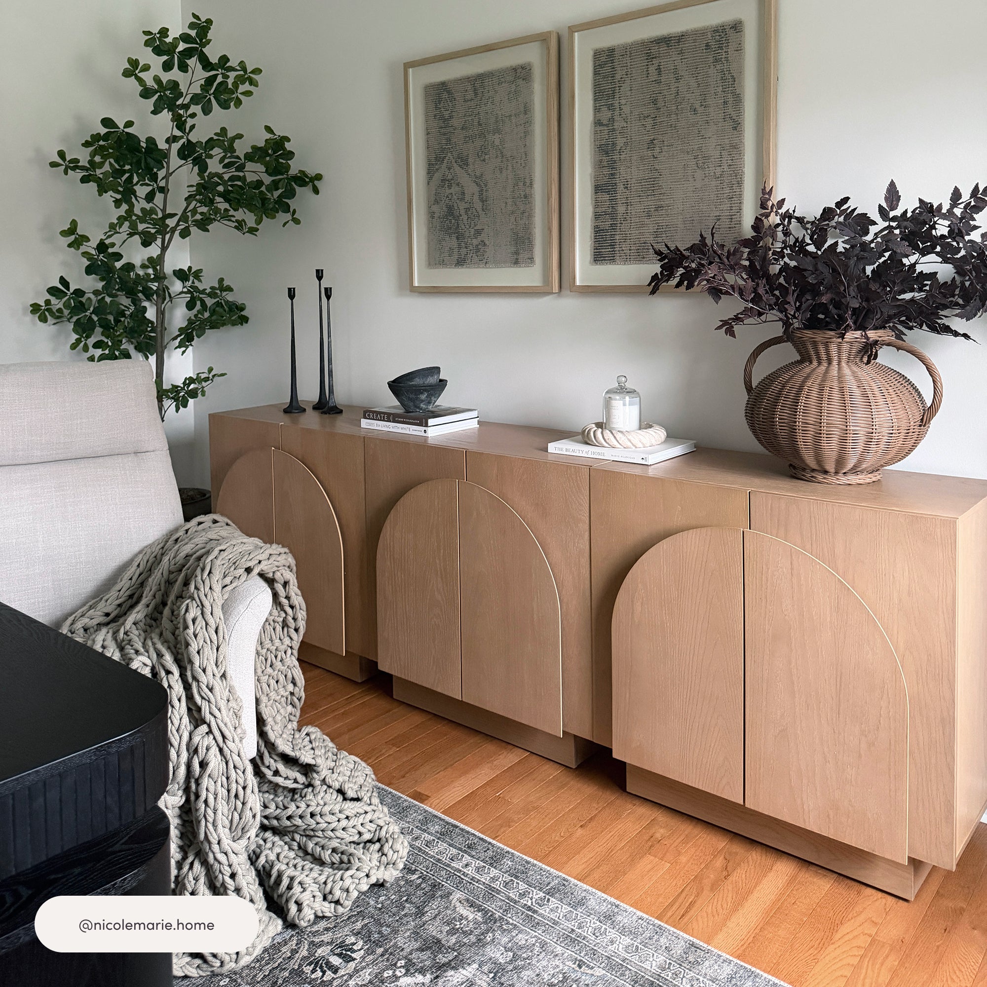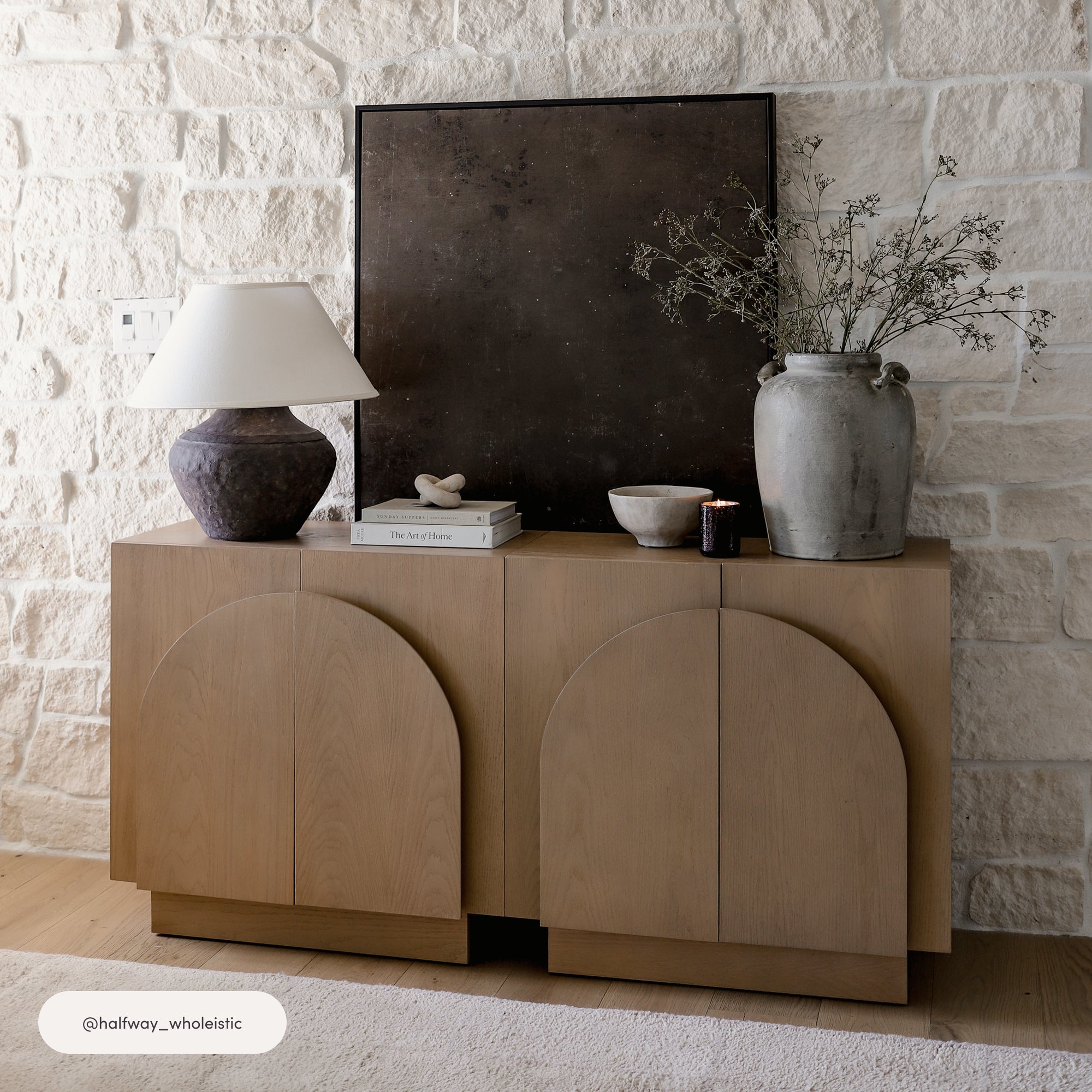 Meet the Iris Storage Cabinet, where functionality meets flair! Its arched corners and rounded-edge silhouette bring a touch of elegance to any space, while adjustable interior shelves let you customize storage for all your essentials. Crafted from natural wood, each piece boasts unique variations in grain, making yours truly one of a kind. A clever cord management hole ensures your tech stays tidy, while the modular design means you can line up multiple units for a seamless storage solution. Iris isn't just a cabinet‚ it's a style statement waiting to organize your life!