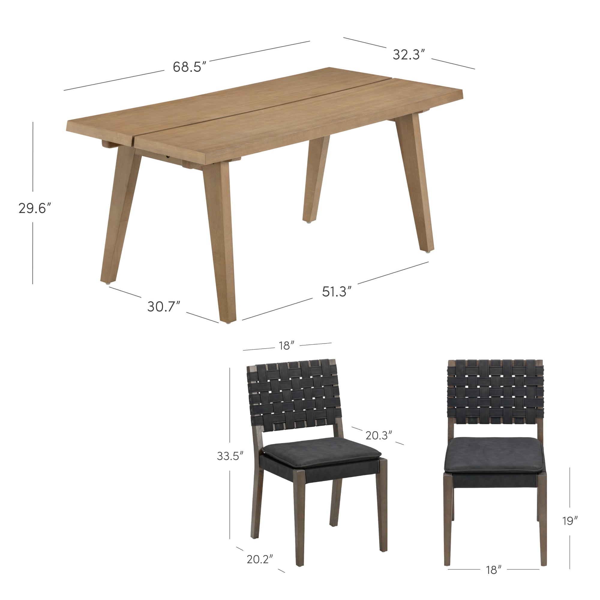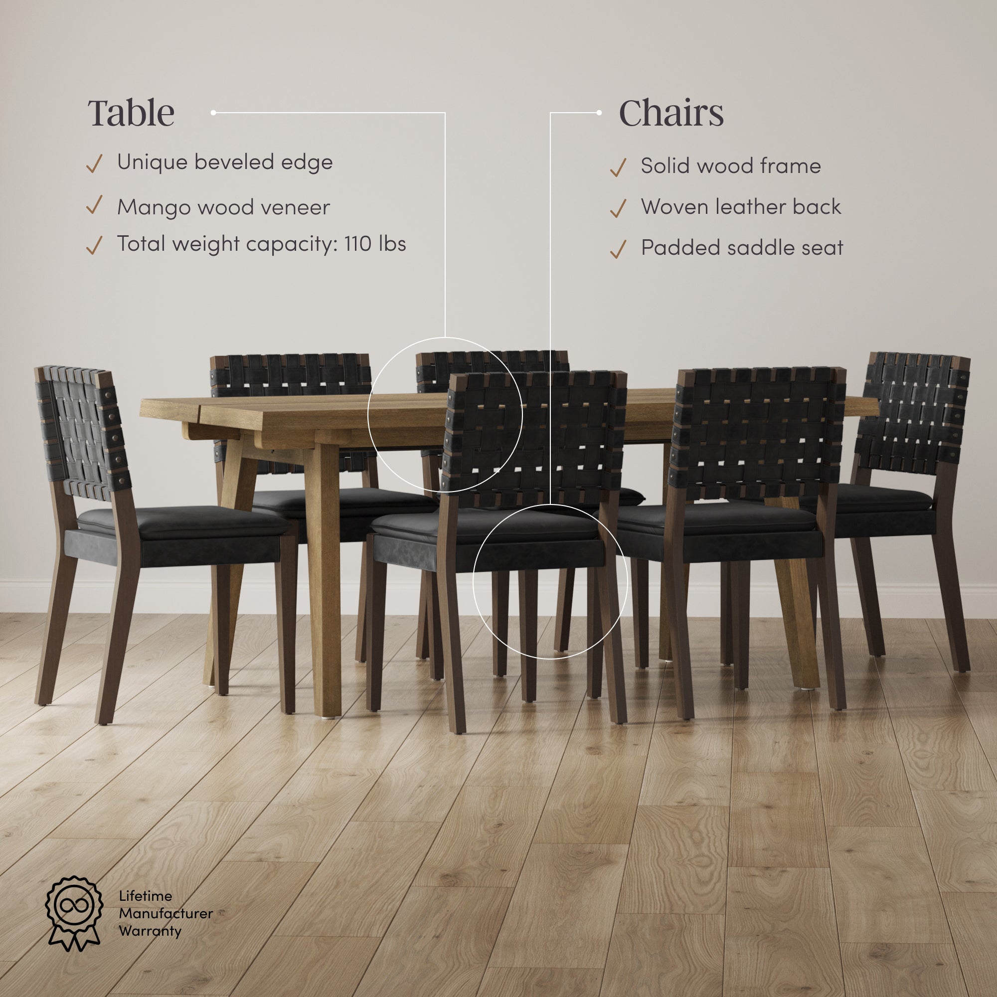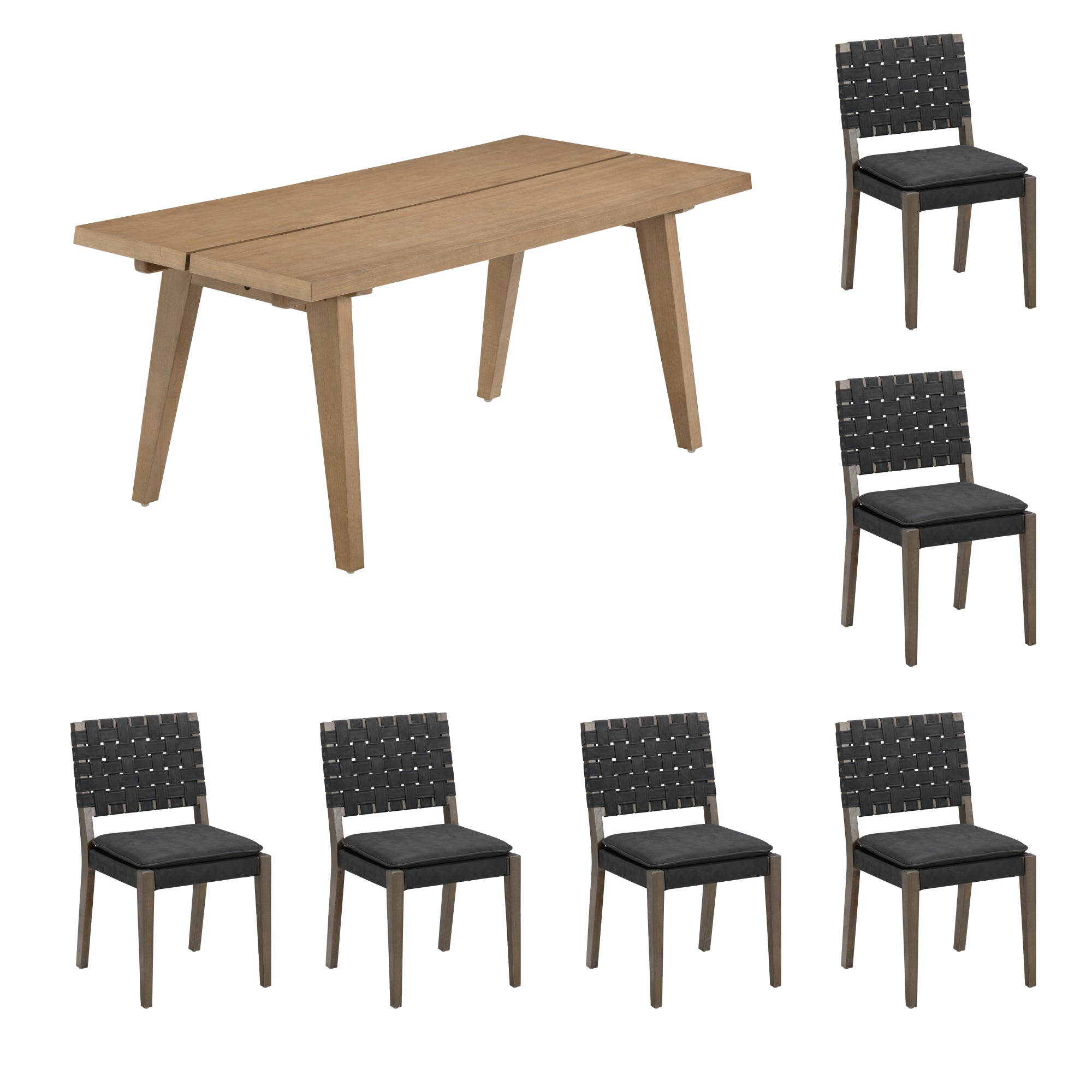 Gather in comfort and style with the Andy Dining Table and Cohen Dining Chairs set. Andy isn't just a table, it's a conversation starter. With beveled edges, mango veneer finish, and sturdy wood legs, it comfortably seats six and showcases unique natural wood grain patterns, making every meal one of a kind. Cohen brings a modern, handcrafted touch with its padded saddle seat and hand-woven faux leather backrest. Designed at the perfect 19-inch seat height, it pairs beautifully with Andy for a relaxed dining experience. The velcro-secured cushion keeps everything in place, while the solid wood frame adds lasting durability and warmth. Together, Andy and Cohen create a dining set that balances craftsmanship, comfort, and natural style, perfect for everything from weeknight dinners to long weekend brunches.