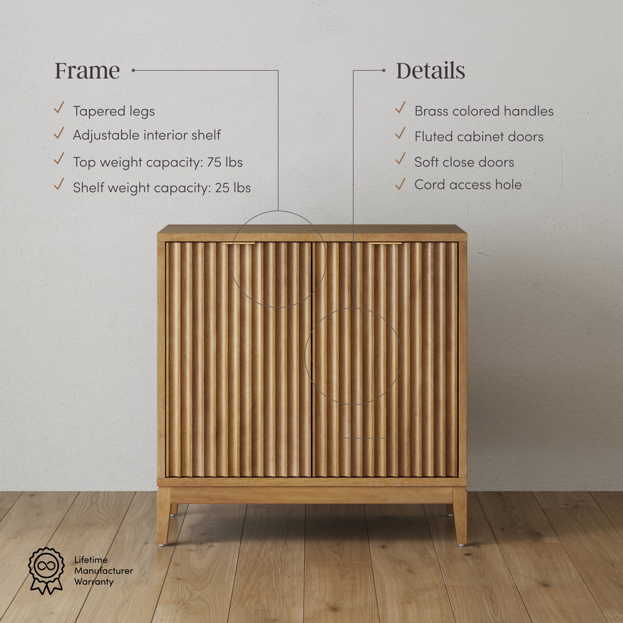 Meet Jasper—a stylish storage cabinet with elegant fluted door details, tapered legs, and brass-colored handles. Crafted with a sleek wood veneer finish, Jasper blends timeless charm and functionality to elevate any room.