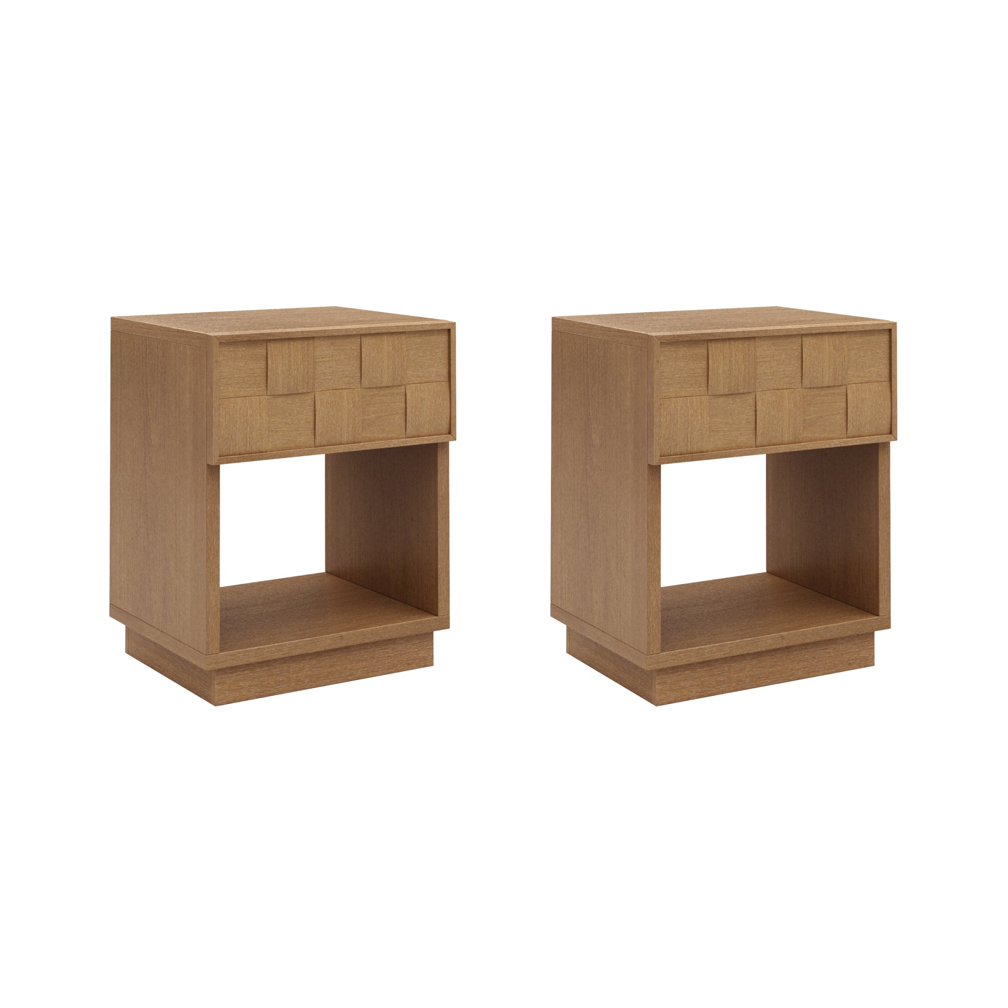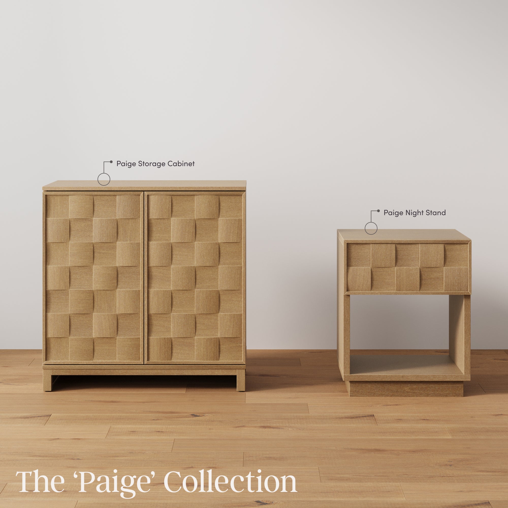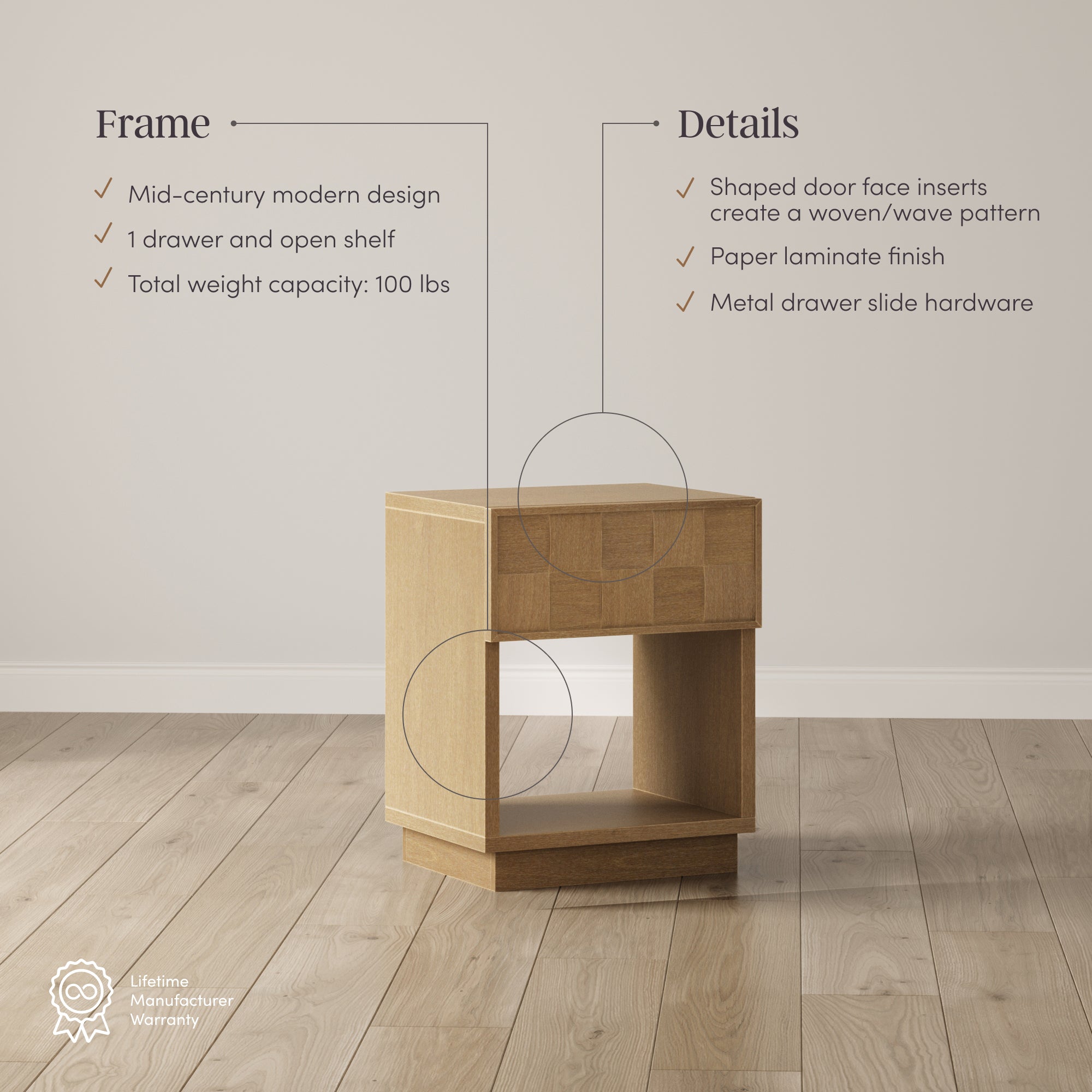 The Paige Nightstand brings texture and function to your bedside with a clean, modern feel. A shaped drawer front creates a subtle woven wave pattern, adding visual interest without overpowering your space. The smooth-glide drawer keeps essentials tucked away, while the open bottom shelf offers easy-access storage. Finished in durable paper laminate, Paige is a stylish, practical piece that fits effortlessly into everyday living.