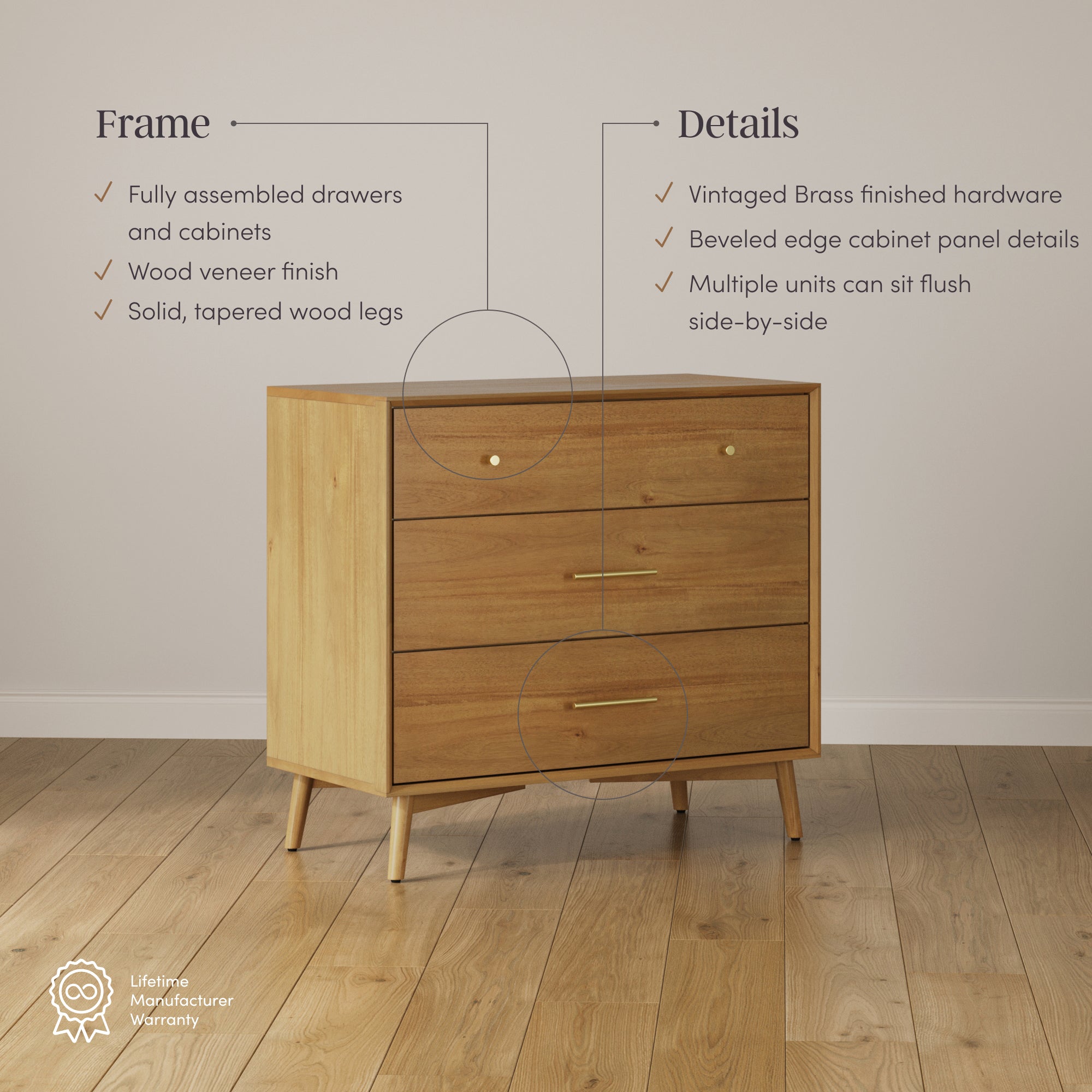Meet the Harper Dresser - a mid-century modern classic with effortless style and everyday function. Featuring three spacious drawers with beveled edge detailing and vintaged brass hardware, it’s the perfect blend of warmth and sophistication. The wood veneer finish and solid tapered legs give it a timeless look, while natural wood variations make each piece truly one of a kind. Arrives with drawers fully assembled-just attach the legs and pulls, and you’re ready to go!