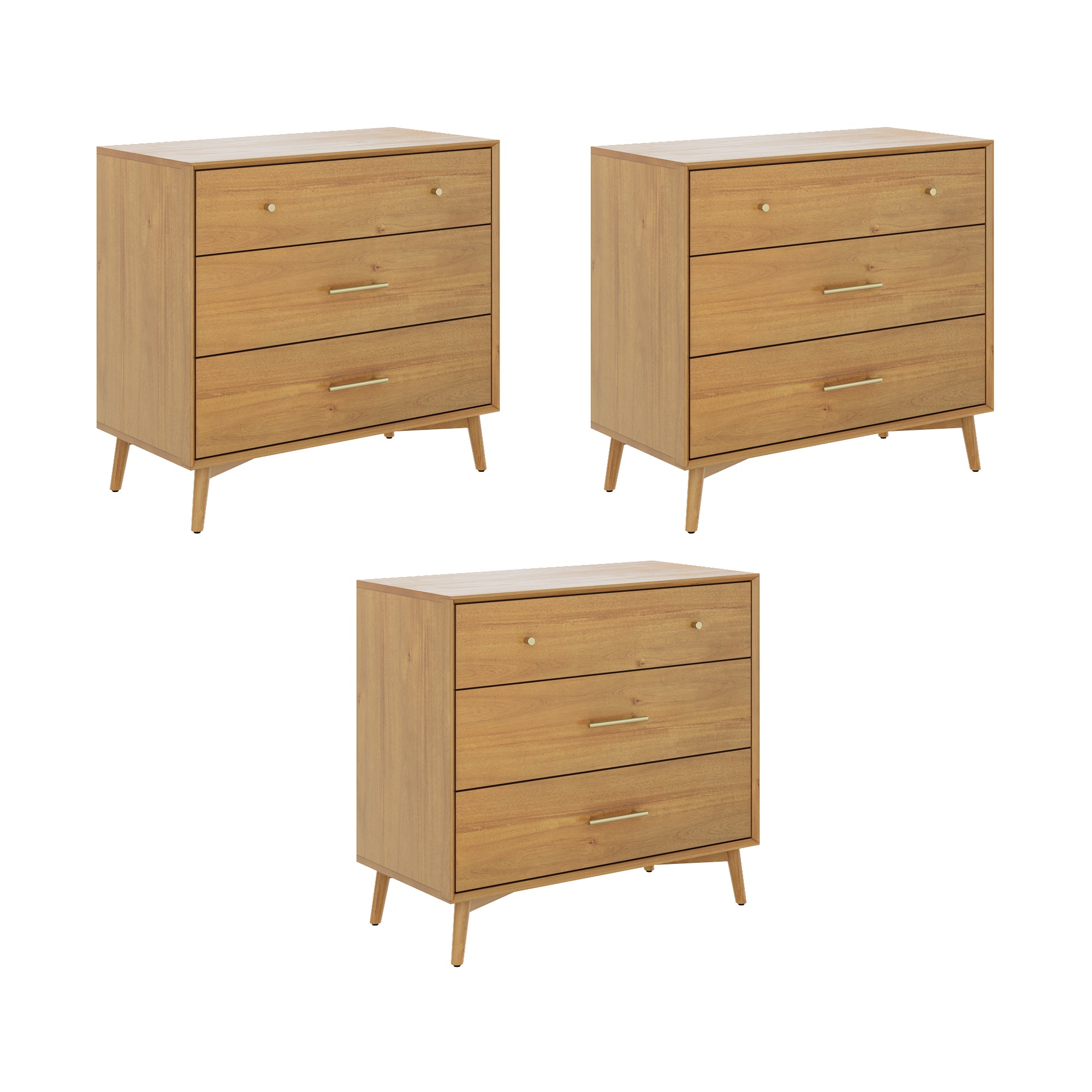 Mid-Century Modern Acacia 3 Drawer Dresser Set of 3