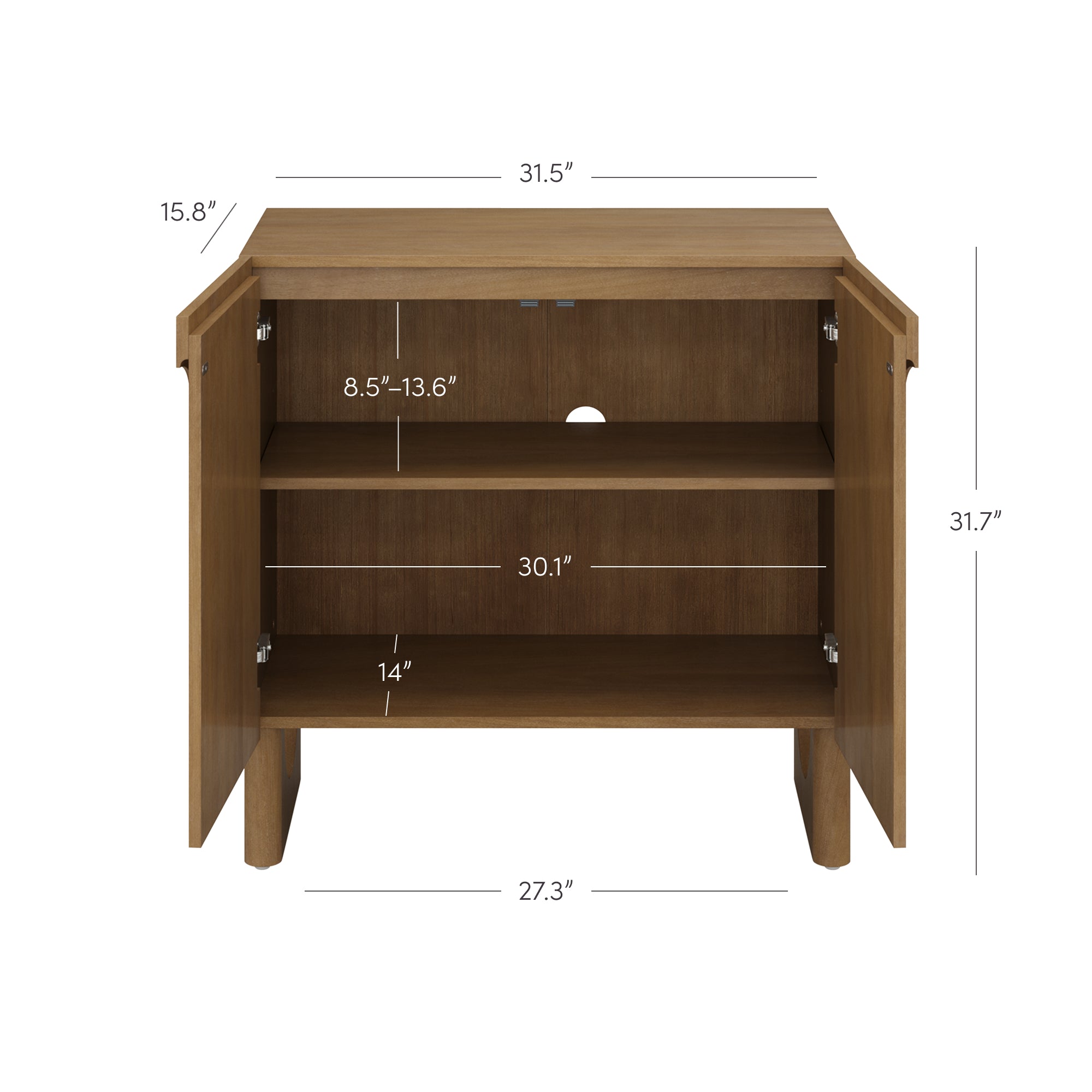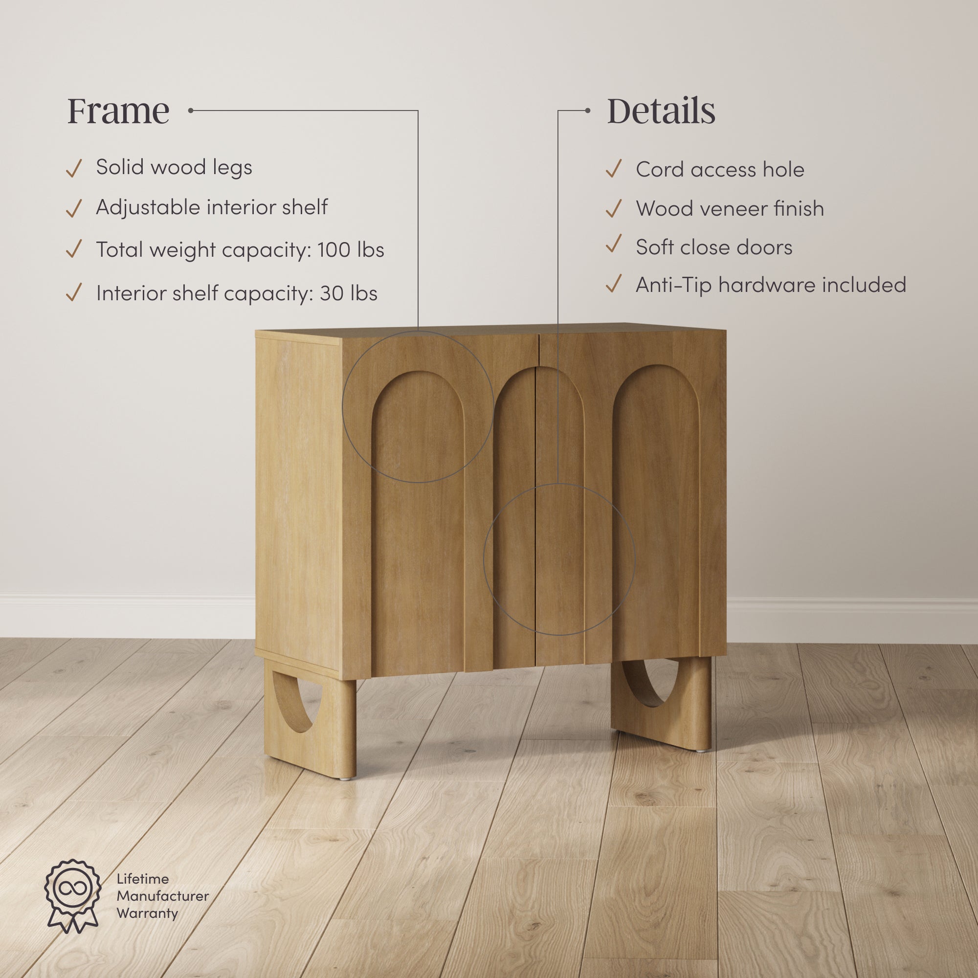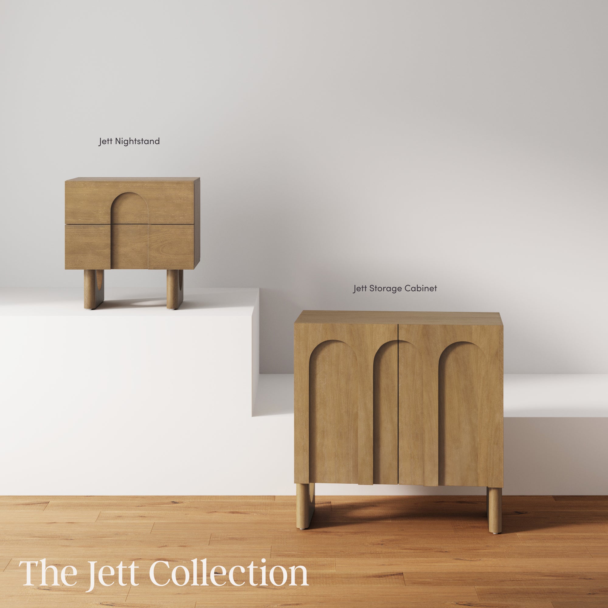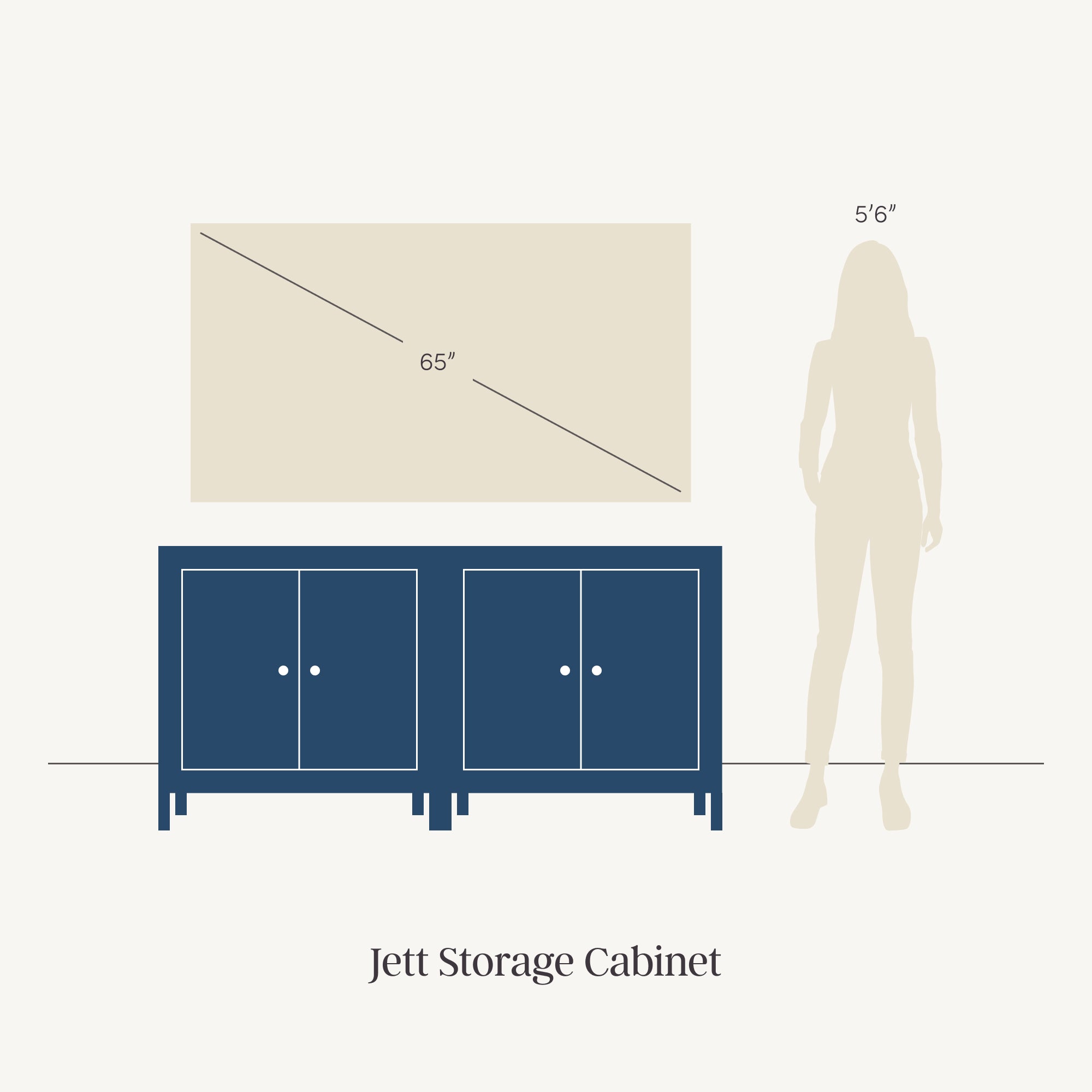 The Jett Storage Cabinet in Light Brown captures the essence of Scandinavian design with its clean lines and thoughtful functionality. It features solid wood legs with sculptural round cutouts, integrated door pulls, and soft-close doors for a seamless look. Inside, an adjustable shelf and cord access hole add flexible storage options. Finished in natural wood veneer, each cabinet showcases unique grain and color variations. Style multiple side by side as a credenza or bar cabinet to suit your space.
