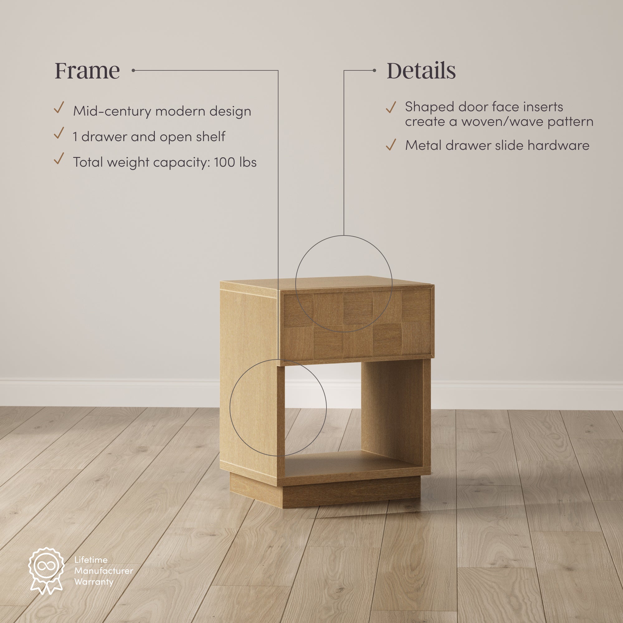 The Paige Nightstand brings texture and function to your bedside with a clean, modern feel. A shaped drawer front creates a subtle woven wave pattern, adding visual interest without overpowering your space. The smooth-glide drawer keeps essentials tucked away, while the open bottom shelf offers easy-access storage. Paige is a stylish, practical piece that fits effortlessly into everyday living.