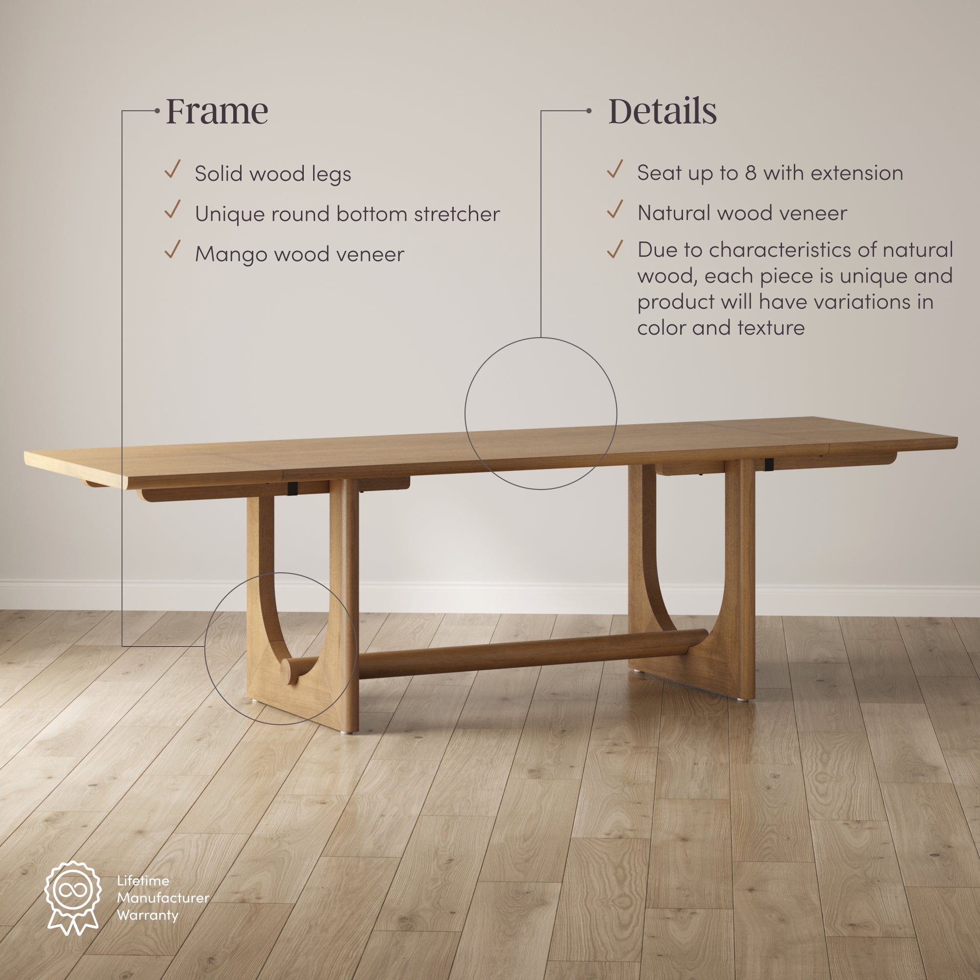 Designed to match the Solace wooden dining table, this dining table extension leaf lets you expand your modern dining table set for 6 into a spacious table for 8. Crafted with smooth mango veneer in warm light brown, it blends seamlessly with the original table's mid-century style. The intuitive installation process makes setup simple, with built-in adjustments for a stress-free fit. Just add the solid wood dining table with extension when guests arrive, and you're ready for dinner parties, holidays, or casual nights in. Stylish, functional, and flexible, the Solace dining table with extension leaf ensures There's always space for everyone.