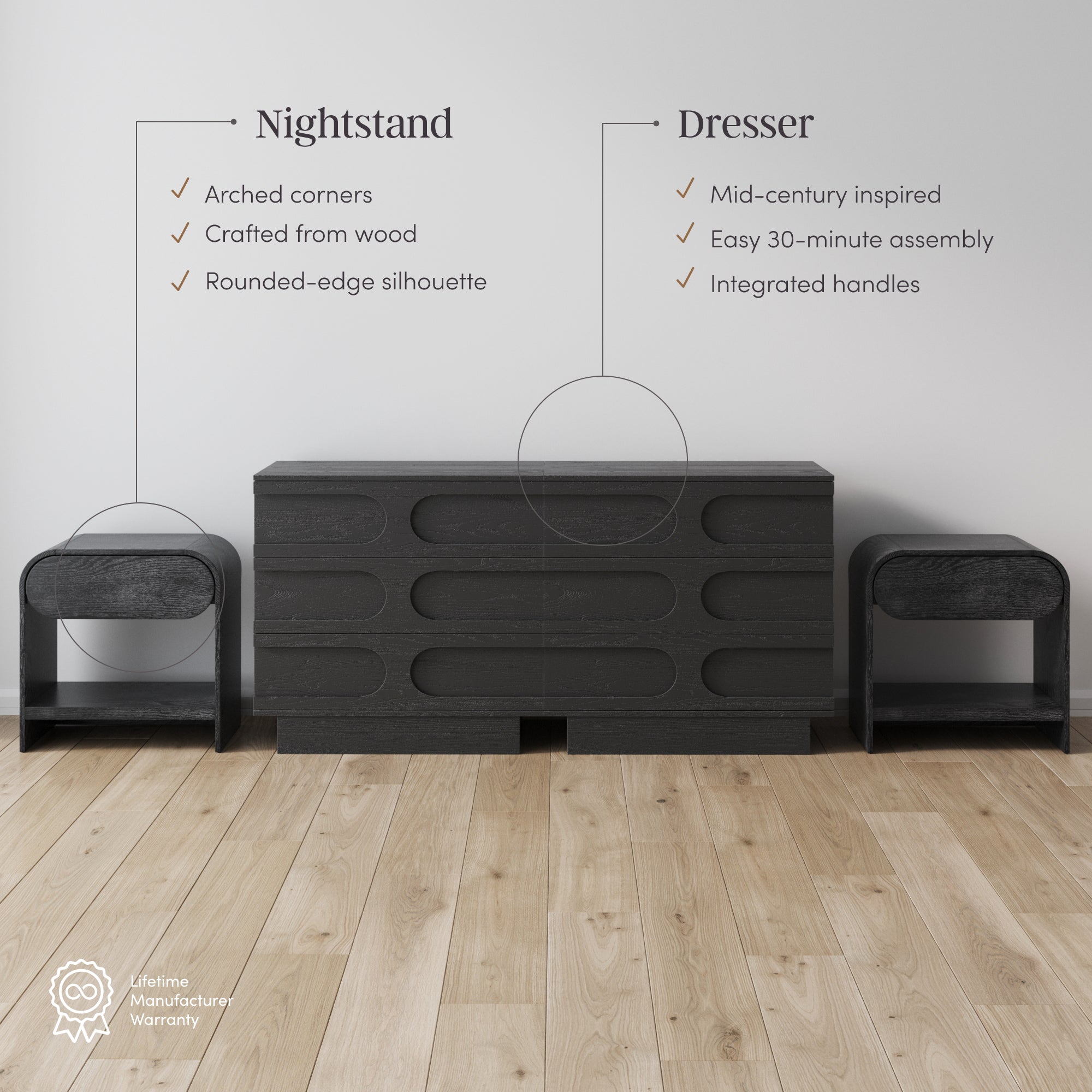 Easy assembly. View the dresser assembly instructions. View the nightstand assembly instructions.CANNOT be washed/cleaned with bleach. Dust with a soft, dry cloth or duster. Blot spills immediately with a clean, damp, colorfast cloth to avoid potential staining. Soak up any remaining moisture immediately with a soft, dry, colorfast cloth to prevent potential watermarks, bubbling, etc. Limit direct contact with heat, moisture and other elements to avoid finish damage. To prevent potential color fading, keep out of direct sunlight. Inspect and re-tighten all hardware connections periodically.California Residents: Click here for California Proposition 65 warning.