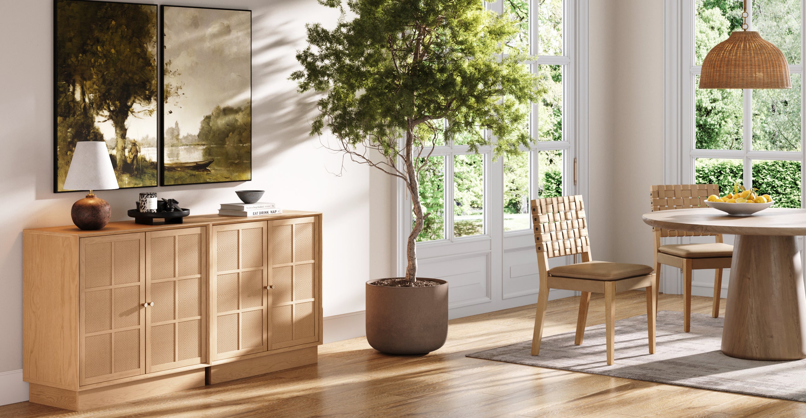 Modern Coastal Rattan Wood Sideboard Storage Cabinet Raw Oak