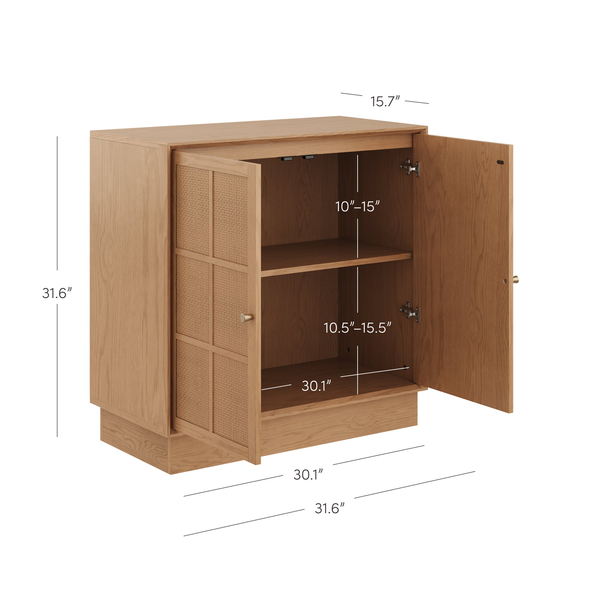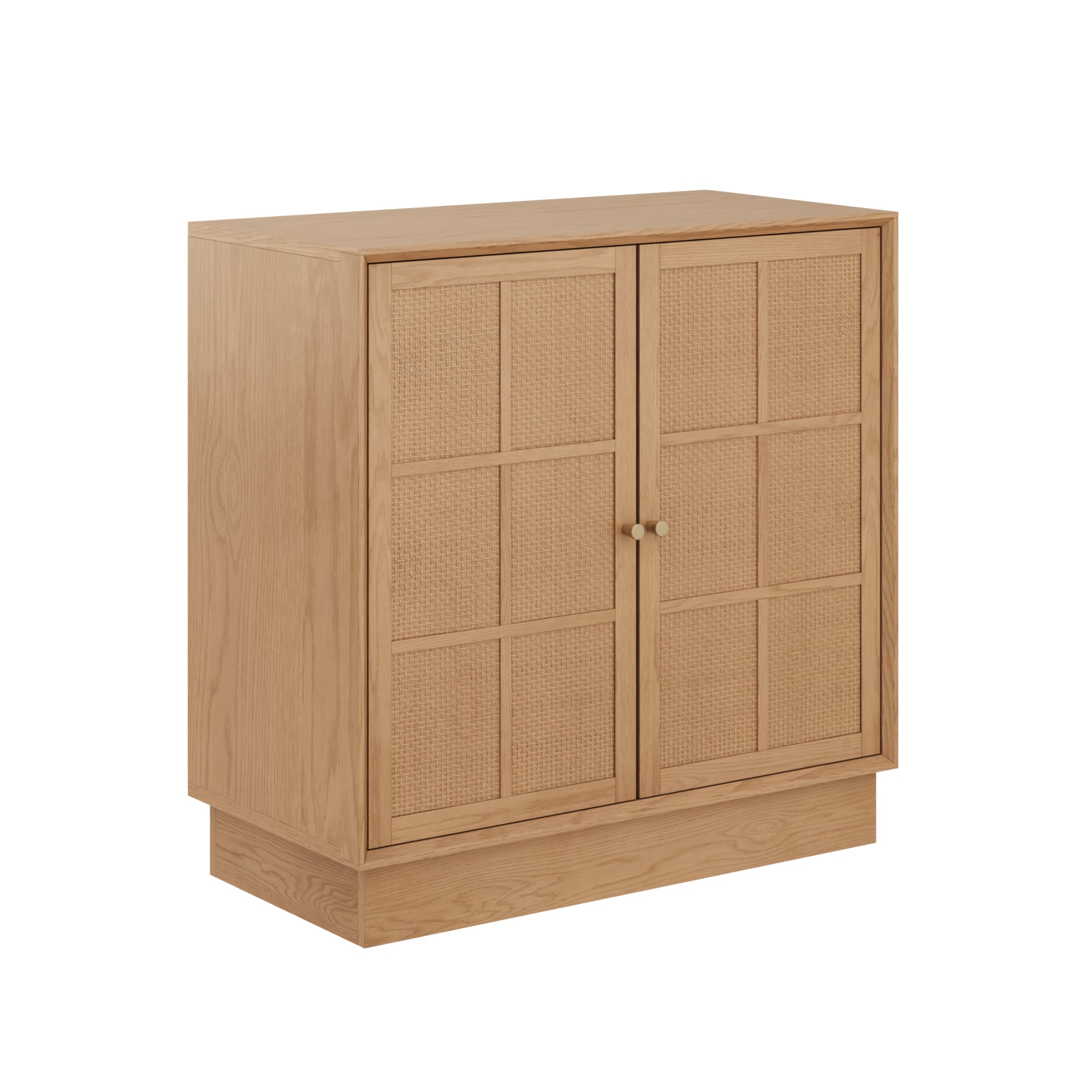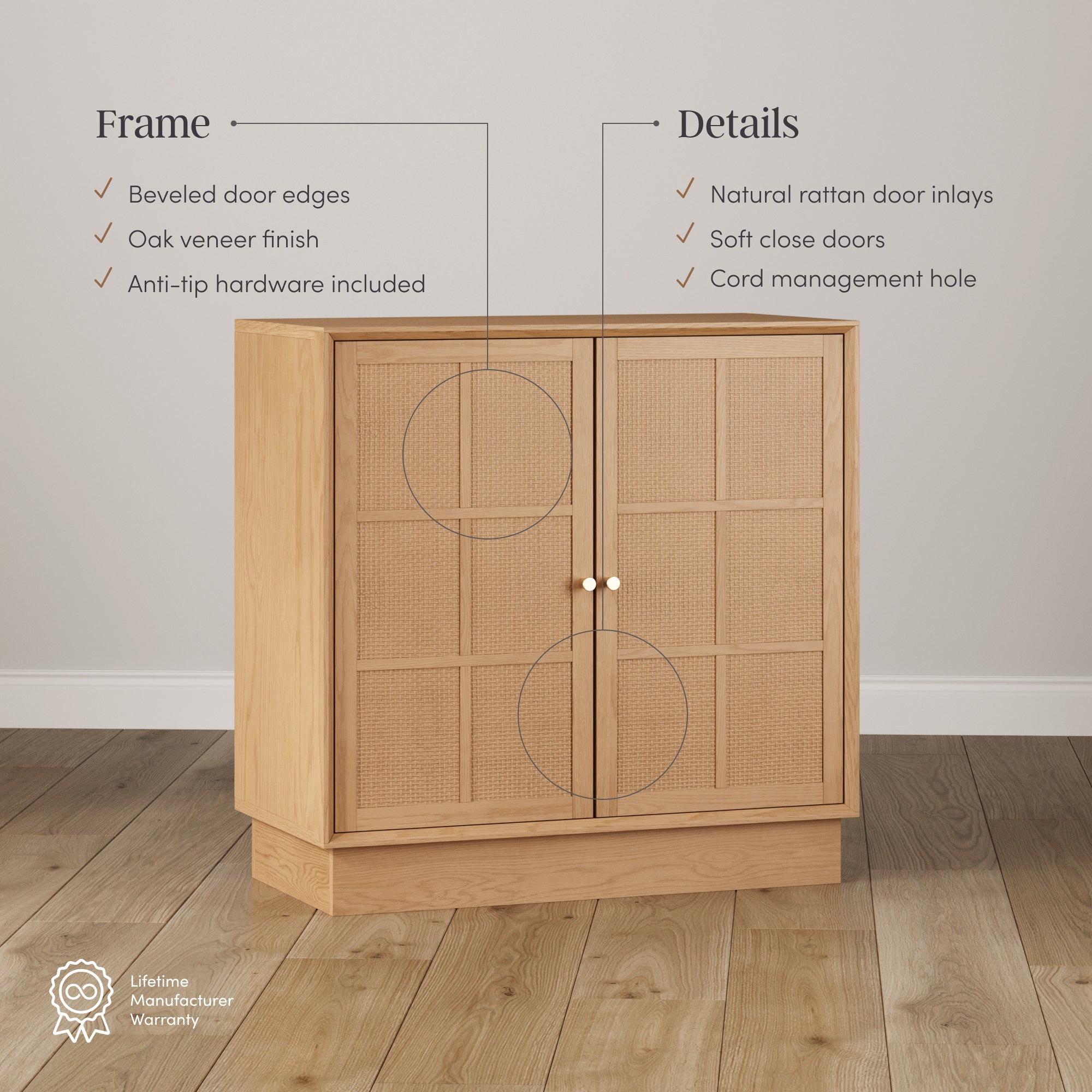 The Elise Storage Cabinet pairs natural texture with clean, modern design. Rattan door inlays and beveled edges add warmth and detail, complemented by round tapered pulls and a streamlined platform base. Soft-close doors open to functional storage with cord access, keeping things neat and organized. Finished in oak veneer, Elise can be placed flush side-by-side with multiple units and includes anti-tip hardware, making it both stylish and thoughtfully designed for everyday living.