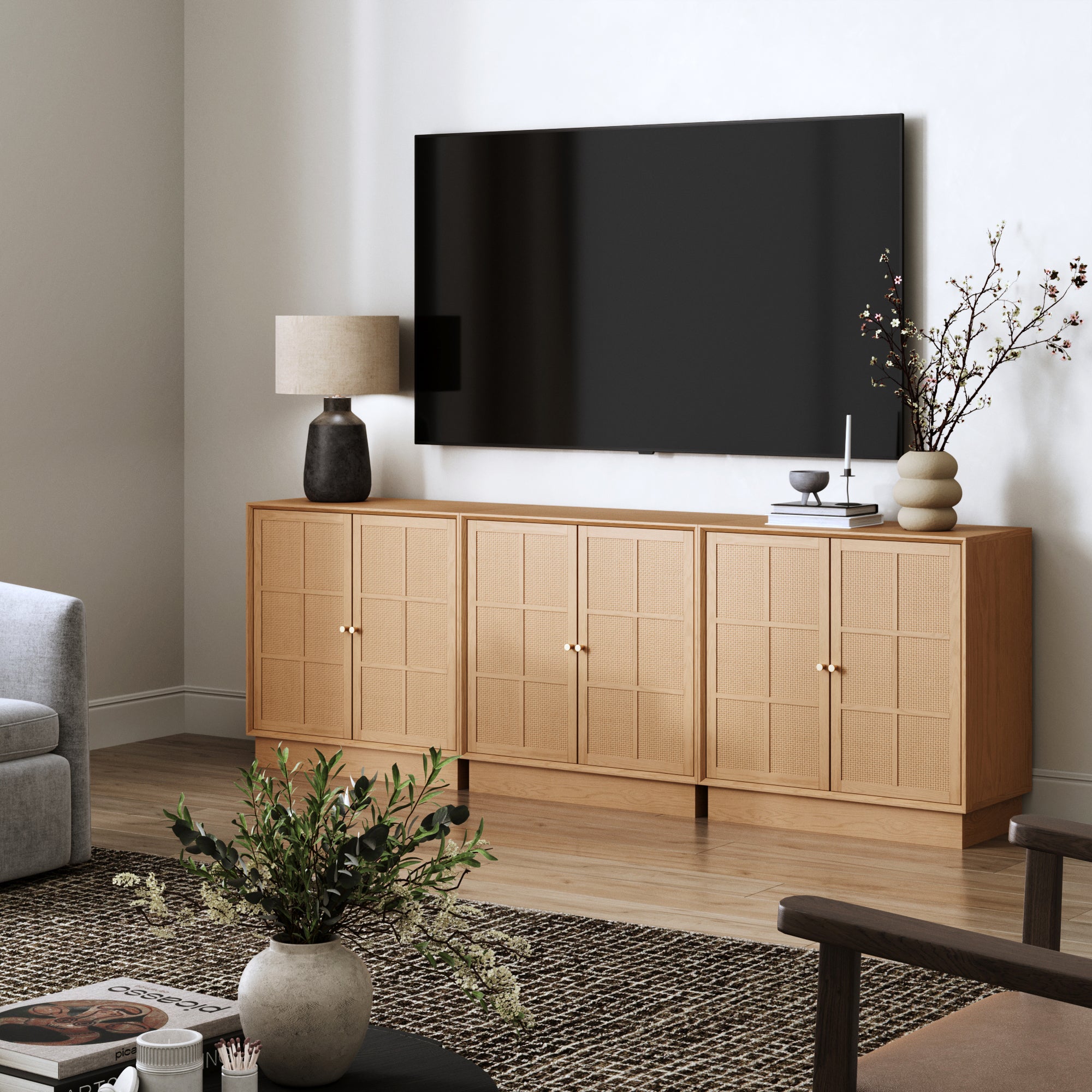 The Elise oak storage cabinet pairs natural texture with clean, modern design. Rattan door inlays and beveled edges add warmth and detail, complemented by round tapered pulls and a streamlined platform base. Soft-close doors open to functional storage with cord access, keeping things neat and organized. Finished in oak veneer, Elise can be placed flush side-by-side with multiple units and includes anti-tip hardware, making it both stylish and thoughtfully designed for everyday living.