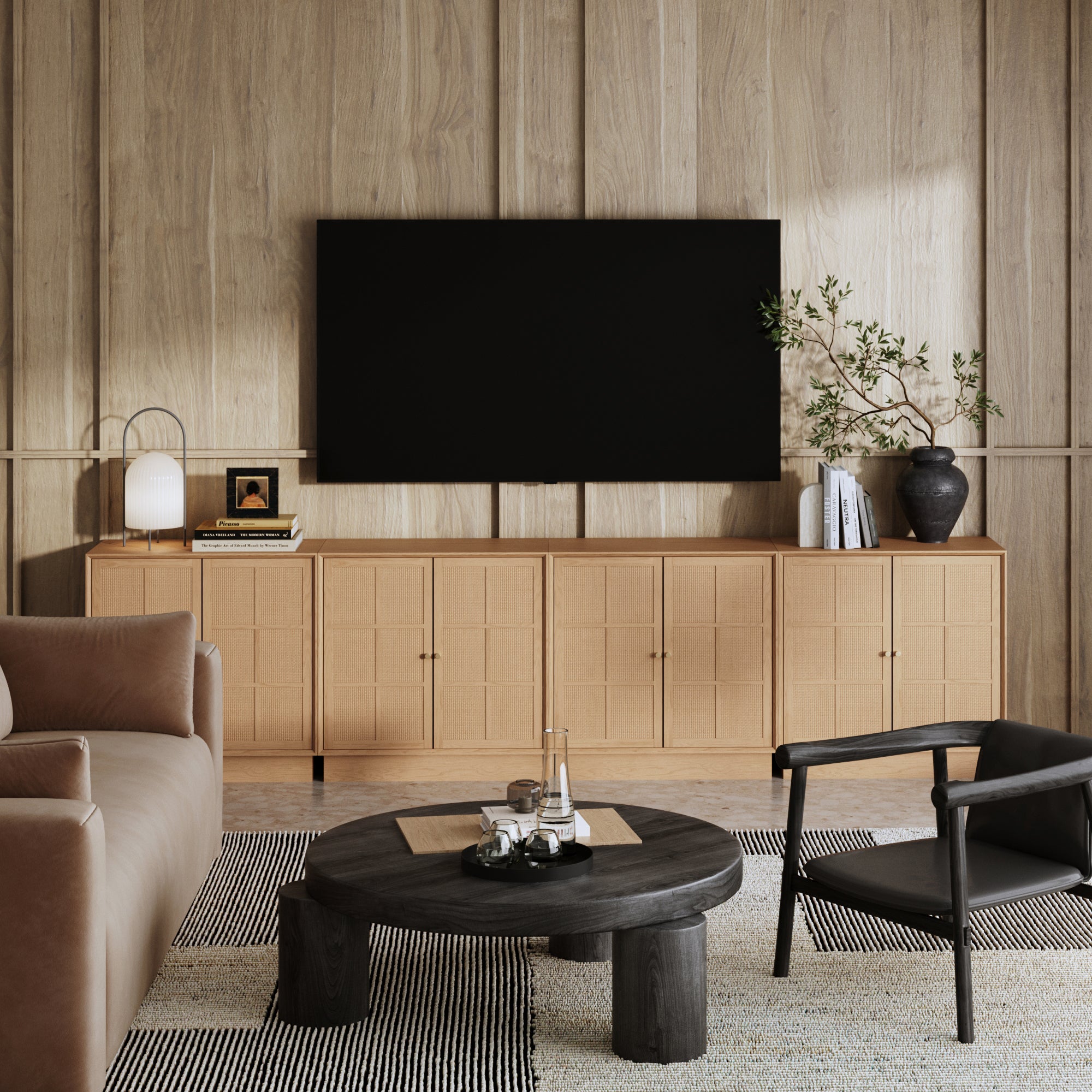 The Elise Storage Cabinet pairs natural texture with clean, modern design. Rattan door inlays and beveled edges add warmth and detail, complemented by round tapered pulls and a streamlined platform base. Soft-close doors open to functional storage with cord access, keeping things neat and organized. Finished in oak veneer, Elise can be placed flush side-by-side with multiple units and includes anti-tip hardware, making it both stylish and thoughtfully designed for everyday living.