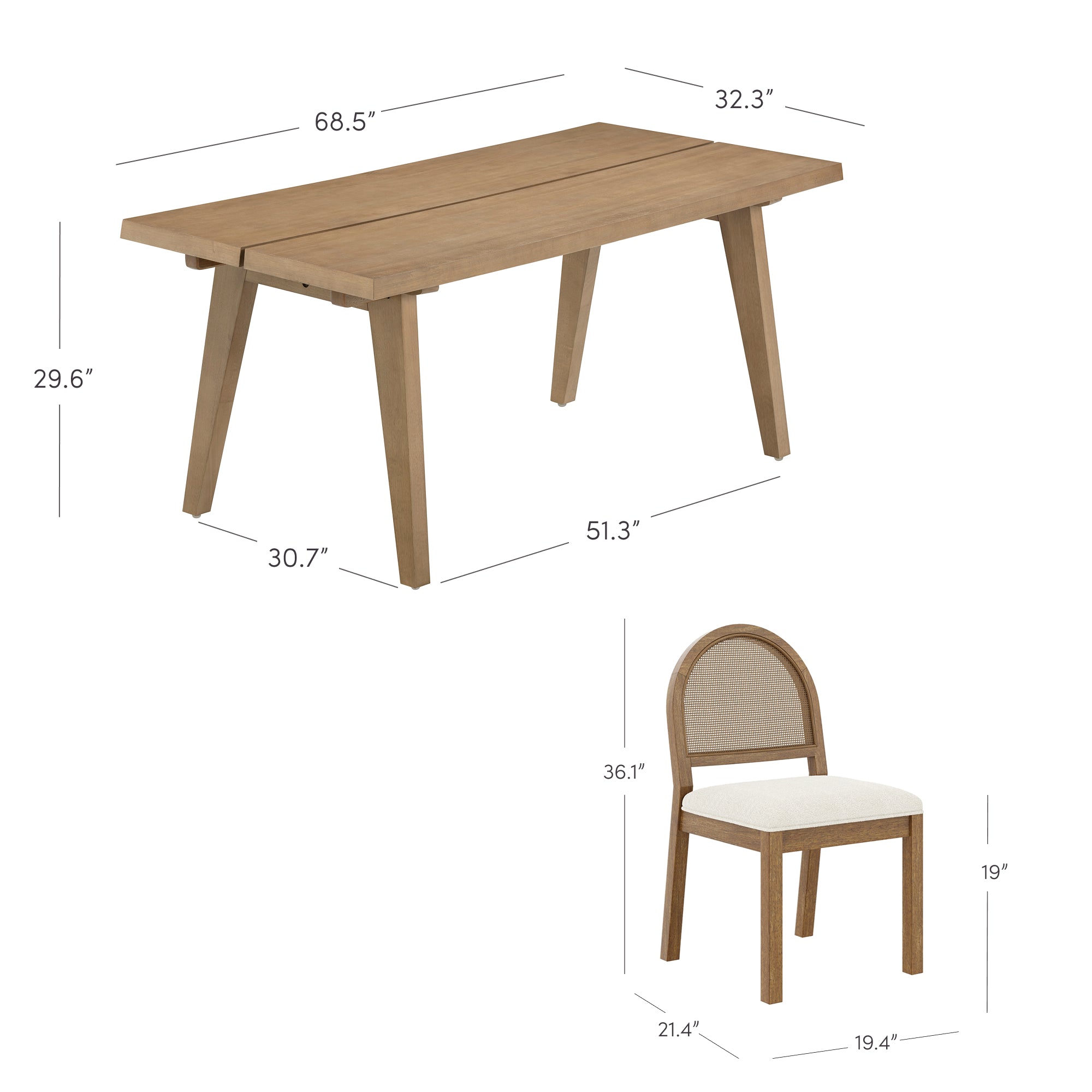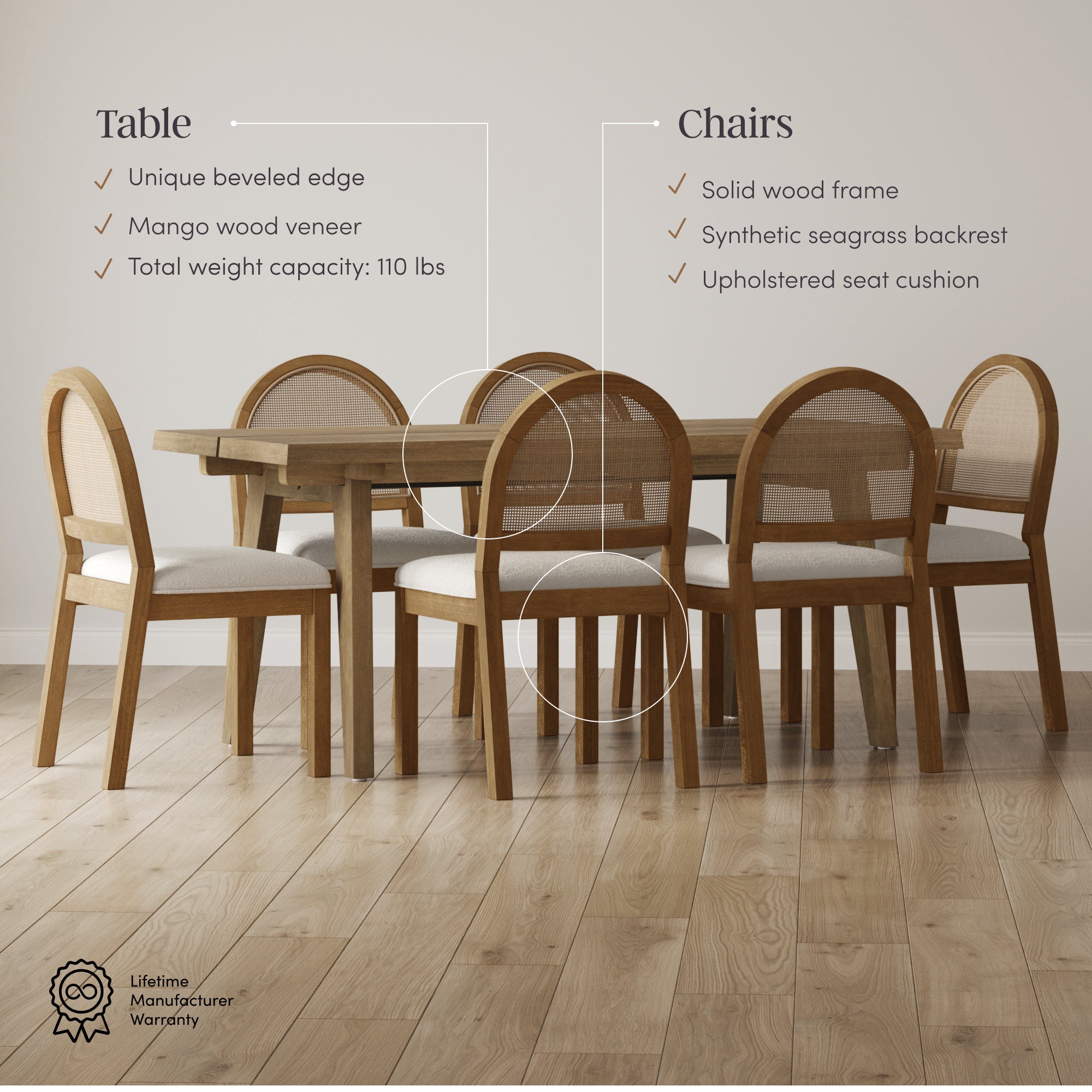 Bring effortless style and comfort to your dining space with the Andy Dining Table and Bailey Dining Chairs set. Andy isn't just a table, it's a statement piece. With beveled edges, mango veneer finish, and sturdy solid wood legs, it seats up to six and sets the stage for everything from casual pizza nights to elegant dinners. Each tabletop has natural grain ensures no two gatherings ever look quite the same. Paired with Andy, Bailey blends modern design with timeless warmth. Its curved silhouette features a woven natural cane back, wire-brushed light brown frame, and a plush boucle-textured seat that invites you to linger in comfort and style.