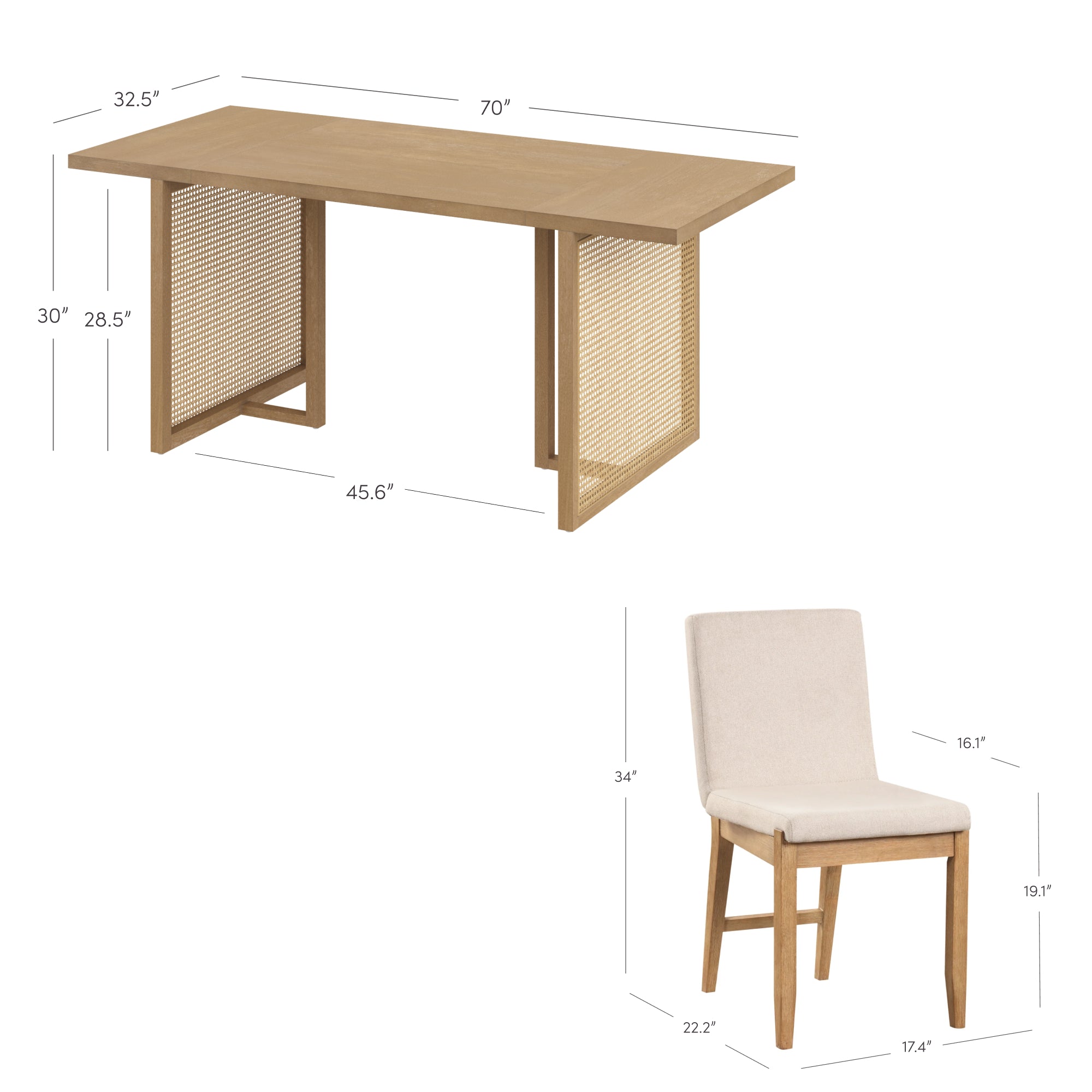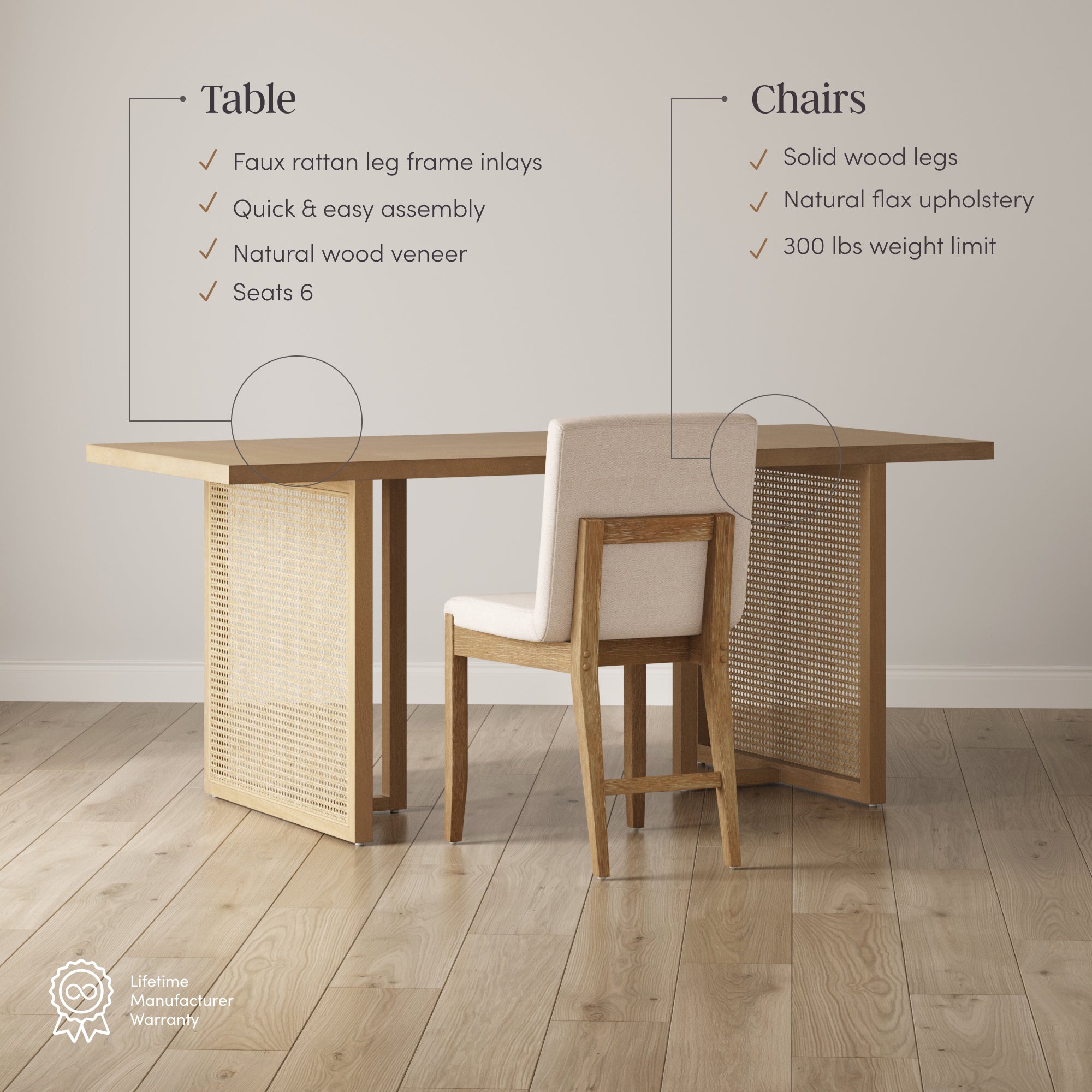 Meet the Willow Dining Table—where style meets everyday living. Built on a sturdy solid wood base, this table seats six comfortably and showcases natural variations in color and texture for a one-of-a-kind look. The set includes 6 matching chairs with thick, durable C-shaped cushions wrapped in natural flax upholstery. With solid wood legs for added support, Willow brings warmth, comfort, and timeless style to every meal.