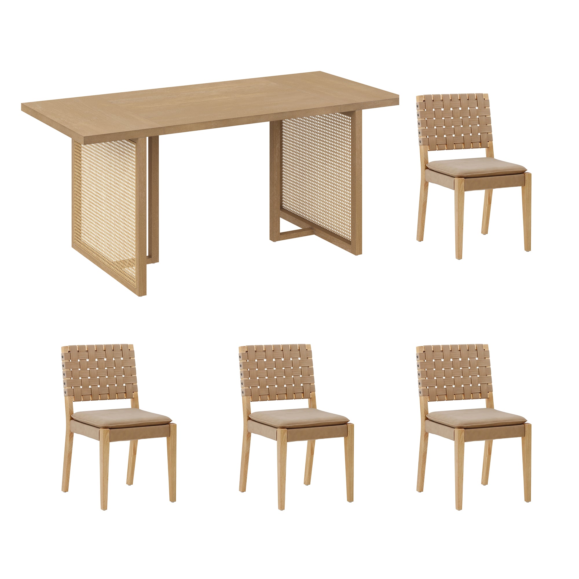 Rattan Boho Dining Table Set of 4 w/ Faux Leather Chairs