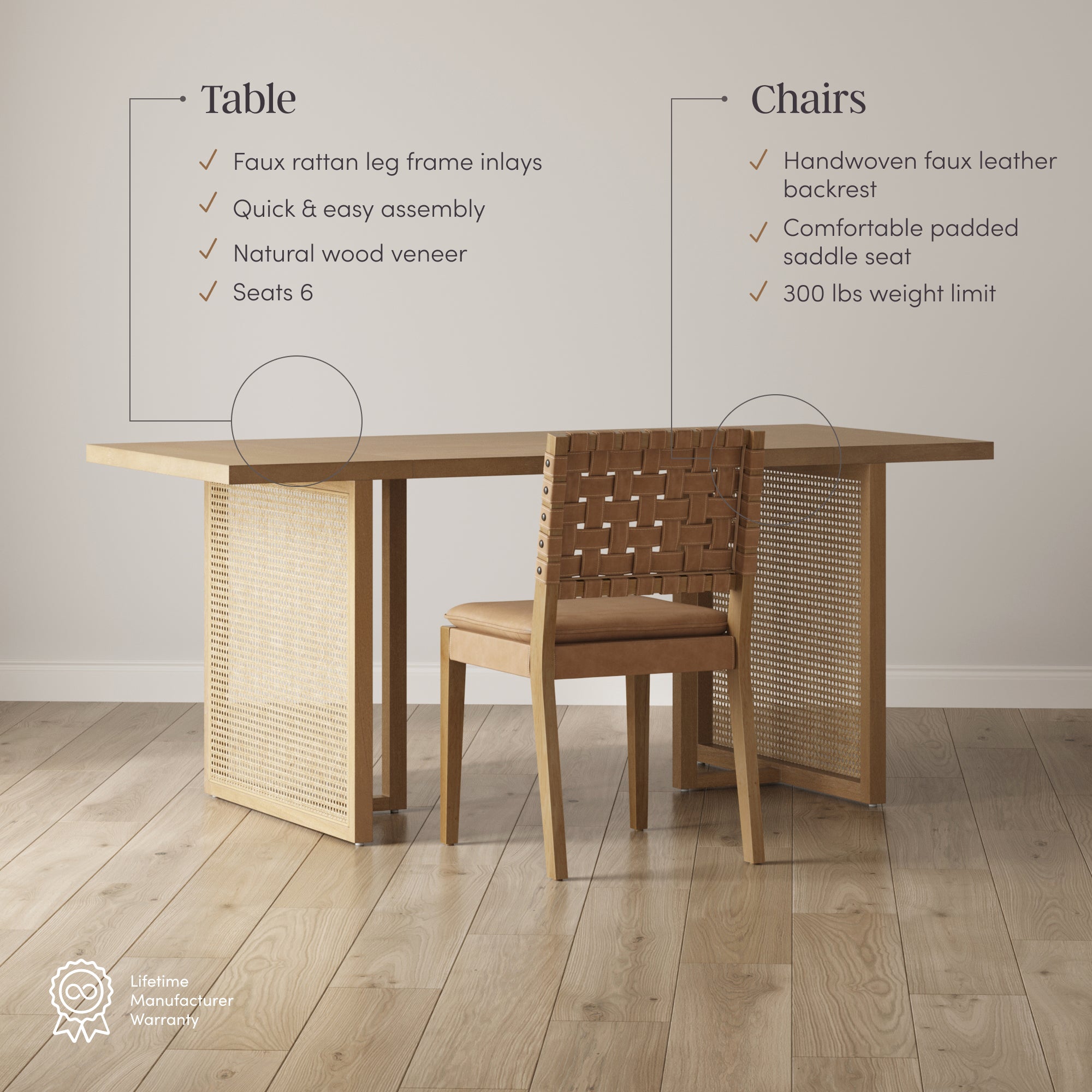 Rattan Boho Dining Table Set of 6 w/ Faux Leather Chairs