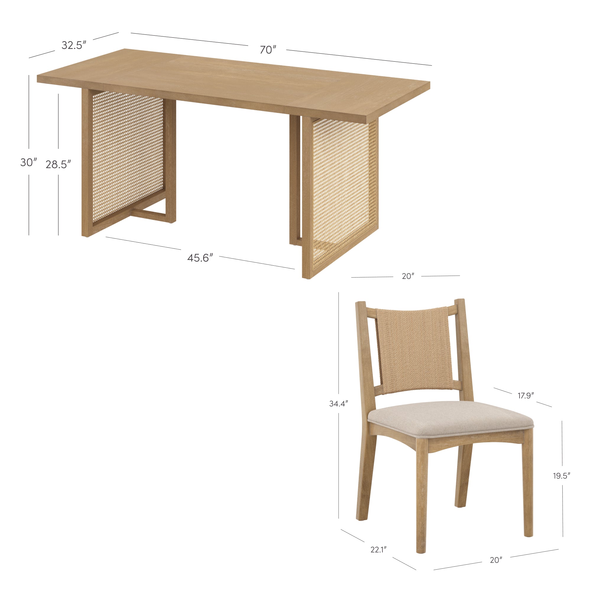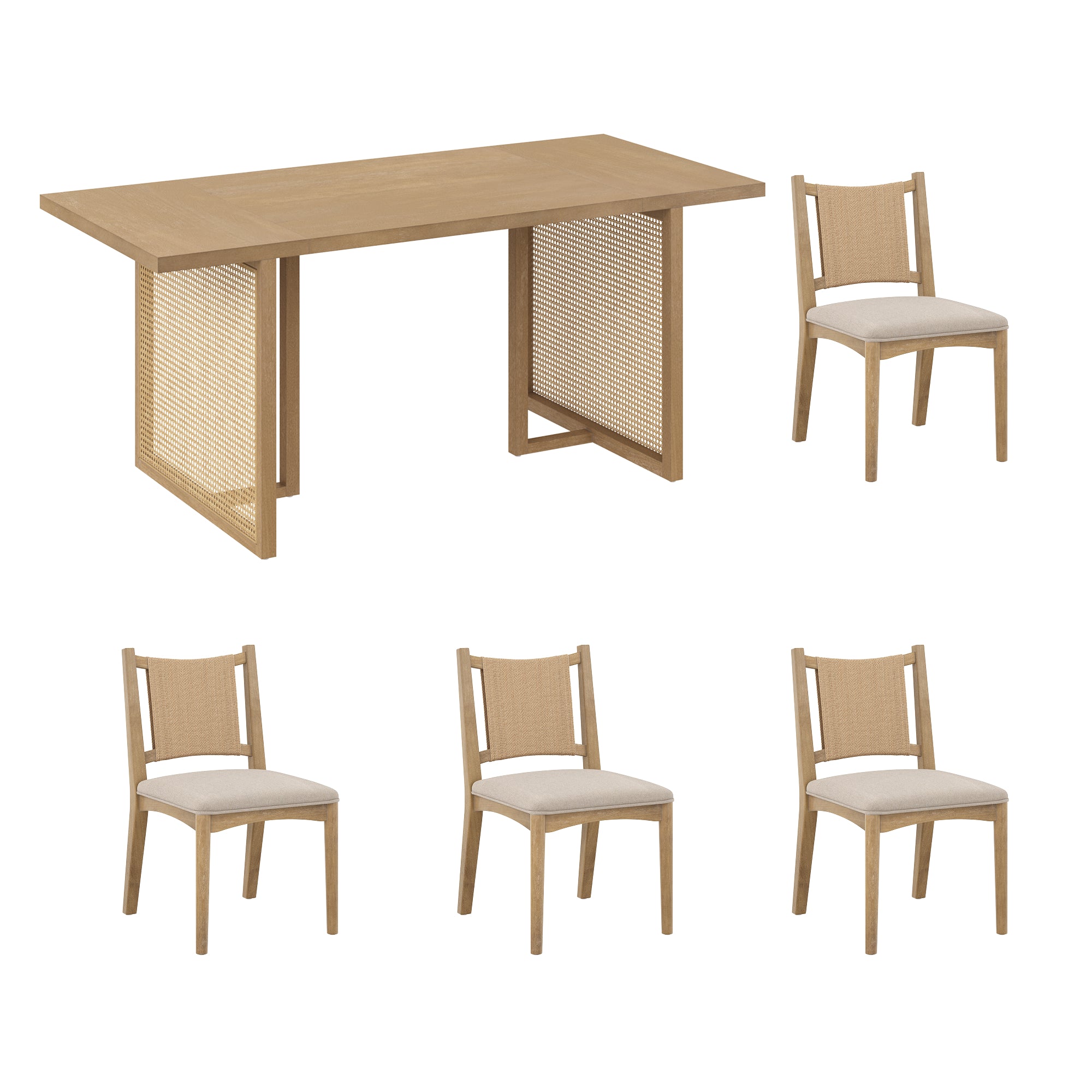 The Elodia Dining Table Set combines easygoing style with everyday durability. Built with a solid wood base and natural texture variations, this table is perfectly sized for more intimate gatherings. Paired with four matching chairs featuring hand-woven faux seagrass backrests and supportive solid wood frames, this set adds a touch of organic warmth to your dining room. Whether hosting or gathering nightly, Willow is made to welcome everyone in comfort and style.